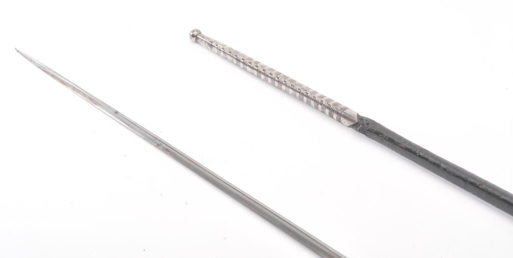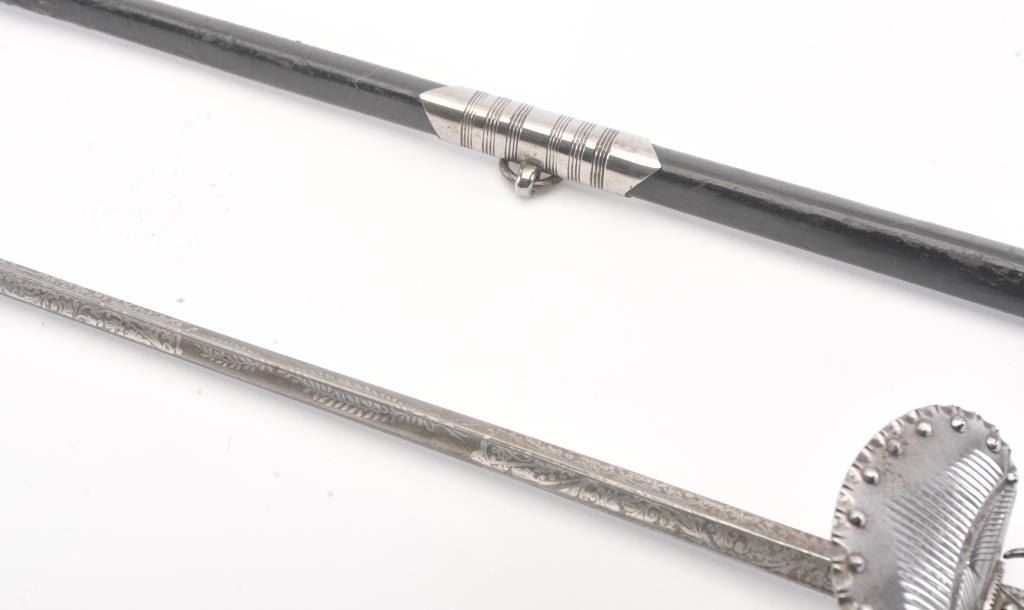 English mourning sword with Epee blade, circa 1880, steel throughout, half guard, etched foliate decoration on all sides of blade, rust developing on handle, electrical tape wrapped around scabbard in two areas, withfaceted steel (simulating jewels). Blade is 31¼” long and the sword is 37¾” long overall. Leather Scabbard. Est.: $400-$800