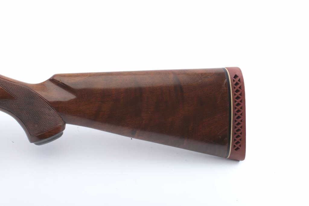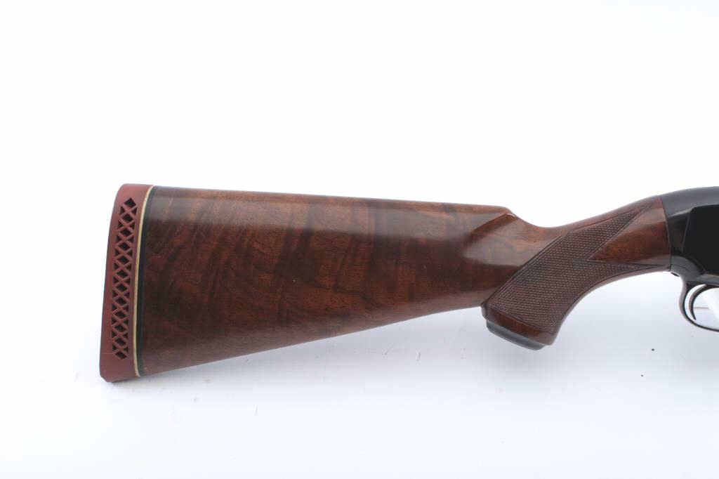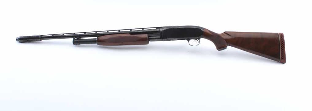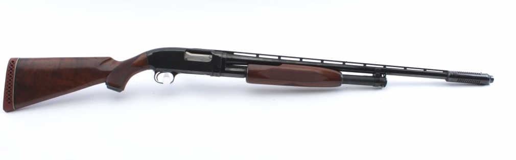 Winchester Model 12 takedown pump action shotgun, 20 gauge, ventilated rib barrel with added Cutt’s compensator, blued finish, checkered wood stocks with finely grained butt stock and added red Pachmayr hard rubber butt pad, S/N 1849861; very good to fine condition overall showing majority of blued finish remaining, bore is very good to fine, crisp action, fine markings and fine wood. (Modern). Est.: $400-$800.