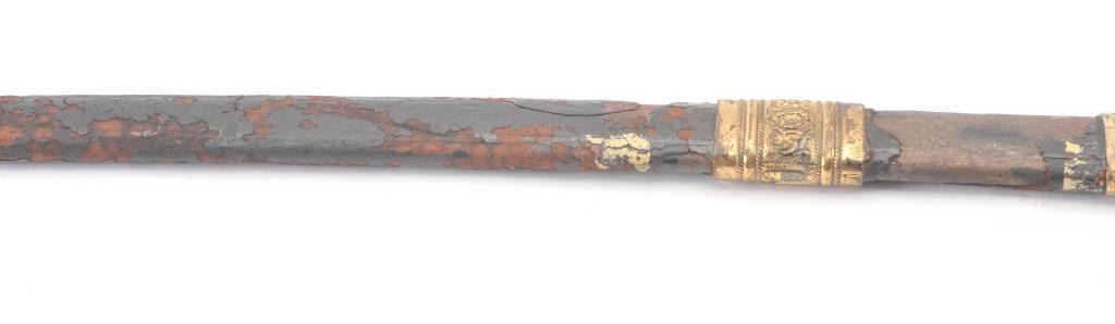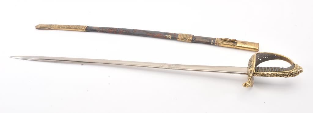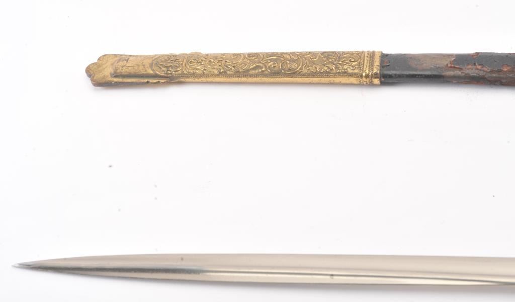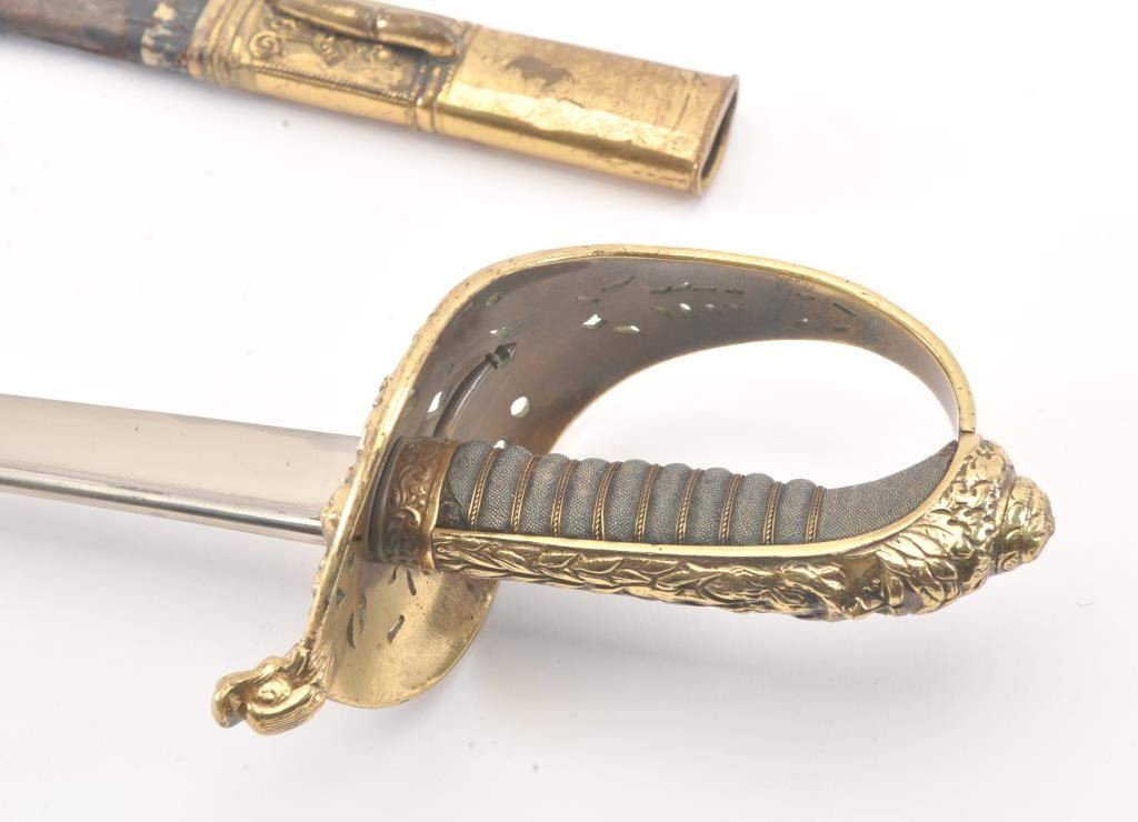 Austrian naval–Neptune saber larger officer's saber, Model 1850 with sword-knot “catch” on ferrule, is stampeded Weyersberg & Co. // Solingen. Mostly plain pipe back blade is 28?” long with false back-edge. The obverseis acid etched with 3¼" H Imperial crowned double headed eagle with shield design. Reverse is etched with 3¼" H Imperial crown and fouled anchor design. Sharkskin grip retains triple wire wrap. D-guard hilt hasthe Neptune relief on back strap. Knuckle guard has Austrian shield, mermaids, and dolphin head quillon. Overall 33½“. Est.: $400-$800