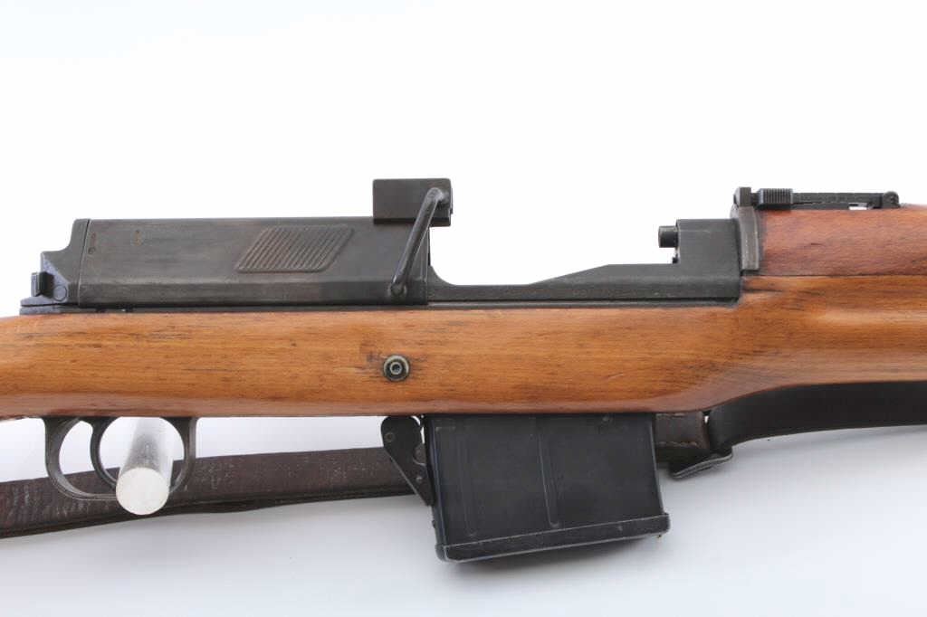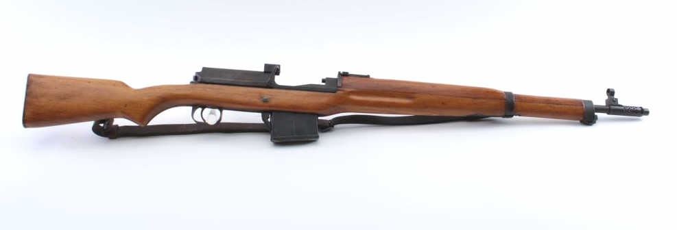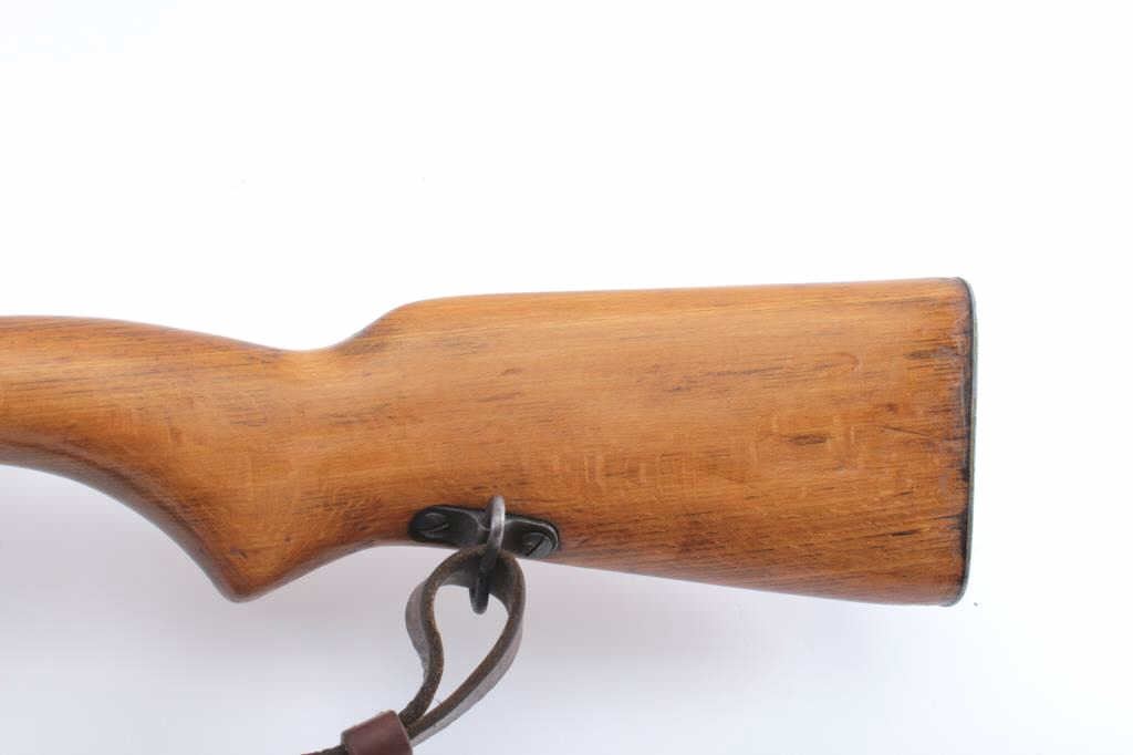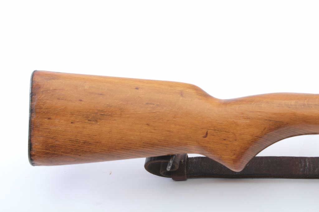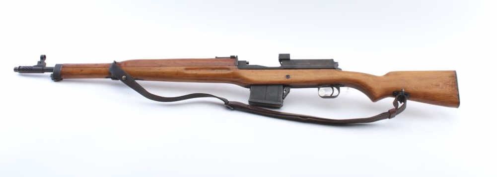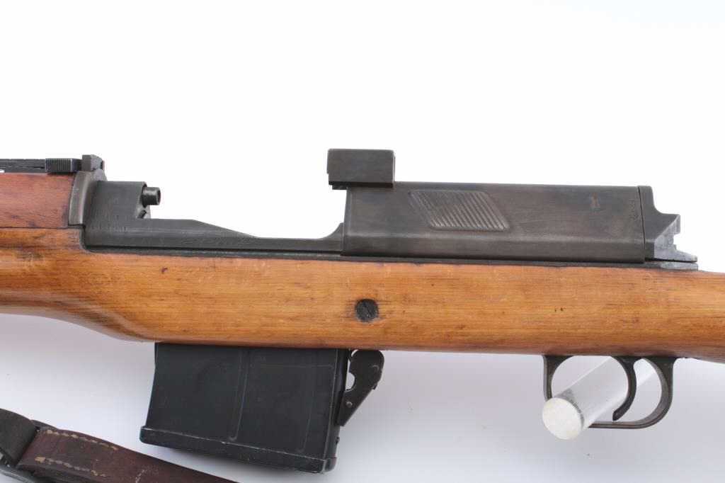 Egyptian Hakim semi-automatic rifle, 8 x 57 caliber, Serial #E191. The rifle is in good overall condition with a 24 ½” import marked barrel including the proprietary muzzle break. The metal surfaces retain asignificant amount of the military finish with a tangent style rear sight. The receiver has Egyptian script on the left side and is marked, Hakim on the right. The smooth wood stock is in good condition withsling swivels and a period leather sling. The butt stock ends with a smooth steel butt plate. The bore is fair, the action is crisp and the markings are sharp. Initially developed in Sweden as the Ag M/42 for theSwedish army, the Hakim’s were manufactured by Egypt during the 1950’s-60’s. The lot includes one correct magazine. Est.: $500-$1,000. (C+R).