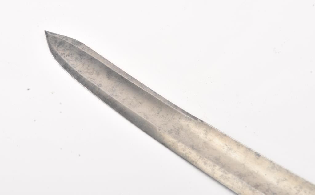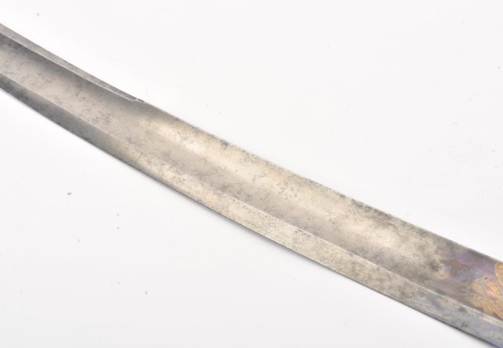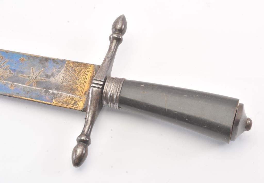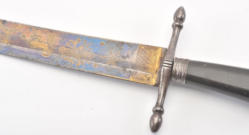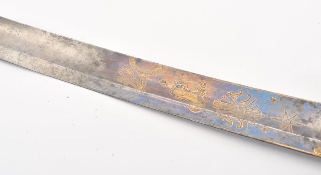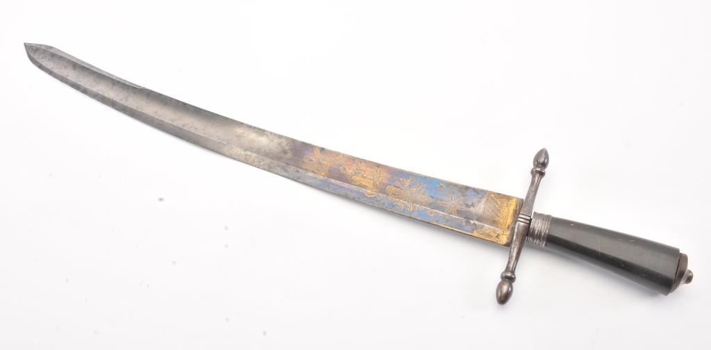 Austrian naval cuttoe circa 1790-1810. Slightly curved blade has single wide full-length fuller and false back edge. One-third of blade is blued with several gilt Talisman etched symbols contained within,including panoply of arms, cannons, flags, Turk’s head, stylized letters, moon and stars. Blade is 22-5/8”. Overall 28” long. Blackened horn grip with steel cross guard, ferrule, and pommel. No scabbard. Est.:$500-$1000