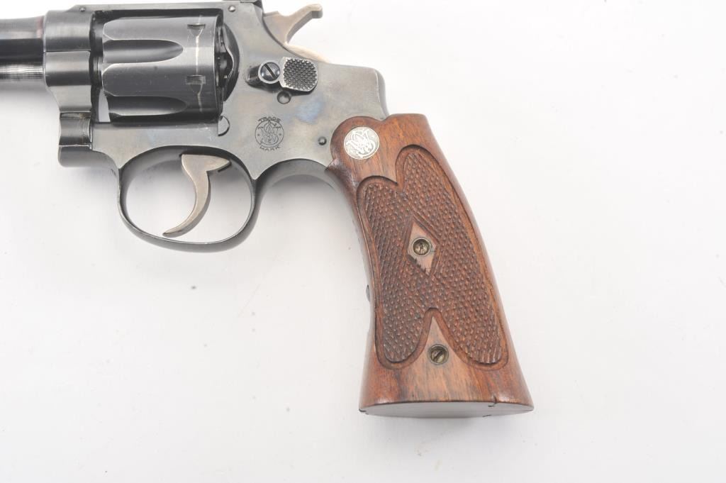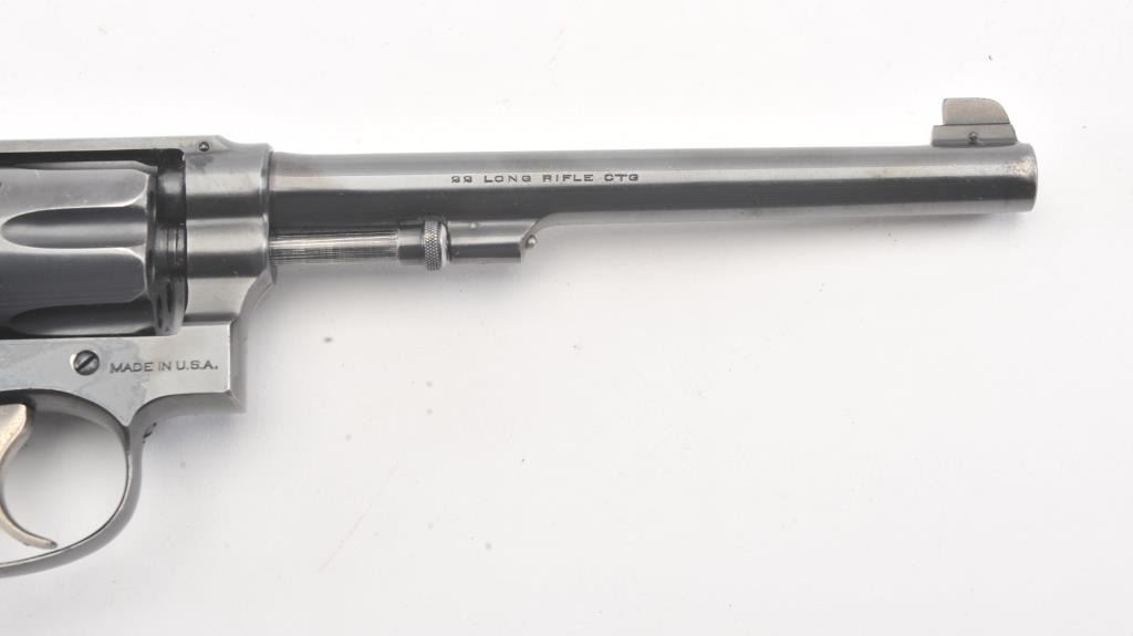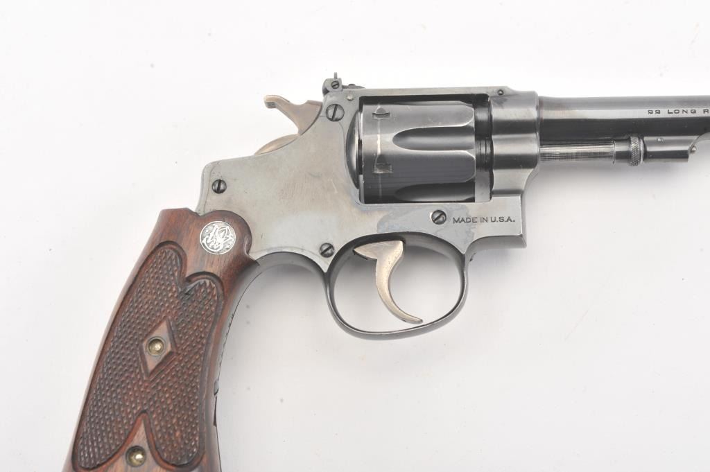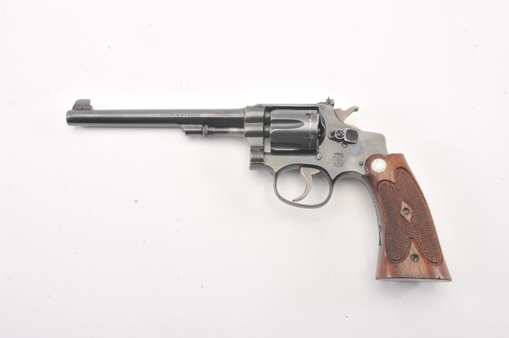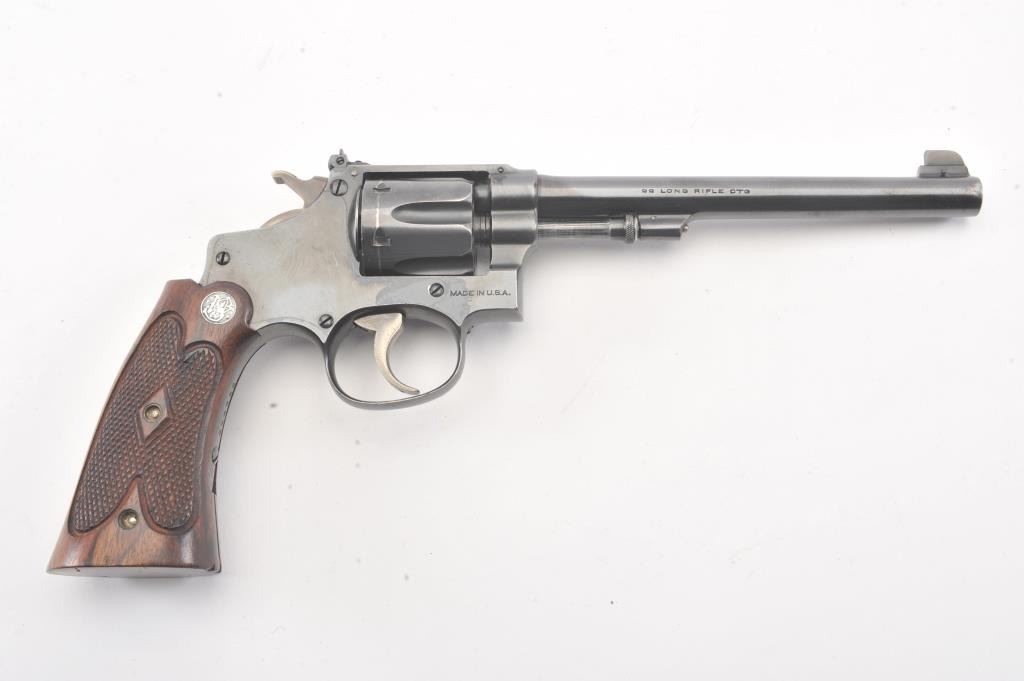 Smith & Wesson Model 22/32 Target double action revolver, .22 Long Rifle caliber, Serial #444686. The pistol is in fine overall condition with a 6” barrel with a blade front and adjustable rear sights. Thepistol retains approximately 90% of the blue finish with wear at the muzzle and an index line on the cylinder. The checkered wood medallion extended grips are in very good condition with sharp checkering. The bore is good, the action is crisp and the markings are sharp on this desirable Bekeart style revolver. Est.: $500-$1,000. (C+R).