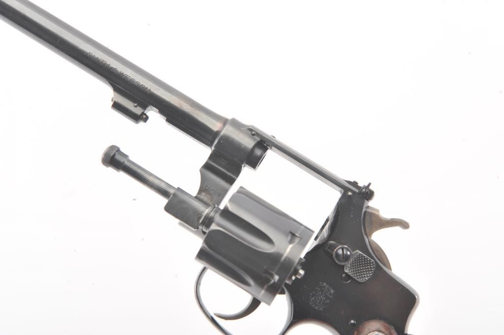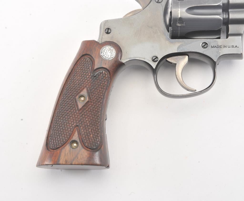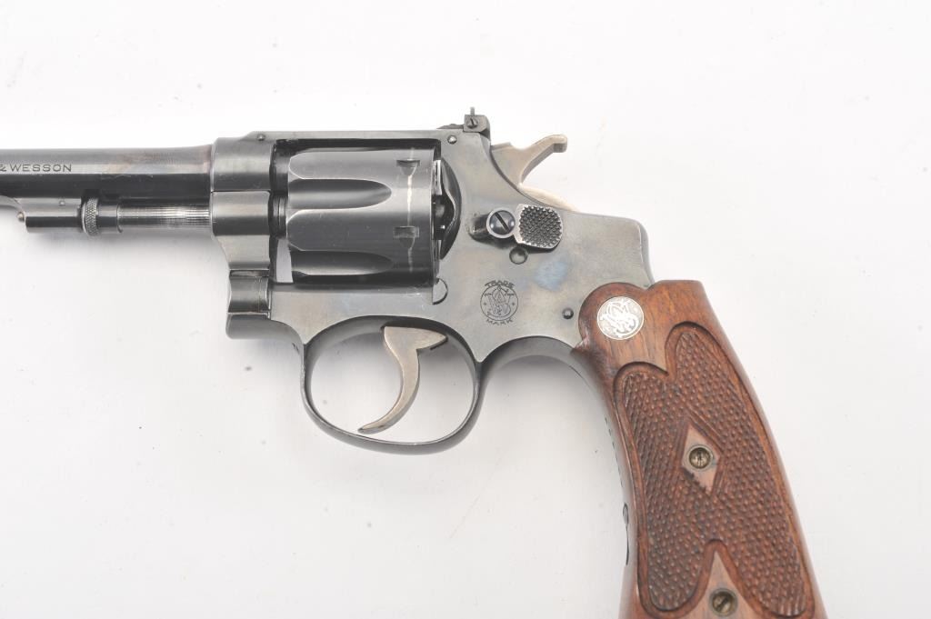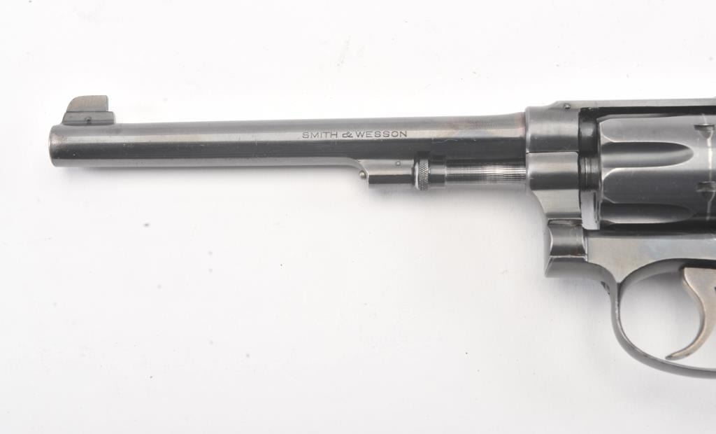 Smith & Wesson Model 22/32 Target double action revolver, .22 Long Rifle caliber, Serial #444686. The pistol is in fine overall condition with a 6” barrel with a blade front and adjustable rear sights. Thepistol retains approximately 90% of the blue finish with wear at the muzzle and an index line on the cylinder. The checkered wood medallion extended grips are in very good condition with sharp checkering. The bore is good, the action is crisp and the markings are sharp on this desirable Bekeart style revolver. Est.: $500-$1,000. (C+R).