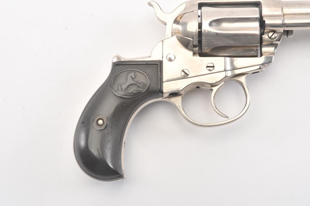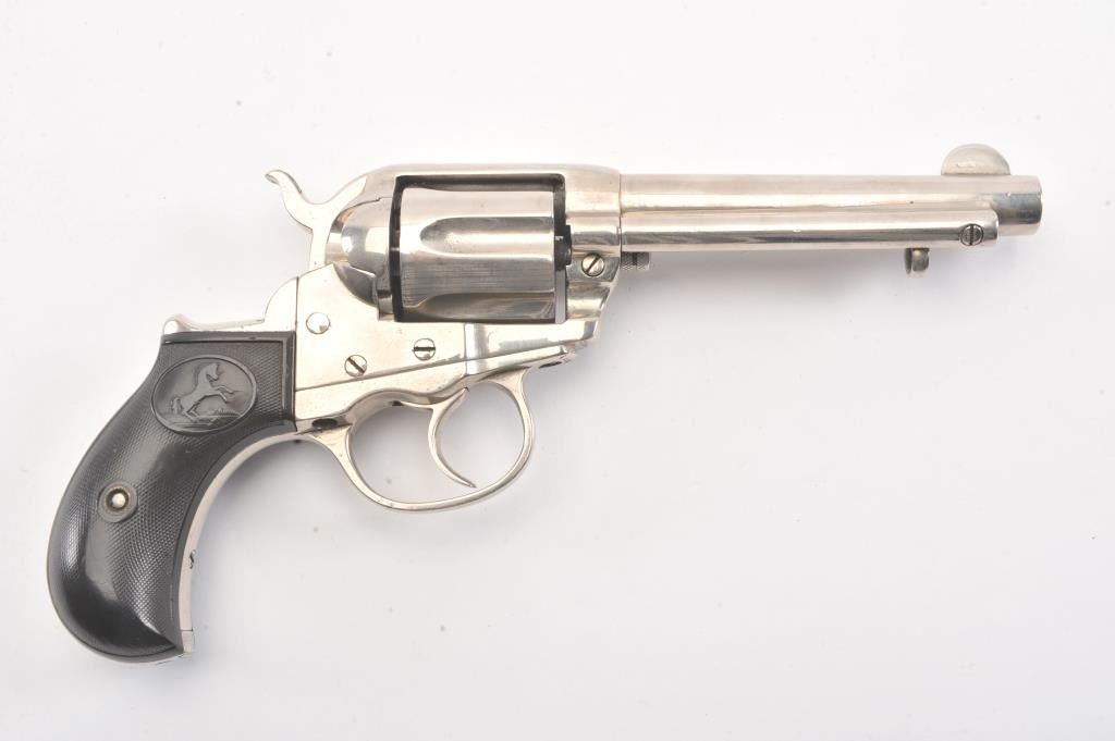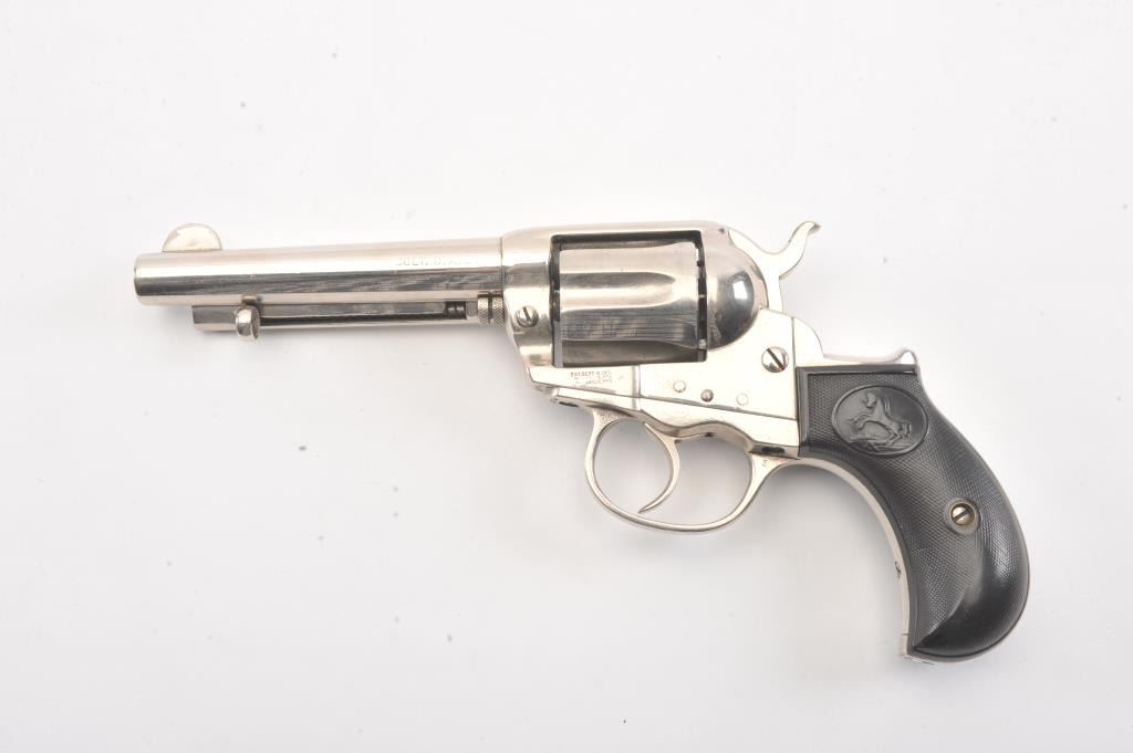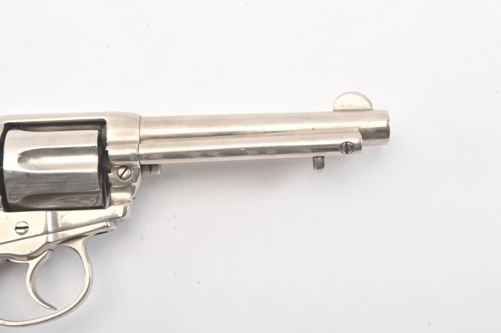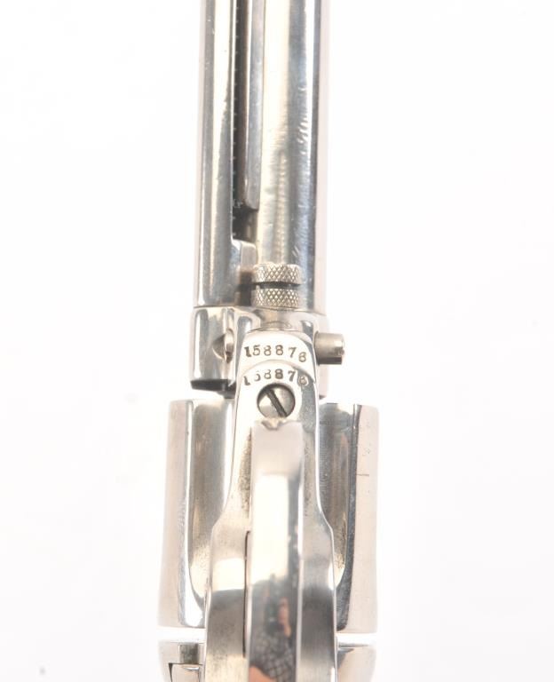 1877 Colt Lightning double action revolver, .38 caliber, Serial #158876. The pistol is in fine overall condition as re-finished. The pistol has been professionally re-nickeled. The barrel is 4 ½” in lengthwith the front sight still full height. The checkered hard rubber grips are in very good condition. The action is functioning well at the time of description. The bore is fair, the action functions and the markings arelegible. Est.: $400-$800. (C+R).