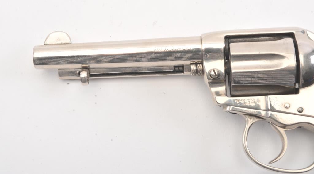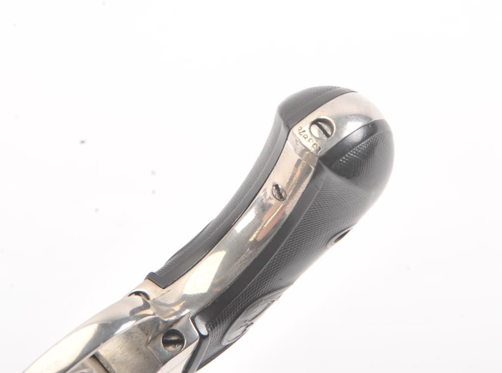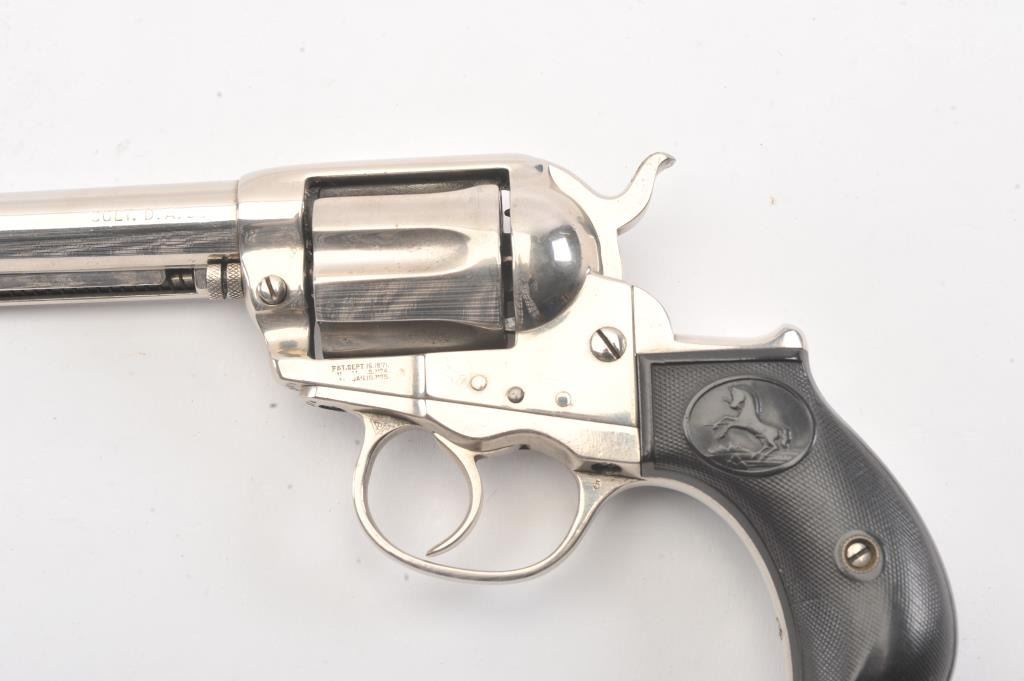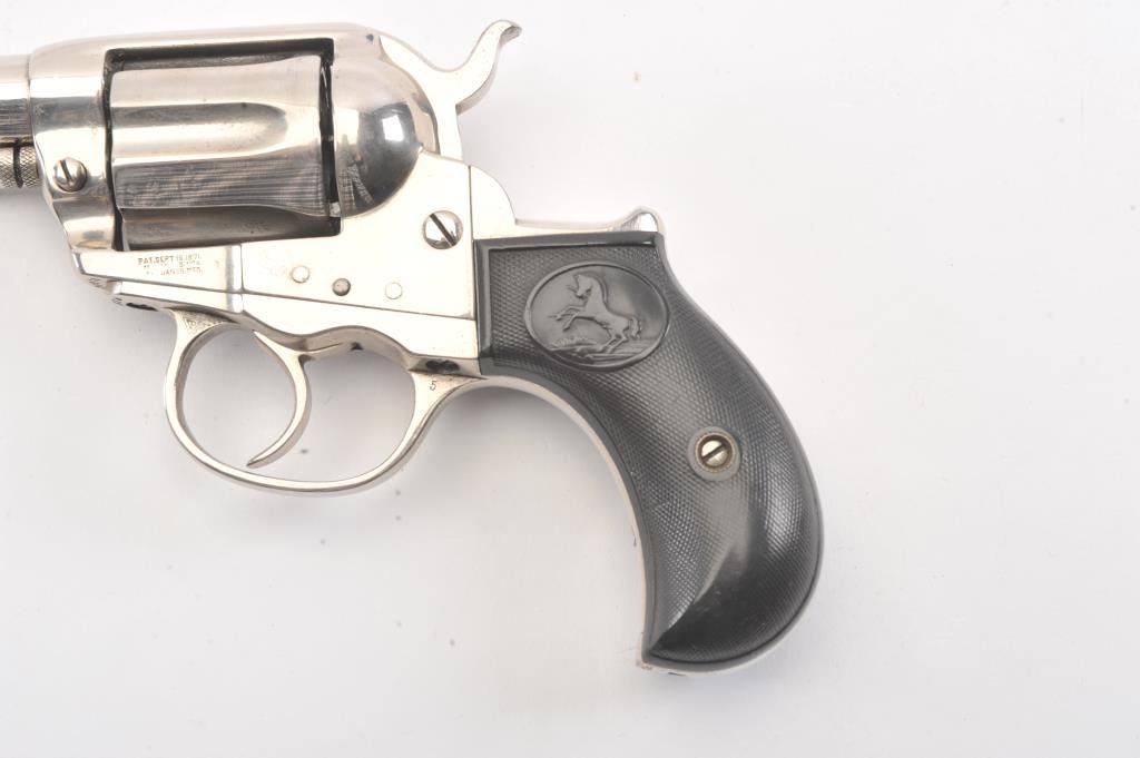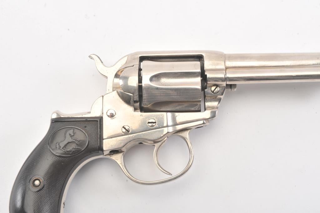1877 Colt Lightning double action revolver, .38 caliber, Serial #158876. The pistol is in fine overall condition as re-finished. The pistol has been professionally re-nickeled. The barrel is 4 ½” in lengthwith the front sight still full height. The checkered hard rubber grips are in very good condition. The action is functioning well at the time of description. The bore is fair, the action functions and the markings arelegible. Est.: $400-$800. (C+R).