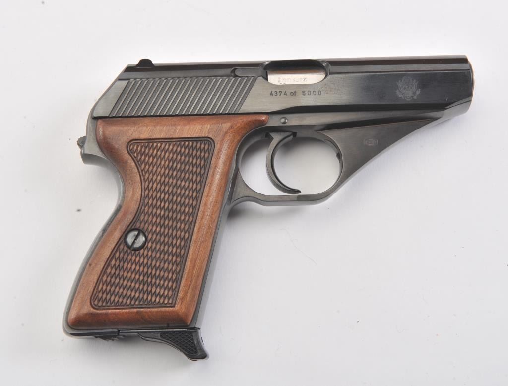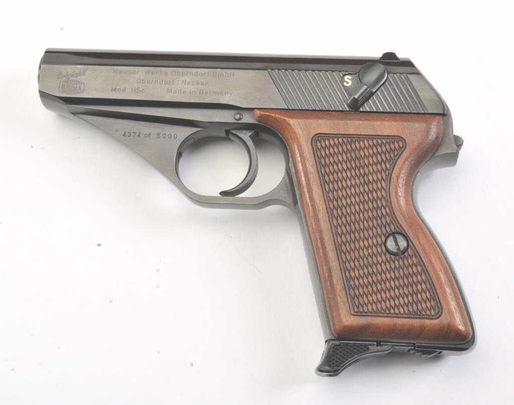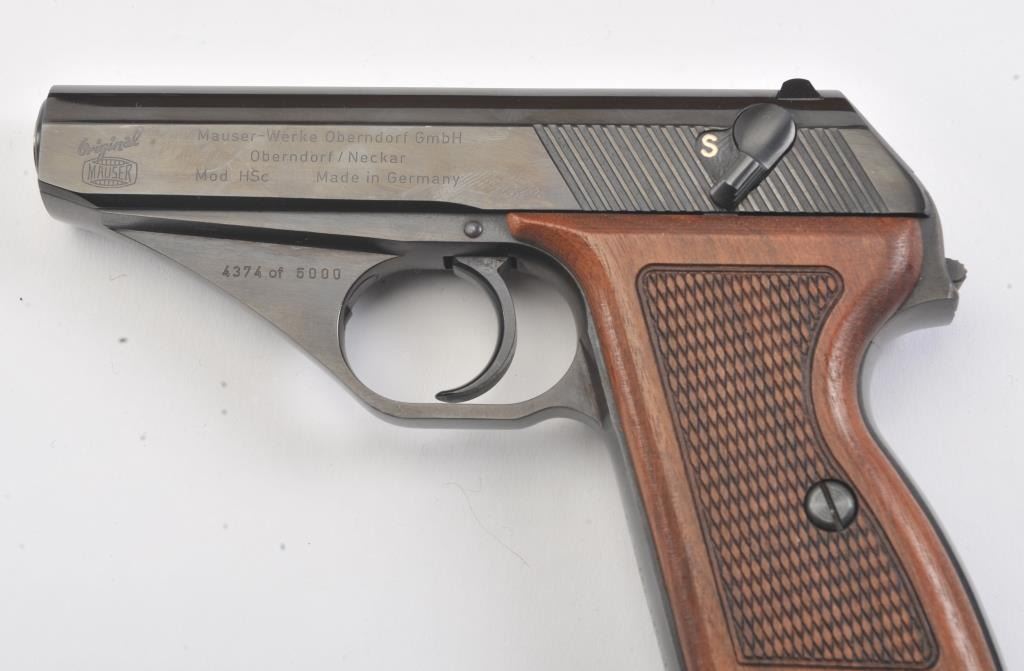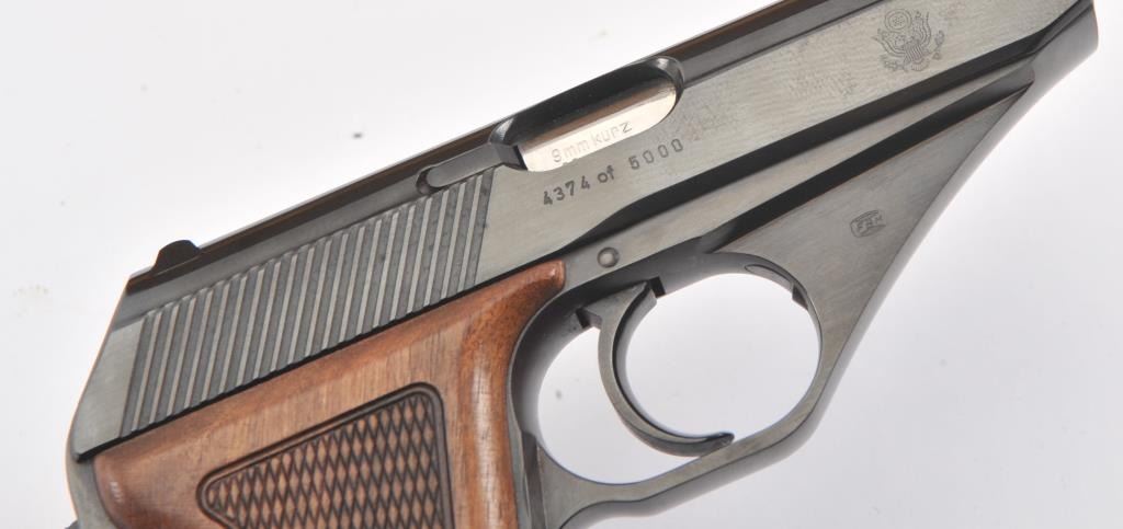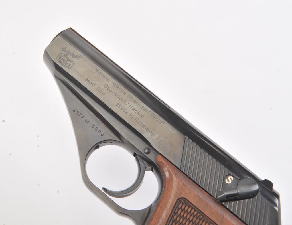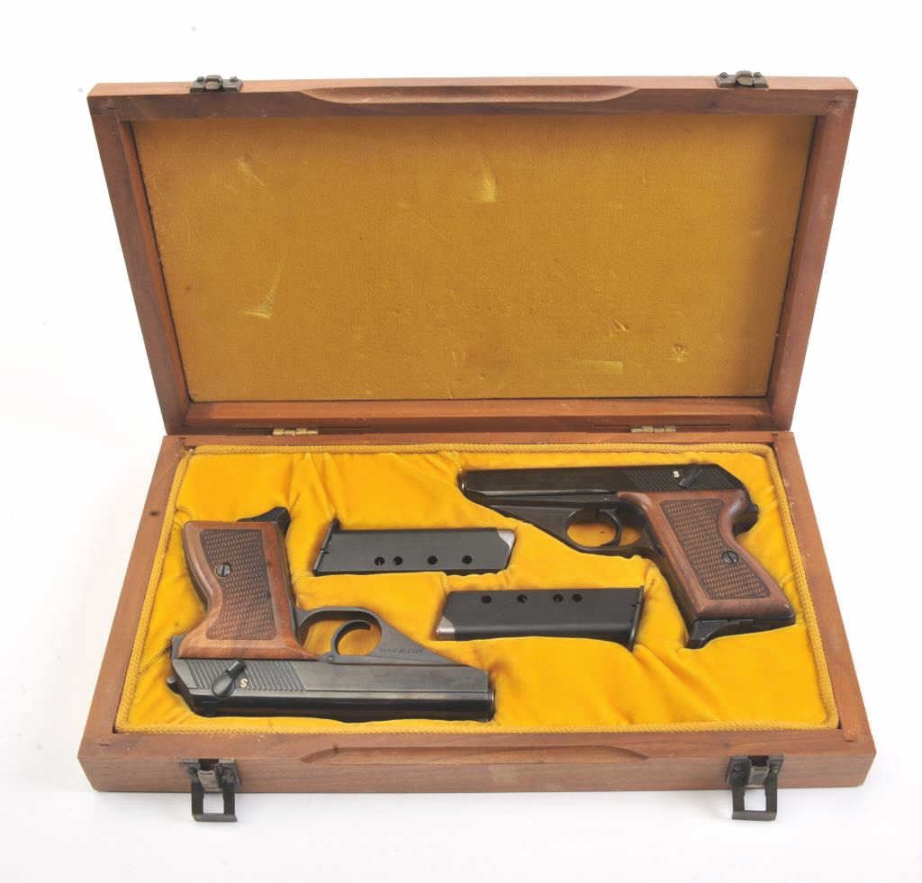 HSC American Eagle Edition 1 of 5000 cased pair of consecutively numbered Mauser HSc .380 caliber semi-automatic pistols. The lot includes #4373 and #4374 in a wooden presentation case with gold velvet interior. The Oberndorf marked pistols are both in excellent condition with the Mauser banner on the left side and American Eagle on the right, marked made in Germany. The checkered wood grips are also in excellent conditionshowing little use and the pistol is import marked on the grip strap. The lot includes four correct, Mauser marked magazines. The wooden presentation case is in good condition with mars and scratches and a small lateralcrack in the lid. Est.: $1,250-$2,500. (Modern/PPT).