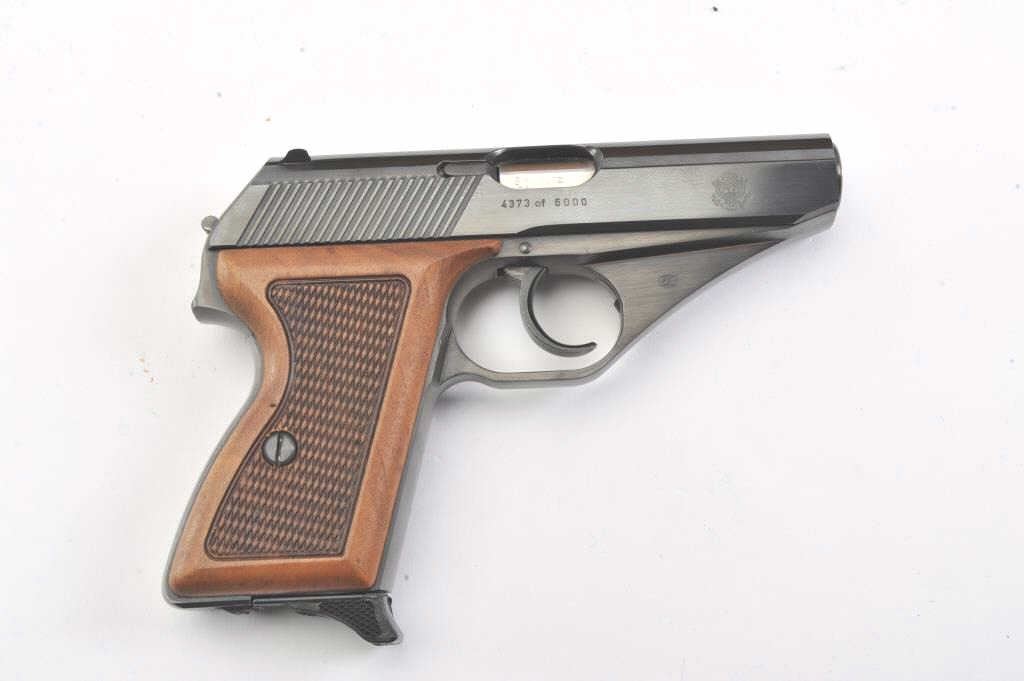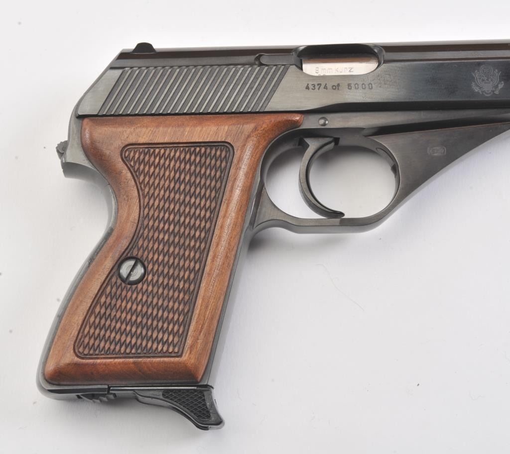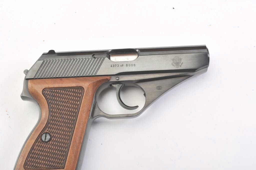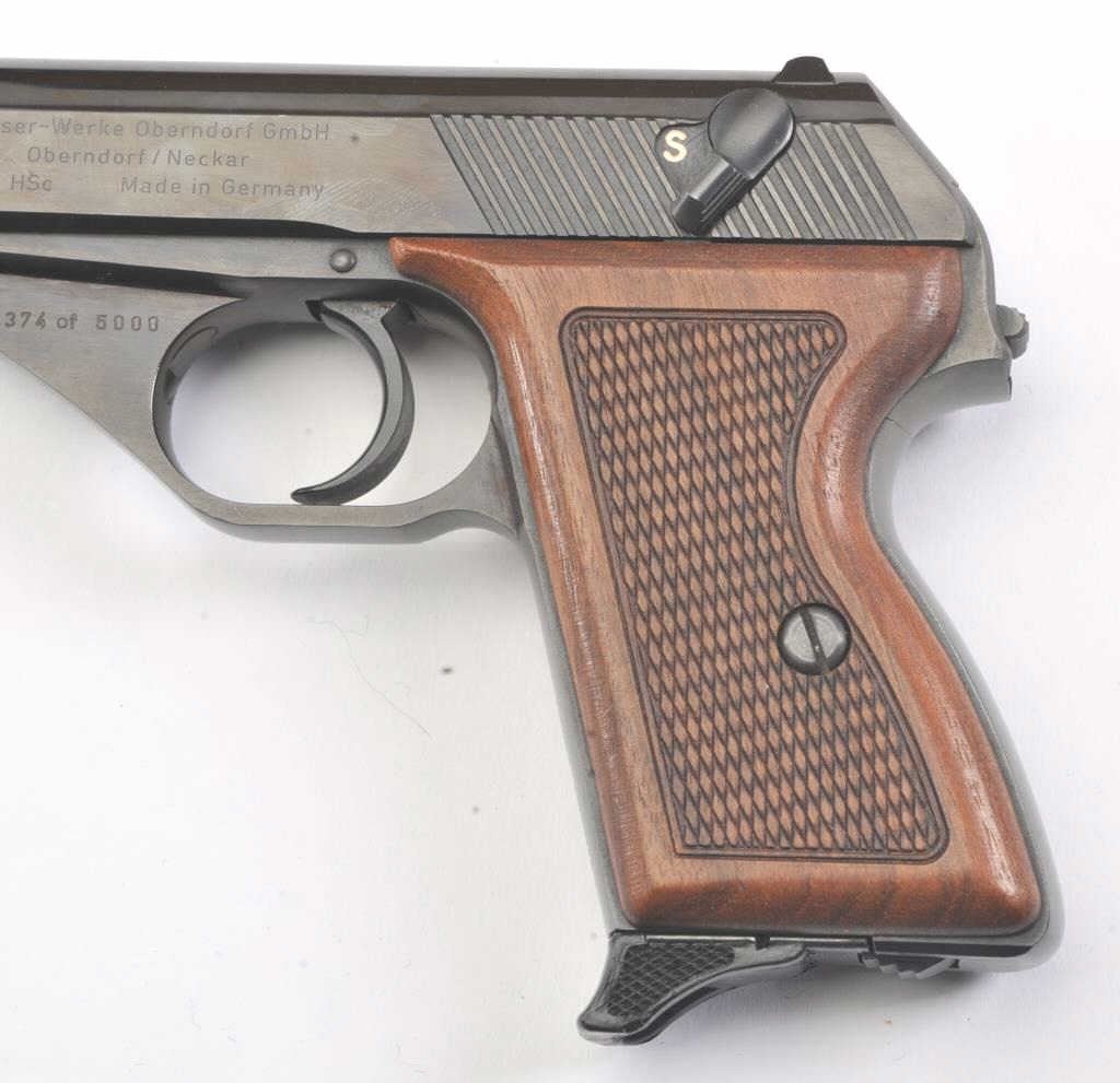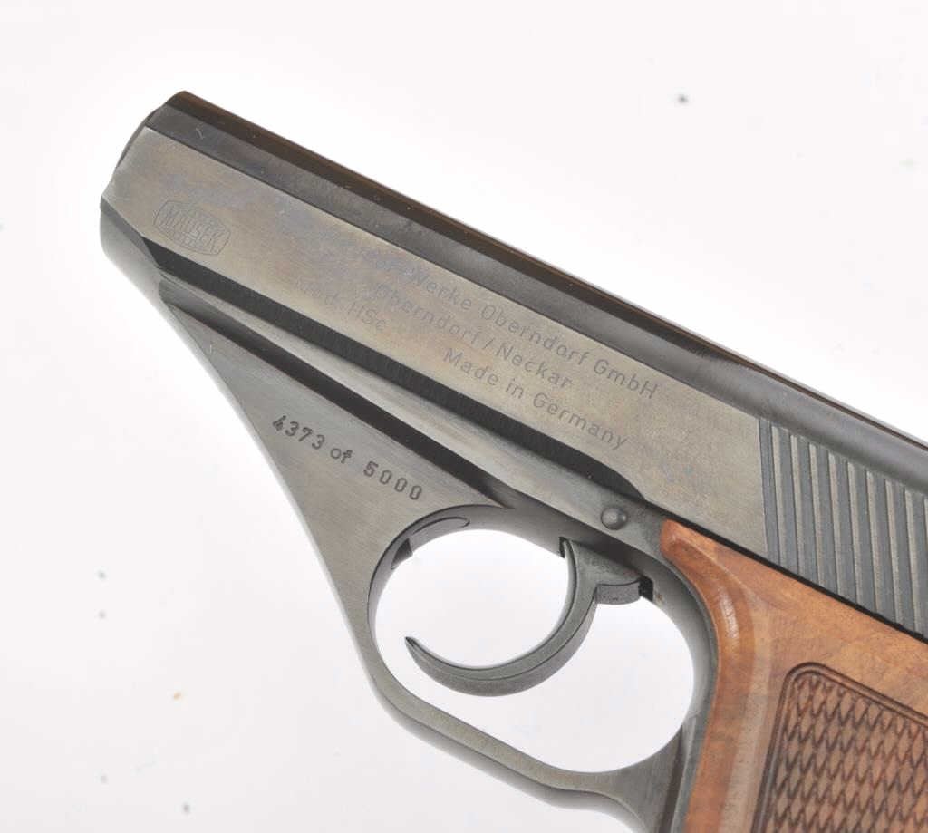 HSC American Eagle Edition 1 of 5000 cased pair of consecutively numbered Mauser HSc .380 caliber semi-automatic pistols. The lot includes #4373 and #4374 in a wooden presentation case with gold velvet interior. The Oberndorf marked pistols are both in excellent condition with the Mauser banner on the left side and American Eagle on the right, marked made in Germany. The checkered wood grips are also in excellent conditionshowing little use and the pistol is import marked on the grip strap. The lot includes four correct, Mauser marked magazines. The wooden presentation case is in good condition with mars and scratches and a small lateralcrack in the lid. Est.: $1,250-$2,500. (Modern/PPT).