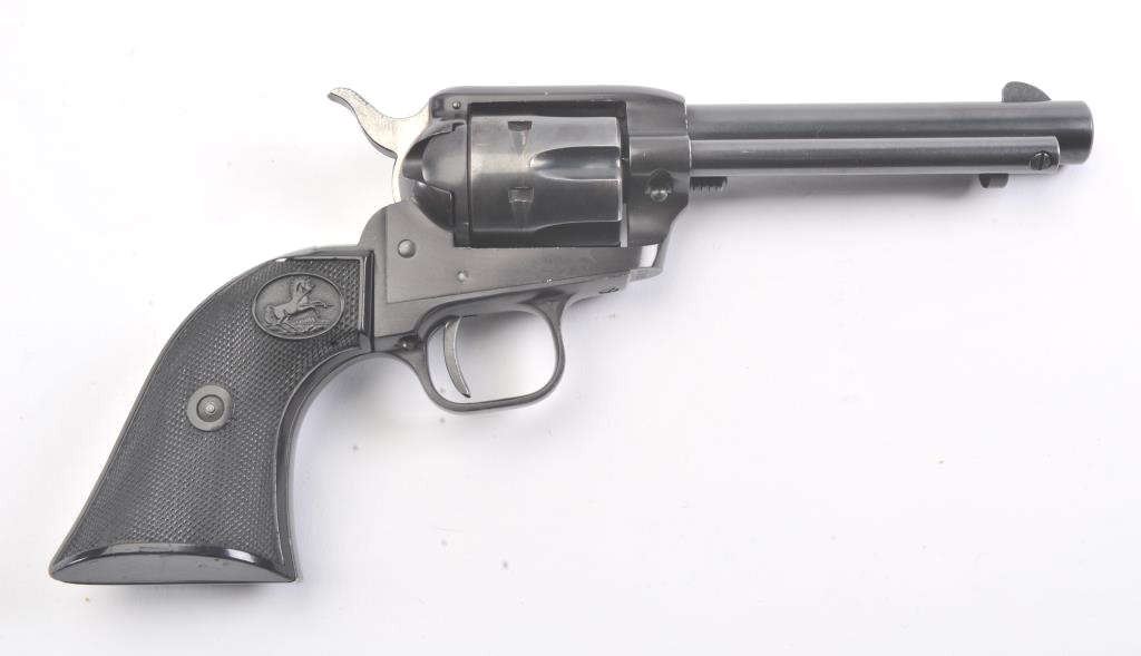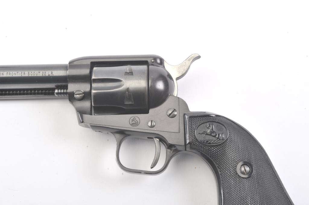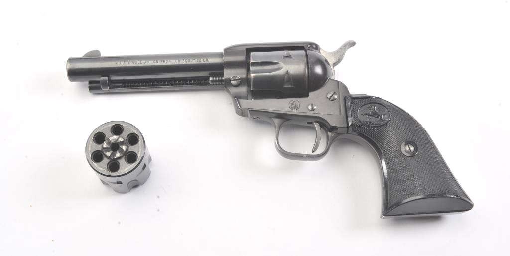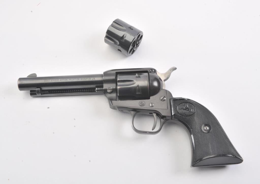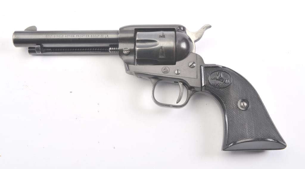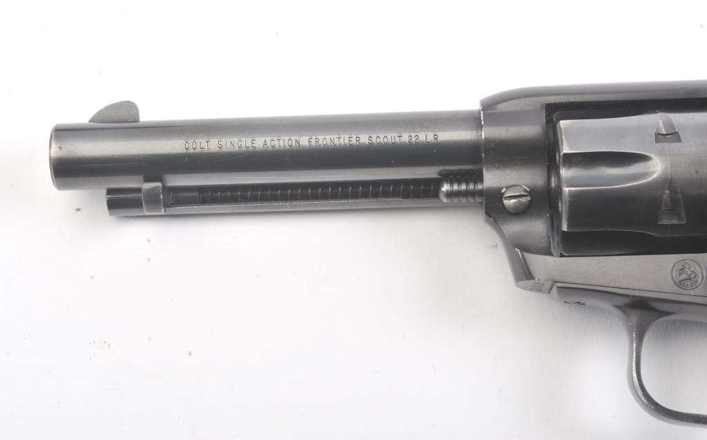 Colt Frontier Scout single action revolver, .22 LR caliber, Serial #107418F. The pistol is in fine overall condition with a 4 ¾” barrel. The pistol retains nearly all the blue finish with light handling marks. Thecheckered plastic grips are in very good condition showing little use. The bore is good, the action is crisp and the markings are sharp. The lot includes a 2nd cylinder in .22 Magnum. Est.: $300-$600.(Modern/PPT).