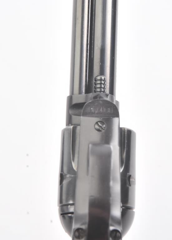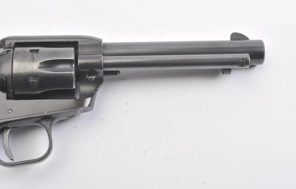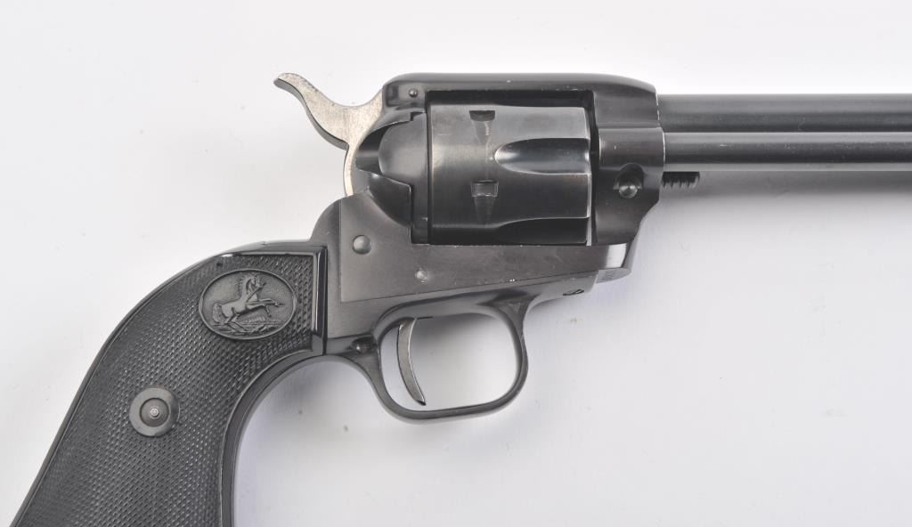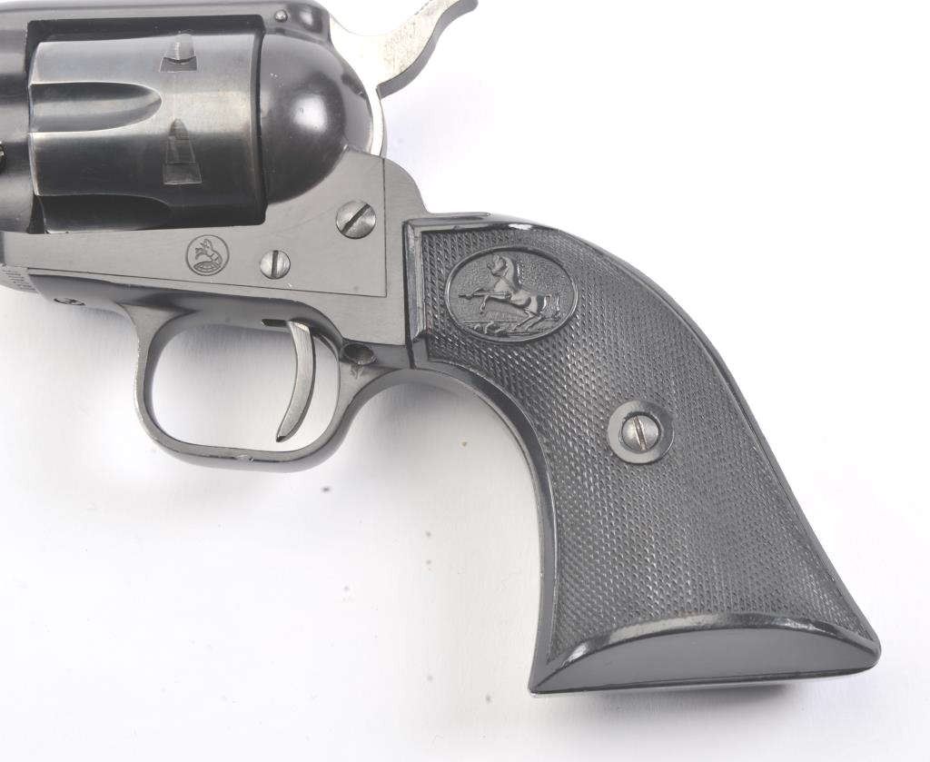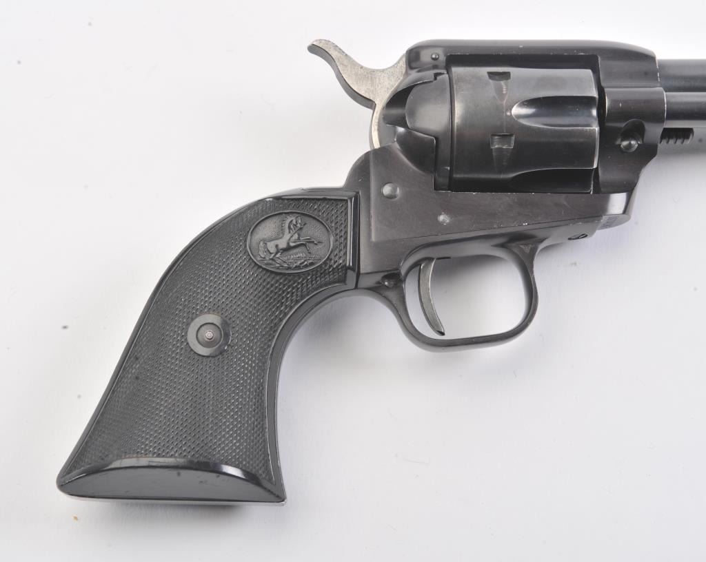 Colt Frontier Scout single action revolver, .22 LR caliber, Serial #107418F. The pistol is in fine overall condition with a 4 ¾” barrel. The pistol retains nearly all the blue finish with light handling marks. Thecheckered plastic grips are in very good condition showing little use. The bore is good, the action is crisp and the markings are sharp. The lot includes a 2nd cylinder in .22 Magnum. Est.: $300-$600.(Modern/PPT).
