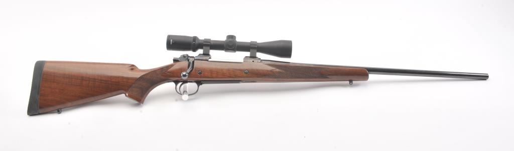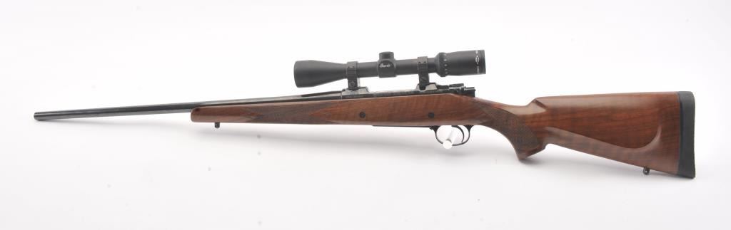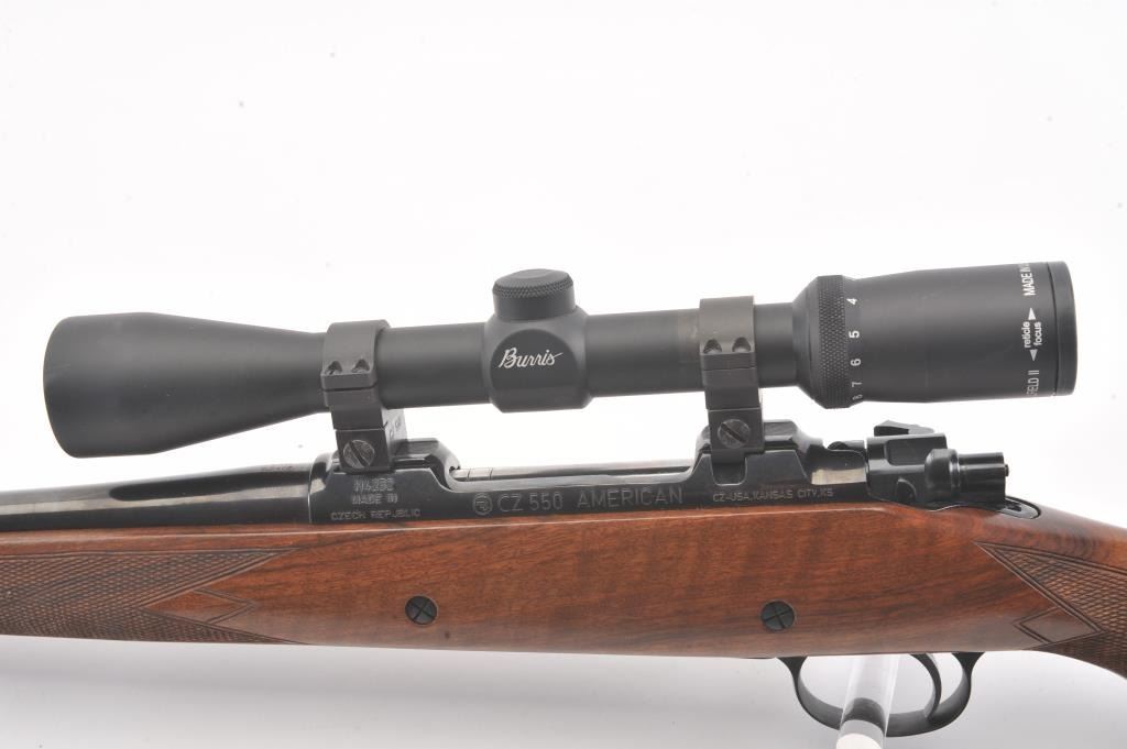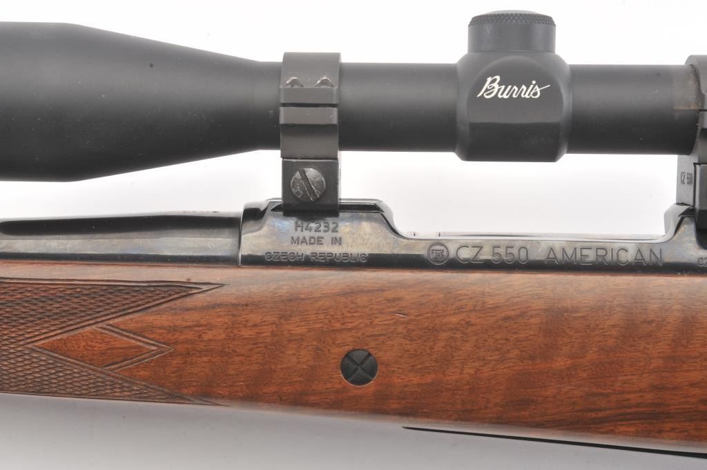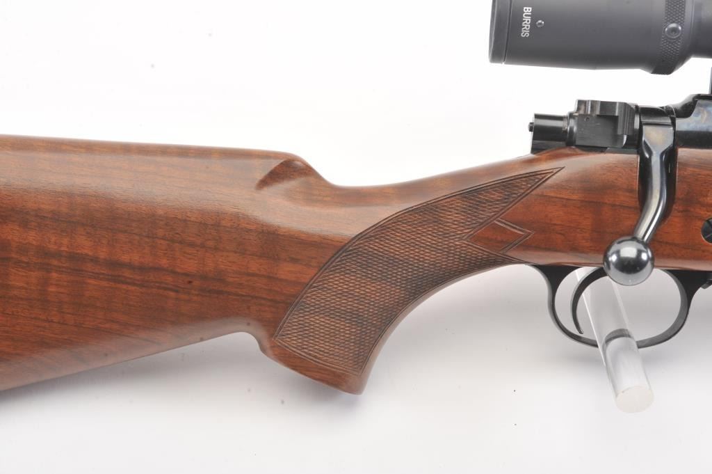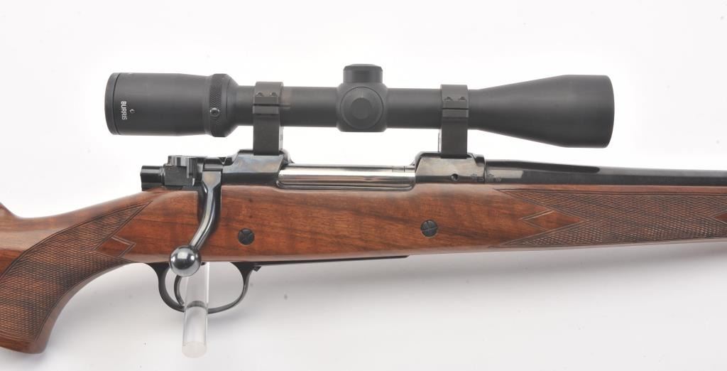 Custom CZ 550 American bolt action rifle, 9.3 x 64 caliber, Serial #H4232. The rifle is in minty overall condition with a 24” barrel. The metal surfaces retain nearly all the gloss blue finish with only light handlingmarks. The rifle has had a professional trigger job and a custom, Ed LaPour three-position safety added. The finely checkered Walnut stock is in excellent condition with sharp checkering and two cross bolts added in order to mitigate recoil. The butt stock ends with a solid “Decelerator” pad providing a 13 ¾” LOP. The rifle is topped with a Burris 3 x 9 x 40 variable power scope marked, “MADE IN U.S.A.” with clear, crisp optics. The 9.3 x 64 Brenneke cartridge is considered the European equivalent of the .375 H&H and is the ballistic equal when loaded with a 286 grain bullet. Popular in Africa, brass and diesare readily available. Est.: $600-$1,200. (Modern).