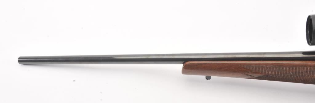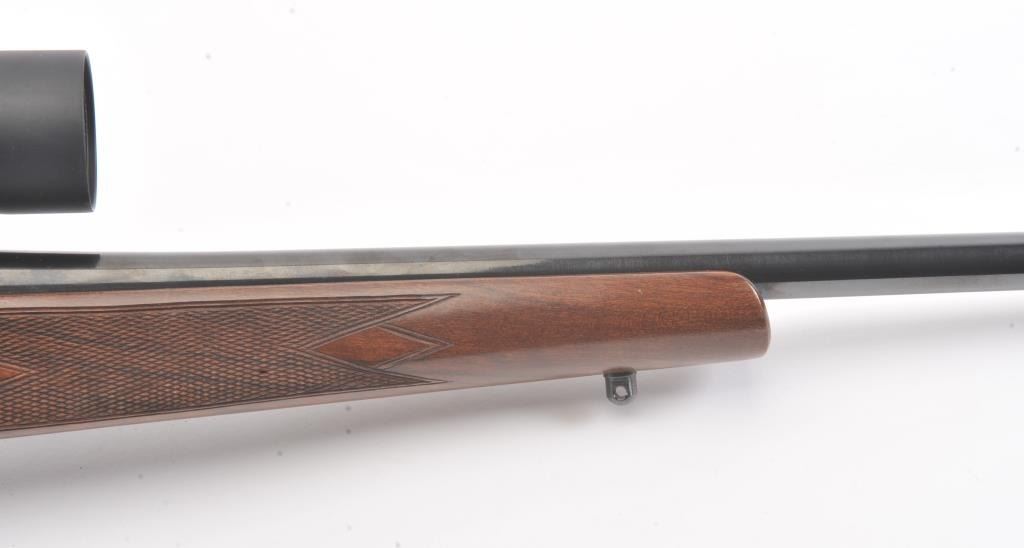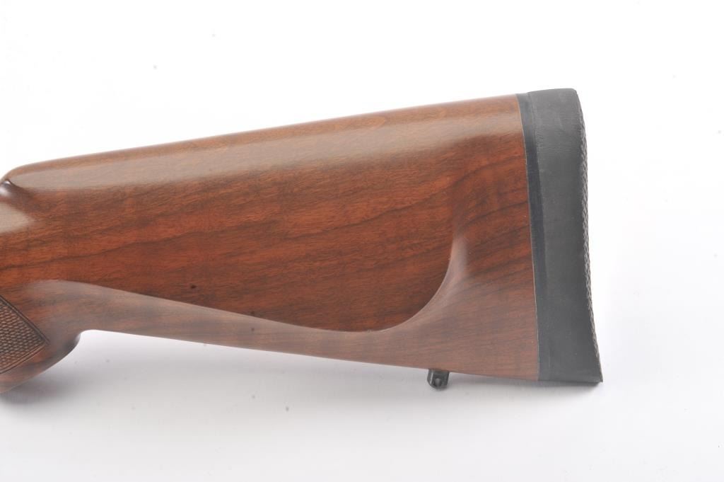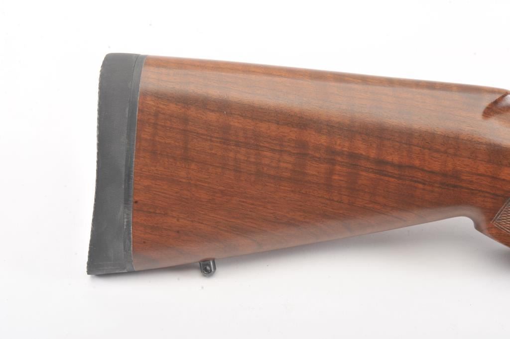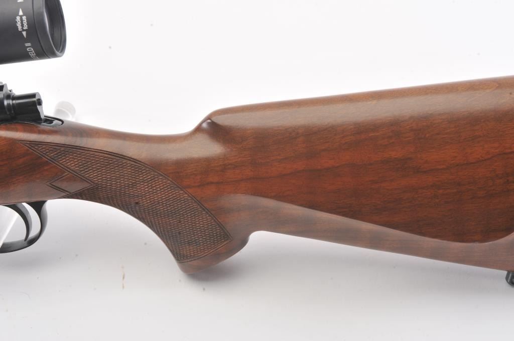 Custom CZ 550 American bolt action rifle, 9.3 x 64 caliber, Serial #H4232. The rifle is in minty overall condition with a 24” barrel. The metal surfaces retain nearly all the gloss blue finish with only light handlingmarks. The rifle has had a professional trigger job and a custom, Ed LaPour three-position safety added. The finely checkered Walnut stock is in excellent condition with sharp checkering and two cross bolts added in order to mitigate recoil. The butt stock ends with a solid “Decelerator” pad providing a 13 ¾” LOP. The rifle is topped with a Burris 3 x 9 x 40 variable power scope marked, “MADE IN U.S.A.” with clear, crisp optics. The 9.3 x 64 Brenneke cartridge is considered the European equivalent of the .375 H&H and is the ballistic equal when loaded with a 286 grain bullet. Popular in Africa, brass and diesare readily available. Est.: $600-$1,200. (Modern).