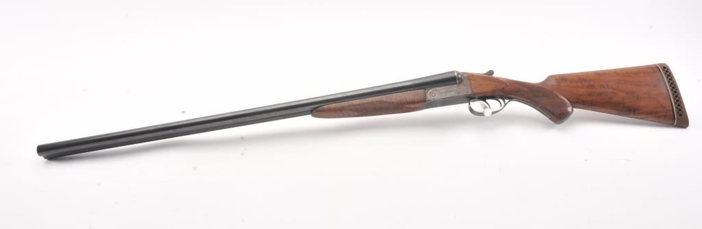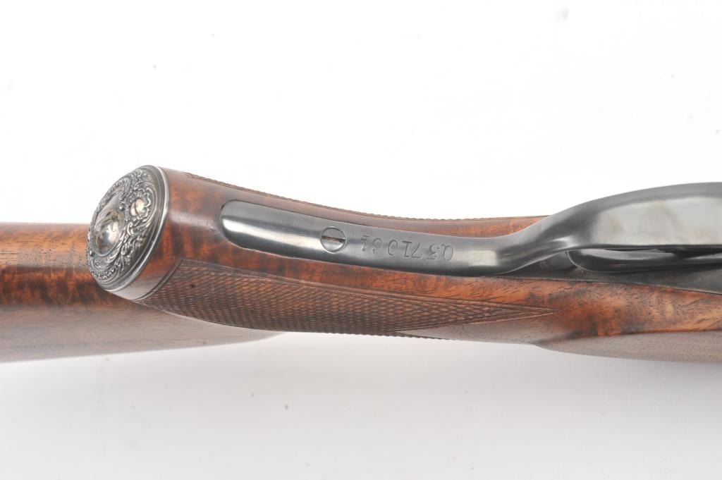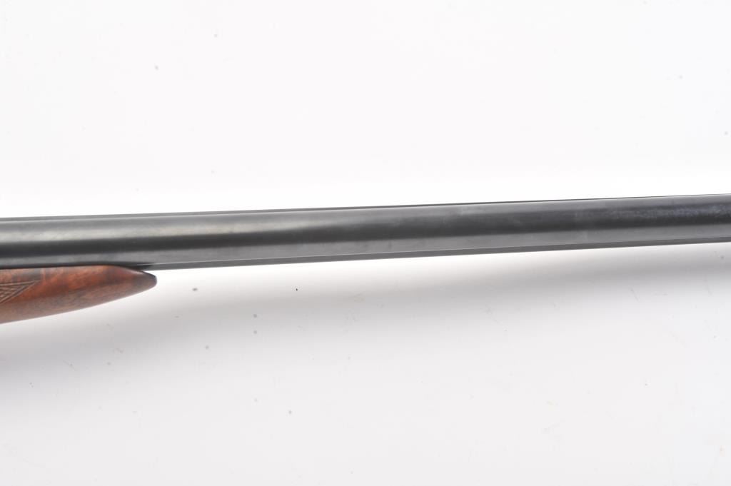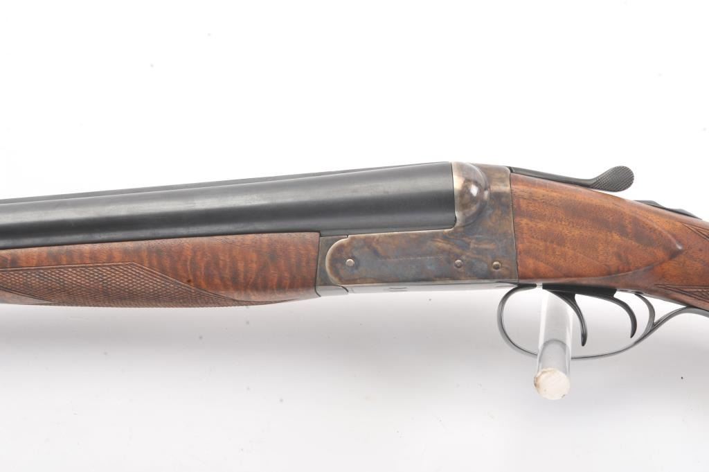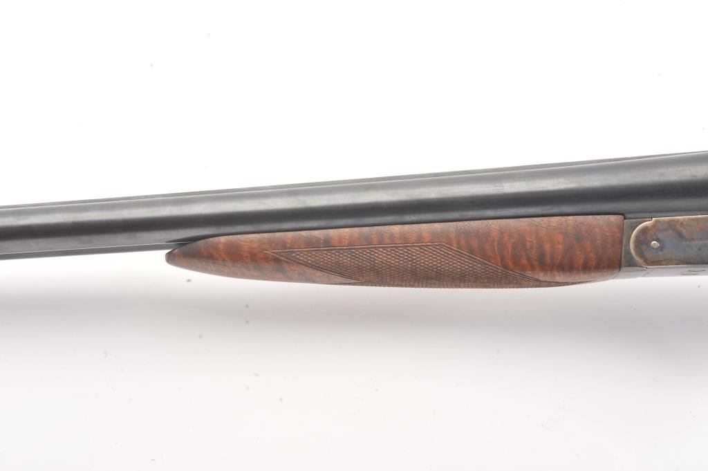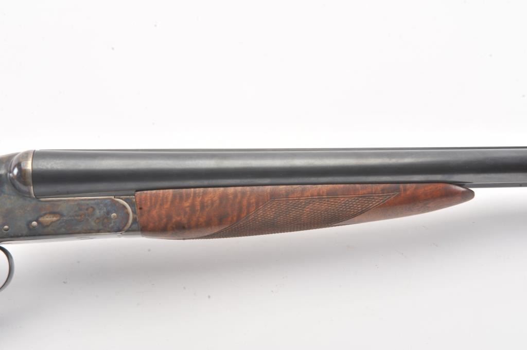 Remington SxS hammerless shotgun, 12 gauge, auto ejectors, 30” barrels, blued and case hardened finish, checkered wood stocks with nice graining, monogrammed silver semi-pistol grip cap and White Line hard rubber buttpad, S/N Q371064; overall very good to fine condition showing majority of blued finish to barrels and majority of case colors to receiver; fine bores, crisp actions, sharp markings and fine wood stocks. (Modern). Est.: $500-$1,000.