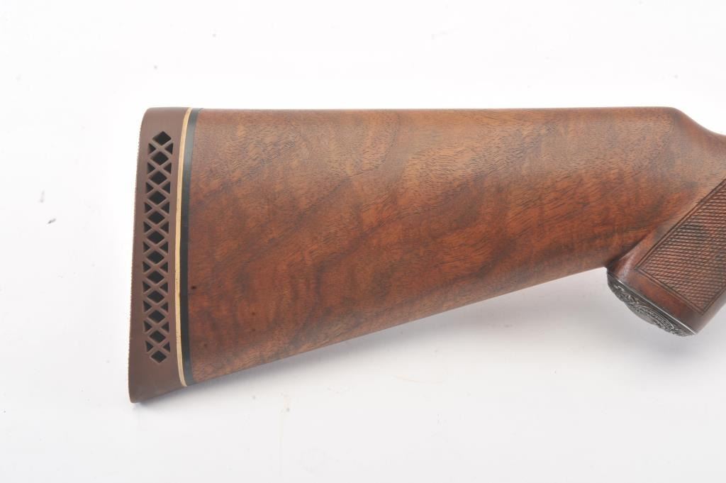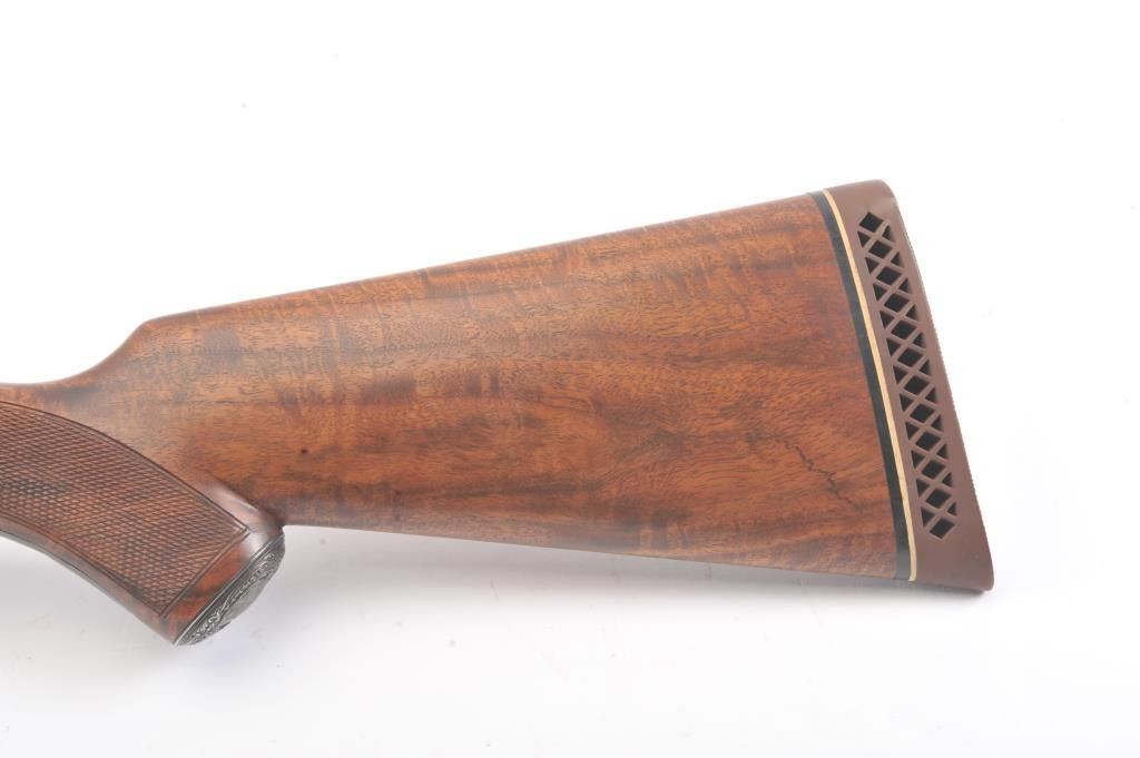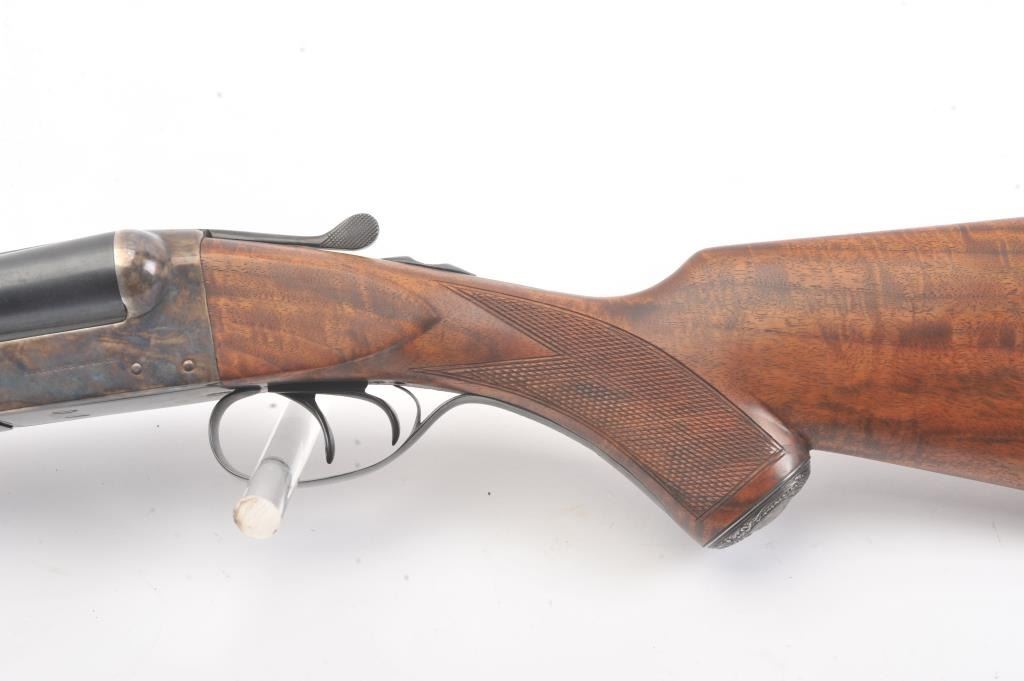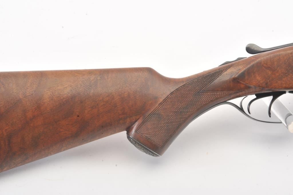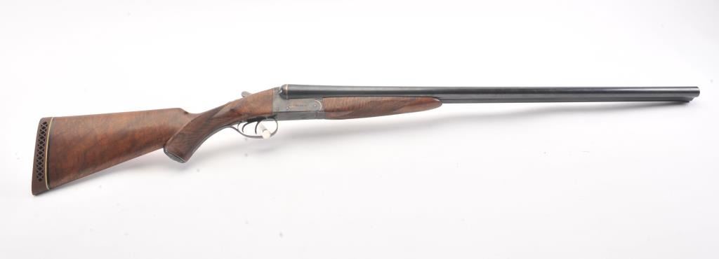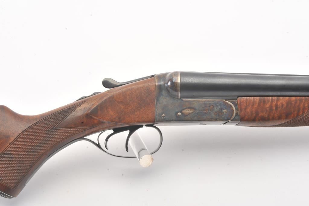 Remington SxS hammerless shotgun, 12 gauge, auto ejectors, 30” barrels, blued and case hardened finish, checkered wood stocks with nice graining, monogrammed silver semi-pistol grip cap and White Line hard rubber buttpad, S/N Q371064; overall very good to fine condition showing majority of blued finish to barrels and majority of case colors to receiver; fine bores, crisp actions, sharp markings and fine wood stocks. (Modern). Est.: $500-$1,000.