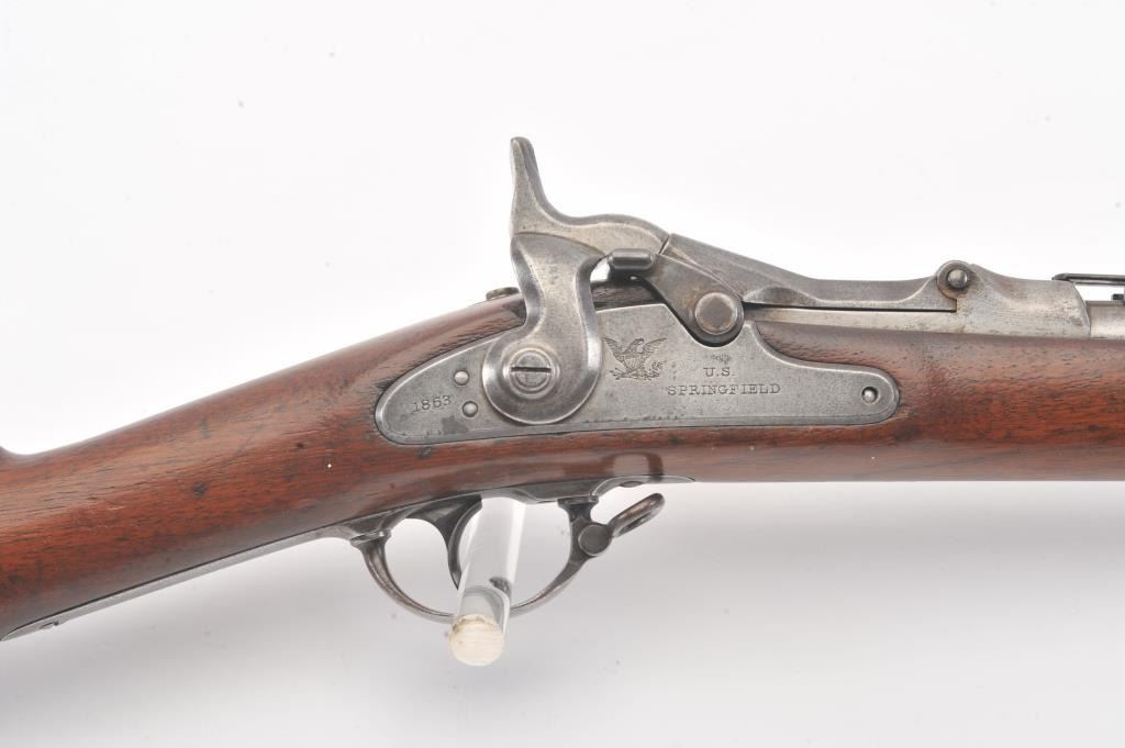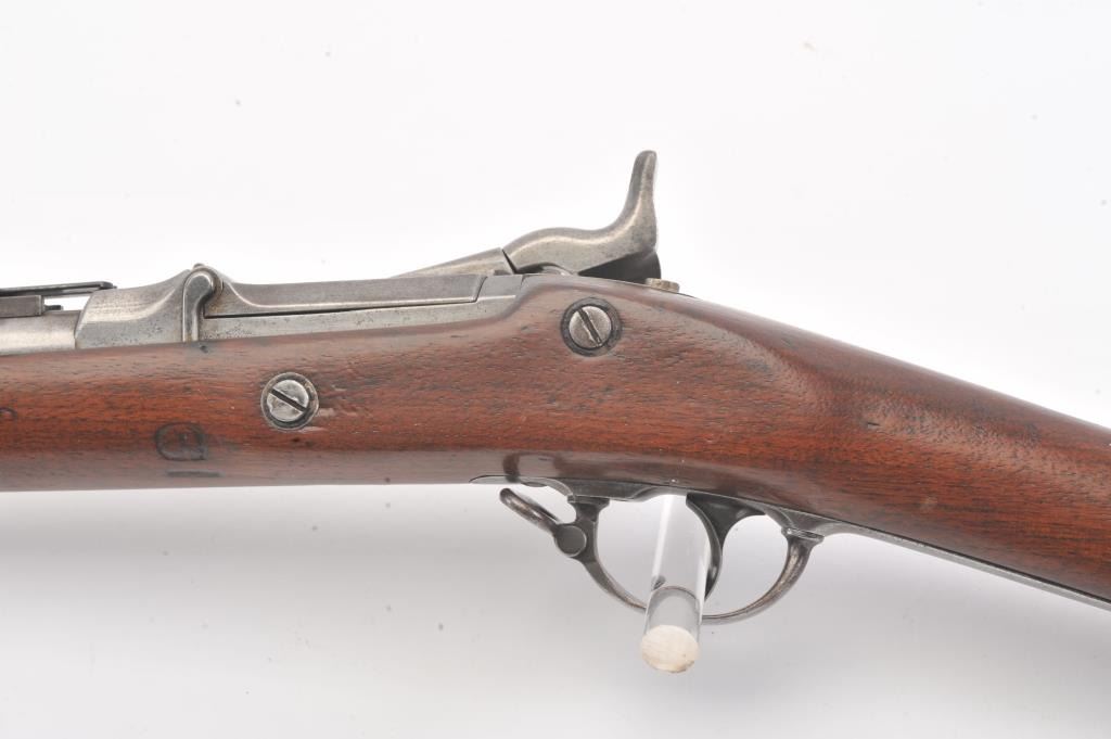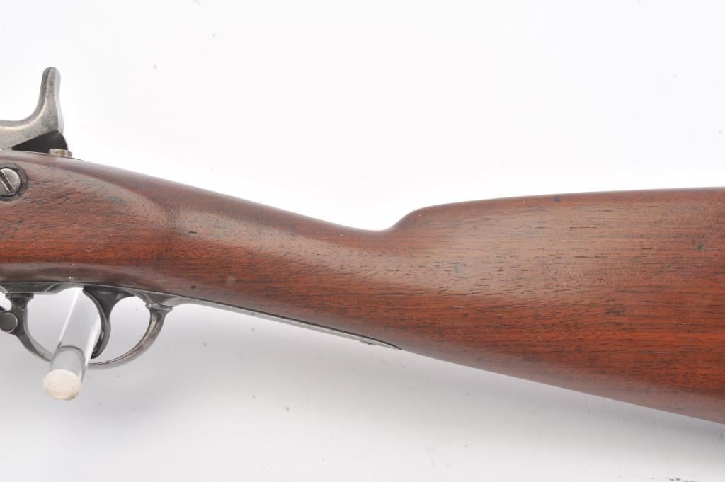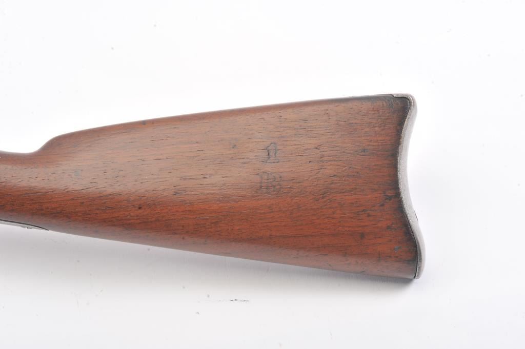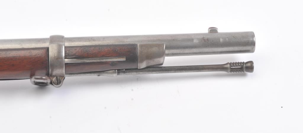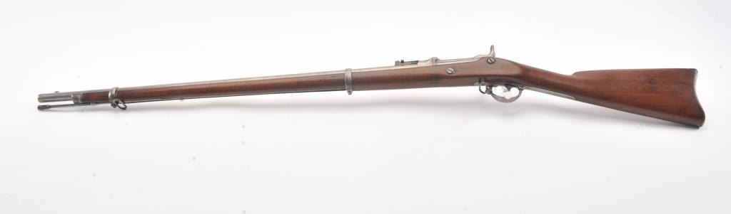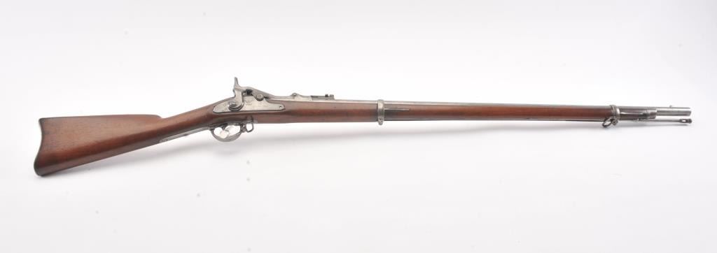 U.S. Second Model Allin Conversion to 50-70 cal. from Civil War musket. Lock dated 1863 with breech block dated 1870 showing eagle and U.S. along with all features correct as issued on this model. Refer to Flayderman(9A-356). Good to very good overall, condition with sharp marking on lock and original "arsenal bright" metal. Light normal aging and slight discoloration, but generally crisp metal. Stocks also very good with rack marking 1B in left butt stock and 13 on underside of forend. Crisp and sharp retaining “quenched blue" on rear sight. Rod and small parts all retained, an 8 plus on a 1-10 scale. (Antique)Est $650-$1300