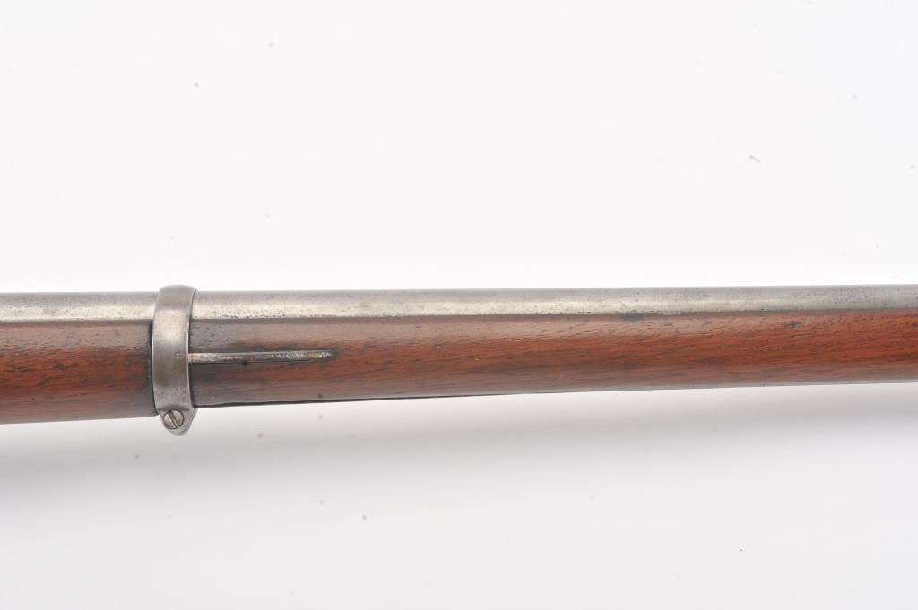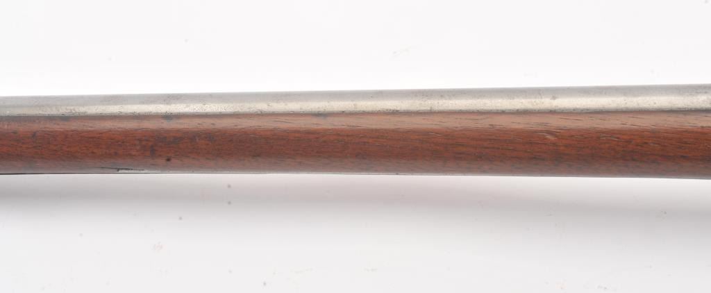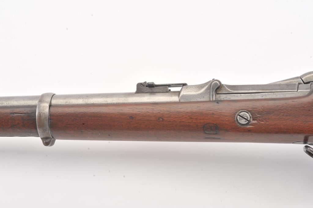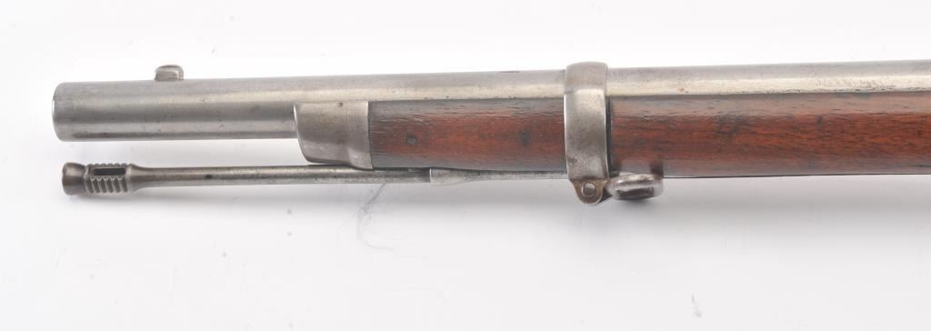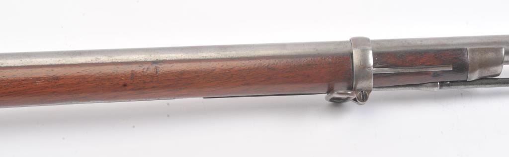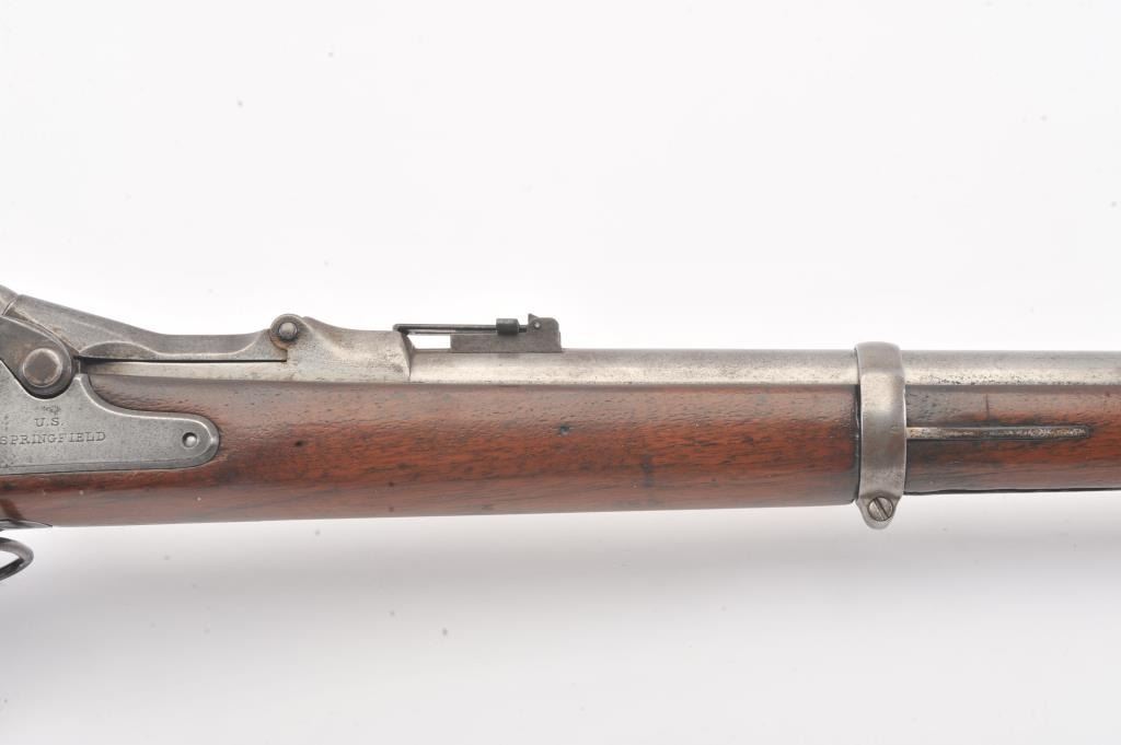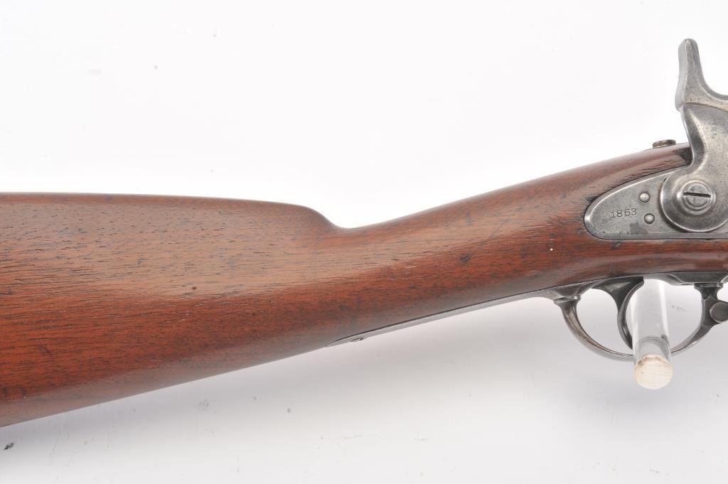 U.S. Second Model Allin Conversion to 50-70 cal. from Civil War musket. Lock dated 1863 with breech block dated 1870 showing eagle and U.S. along with all features correct as issued on this model. Refer to Flayderman(9A-356). Good to very good overall, condition with sharp marking on lock and original "arsenal bright" metal. Light normal aging and slight discoloration, but generally crisp metal. Stocks also very good with rack marking 1B in left butt stock and 13 on underside of forend. Crisp and sharp retaining “quenched blue" on rear sight. Rod and small parts all retained, an 8 plus on a 1-10 scale. (Antique)Est $650-$1300