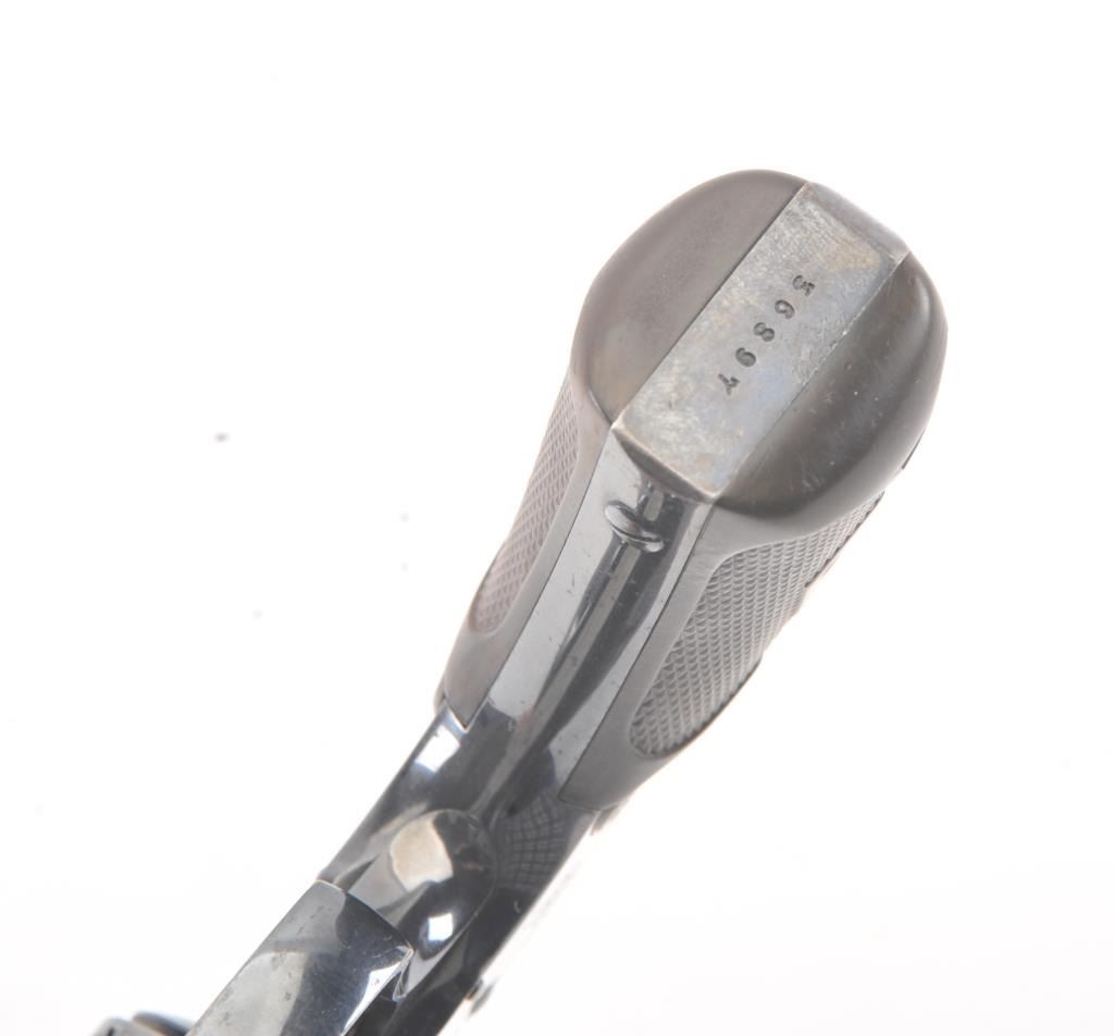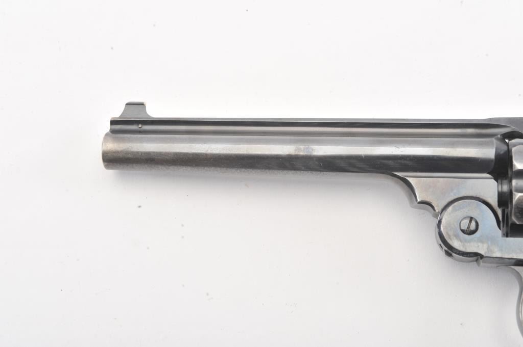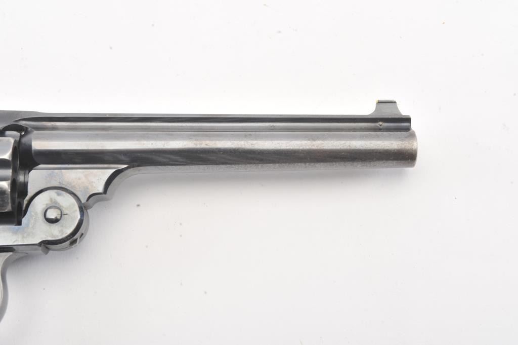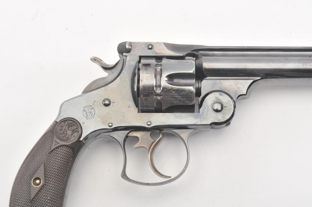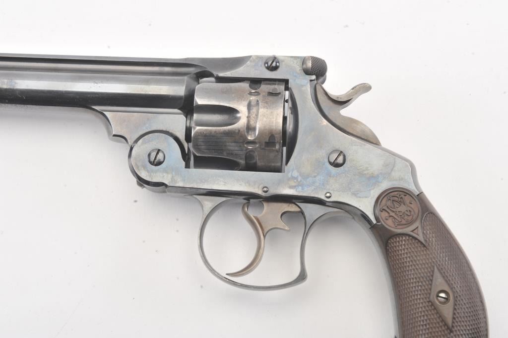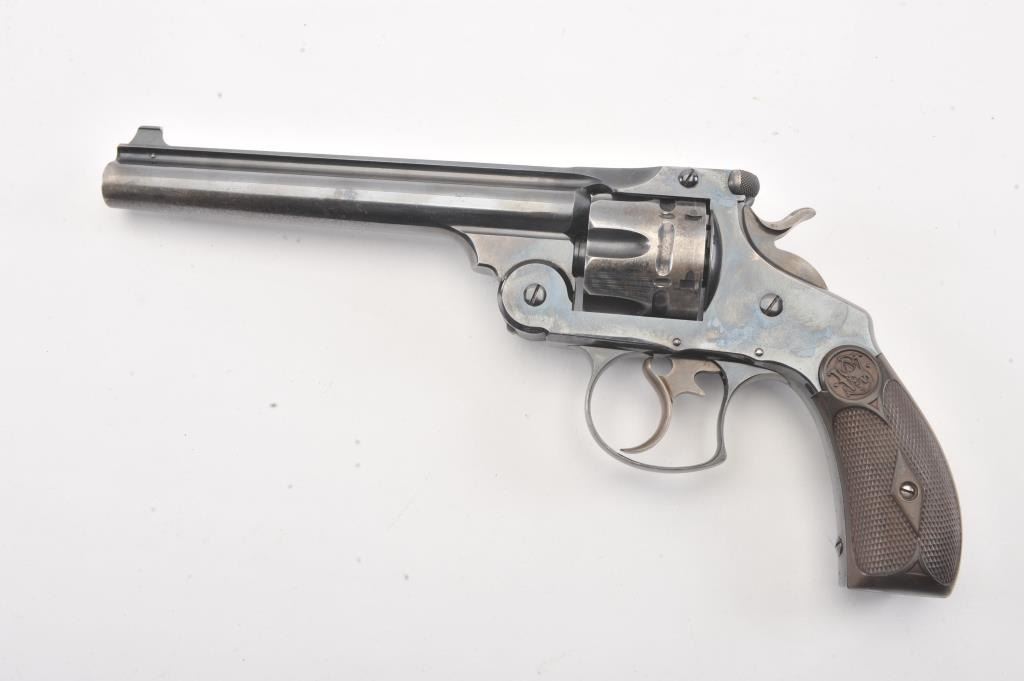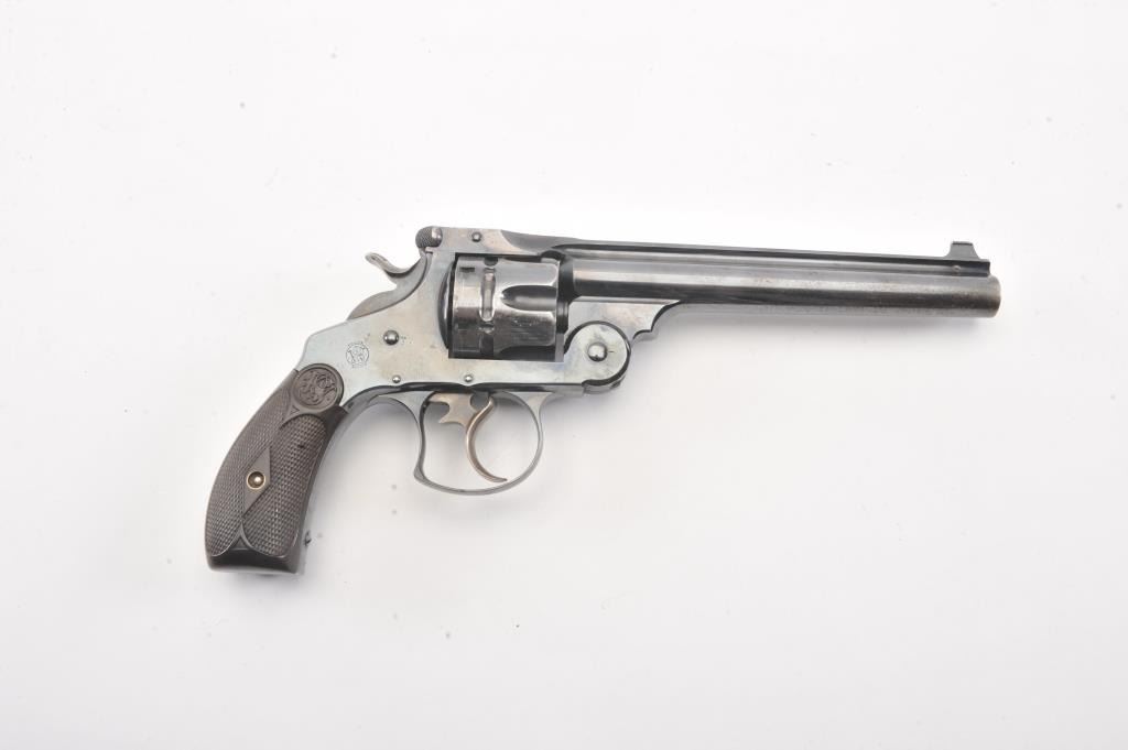 Smith & Wesson 1st Model double action revolver, .44 caliber, Serial #36897. The pistol is in fine overall condition with a 6 ½” barrel with a solid rib, blade front sight with an ivory insert. The pistol retains asignificant amount of the thinning blue finish with wear at the muzzle and on the cylinder. The trigger and hammer show muted case hardening. The checkered hard rubber grips are in very good condition with goodfit. The bore is good, the action is crisp and the markings are sharp. Est.: $600-$1,200. (Antique).