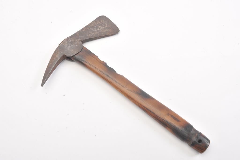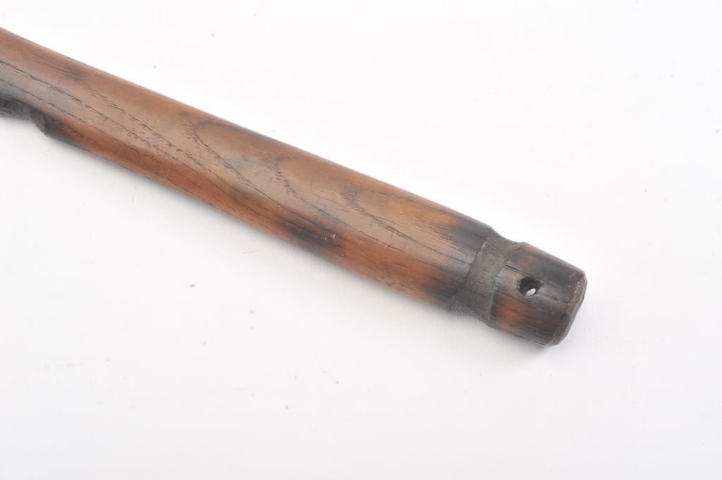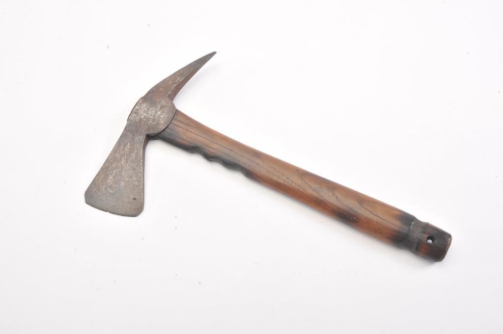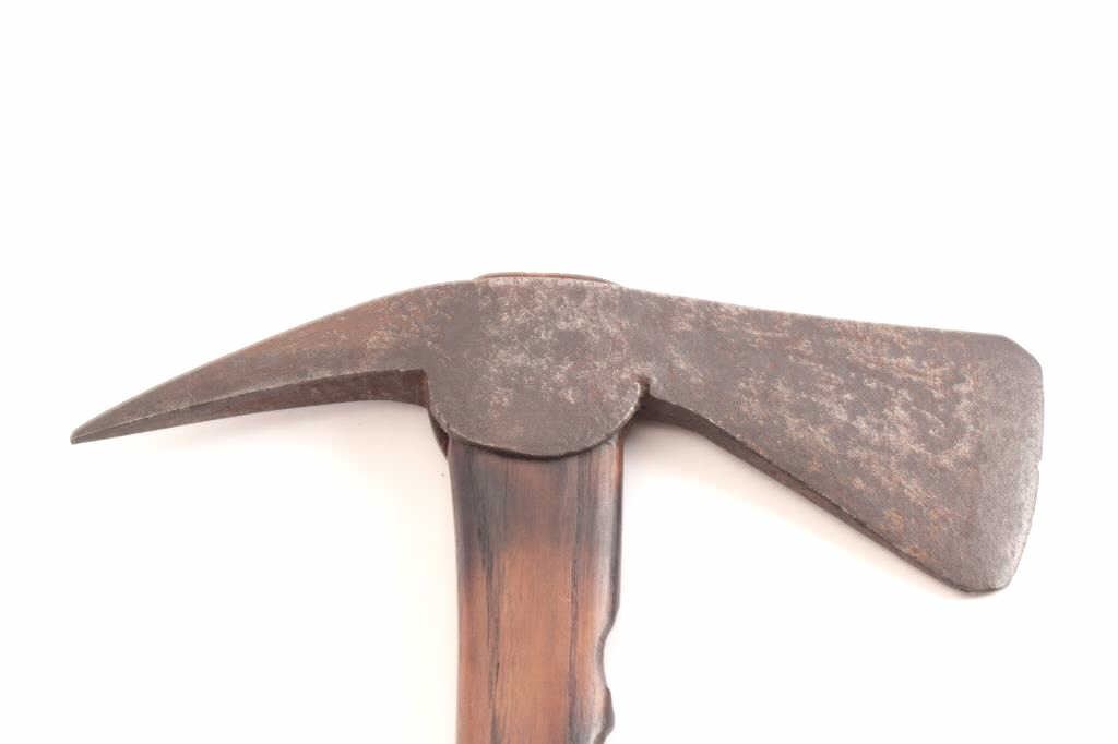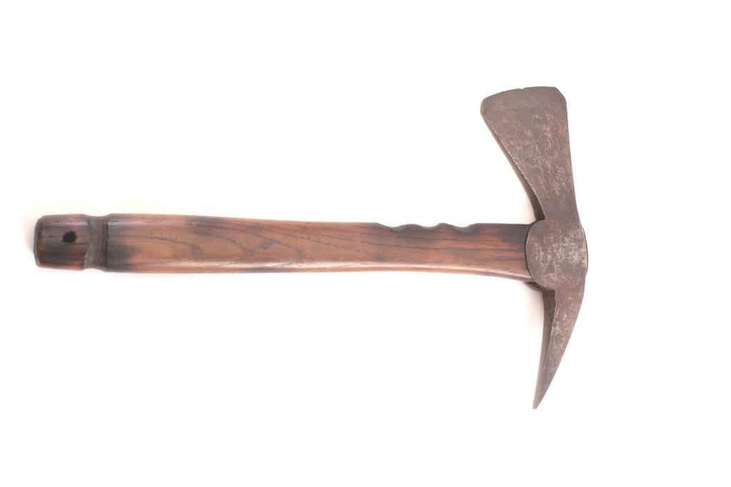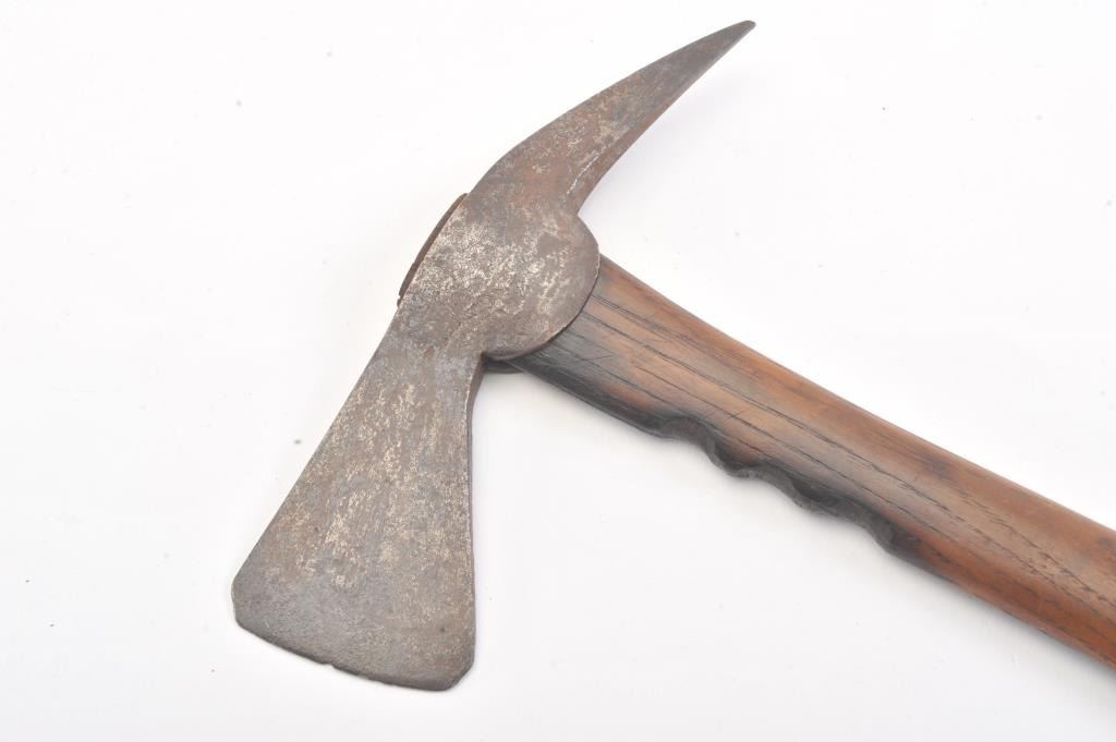 Northeast belt axe circa 1750-1790 with American wood shaft. Measures 12 ½” with head measuring 8” across. Good uncleaned patina with some pitting and erosion. American rifleman and Indians both favored these typeaxes as weapons and tools useful in the woods. From a major eastern collector. Est.: $1750-3500