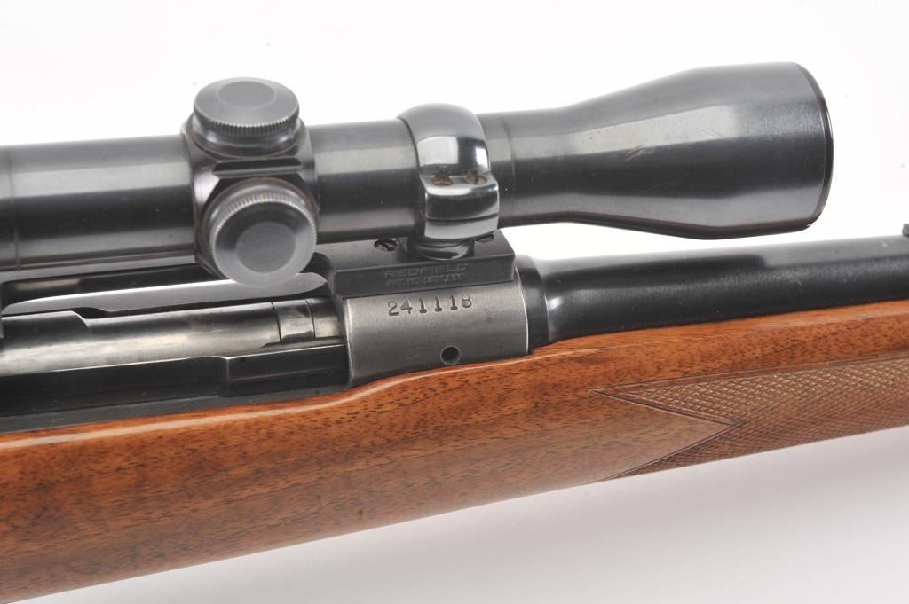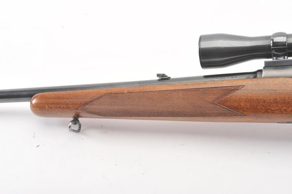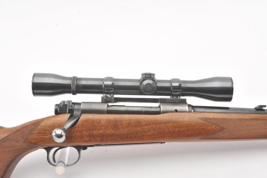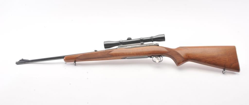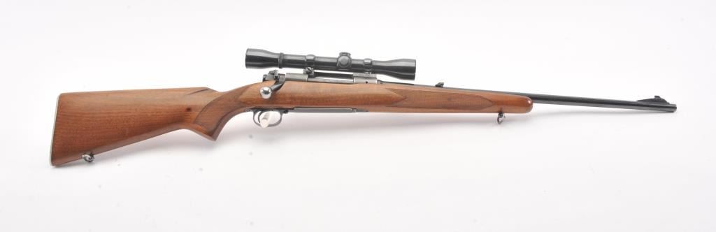 Early Winchester Model 70 Featherweight bolt action rifle, .358 Winchester caliber, Serial #241118. The rifle is in fine overall condition with a 22” barrel. The barrel retains approximately 85%-90% of the thinning blue finish with a ramped blade front and folding rear sights. The receiver has gone to a matte grey finish. All matching visible serial numbers including the bolt. The checkered wood stock has been refreshed withthe checkering re-cut. The butt stock ends with a checkered aluminum butt plate. The rifle is topped with a one-piece Redfield mount and a Weaver K-4 fixed power scope. The bore is good, the action is crisp and the markings are sharp. The Model 70 Featherweight was introduced in 1952, with this rifle manufactured in 1953. The .358 Winchester chambering is exceedingly rare as Winchester had problems with the caliber andmany of the rifles were subsequently exchanged for other calibers. Est.: $1,250-$2,500. (C+R).