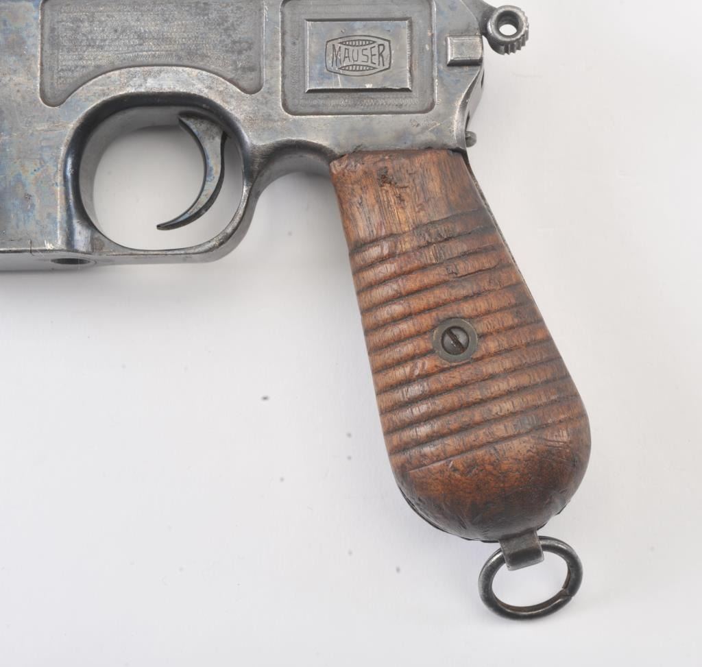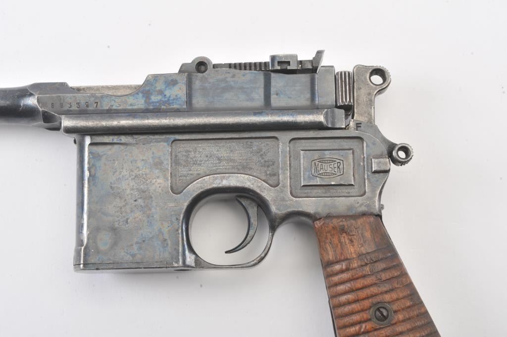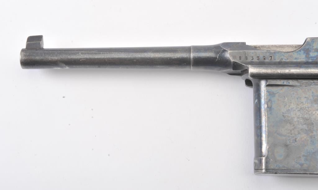 Mauser Model C-96 step barrel Commercial semi-automatic pistol, 7.63mm caliber, 5.5” barrel, blued finish, grooved wood grips, S/N 893397; overall good condition with majority of muted blued finish remaining, dark bore,good action and markings including banner “Mauser” marking on left rear side of frame; good grips; lanyard ring retained. Two stripper clips included. (C&R/PPT). Est.: $900-$1,800.