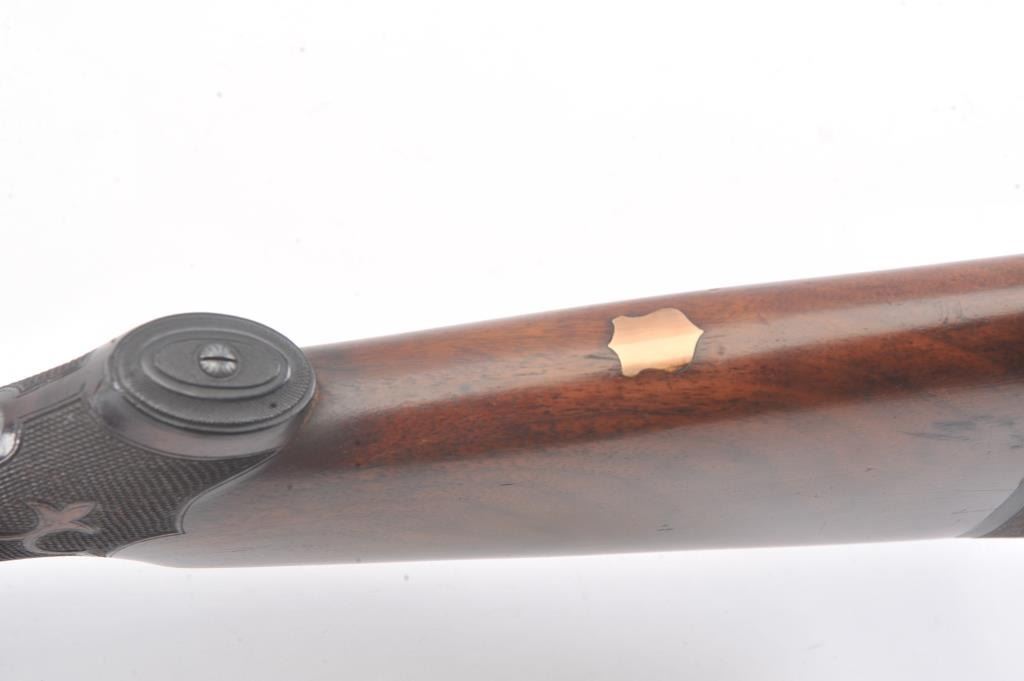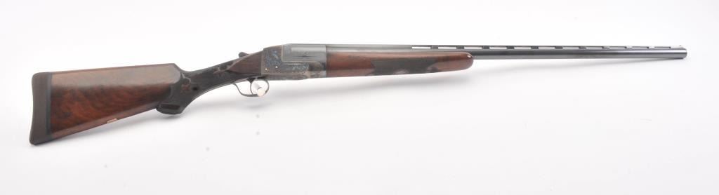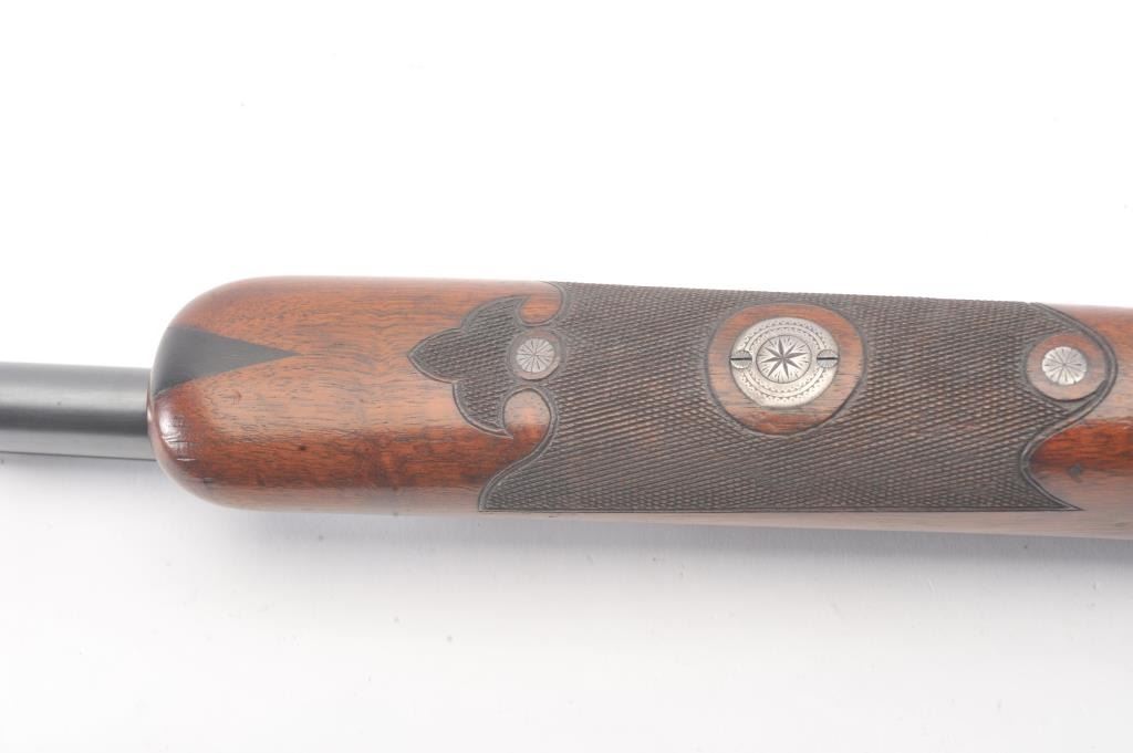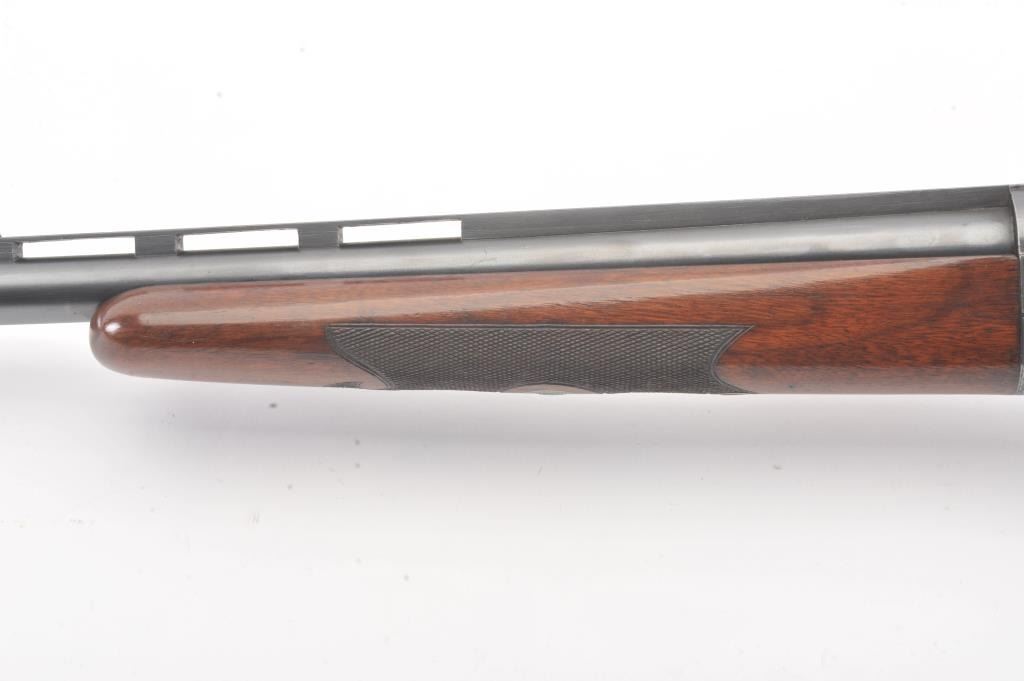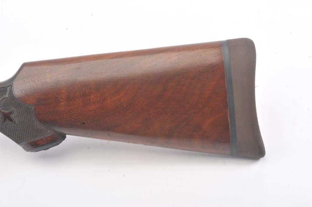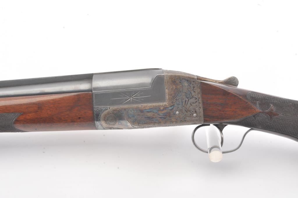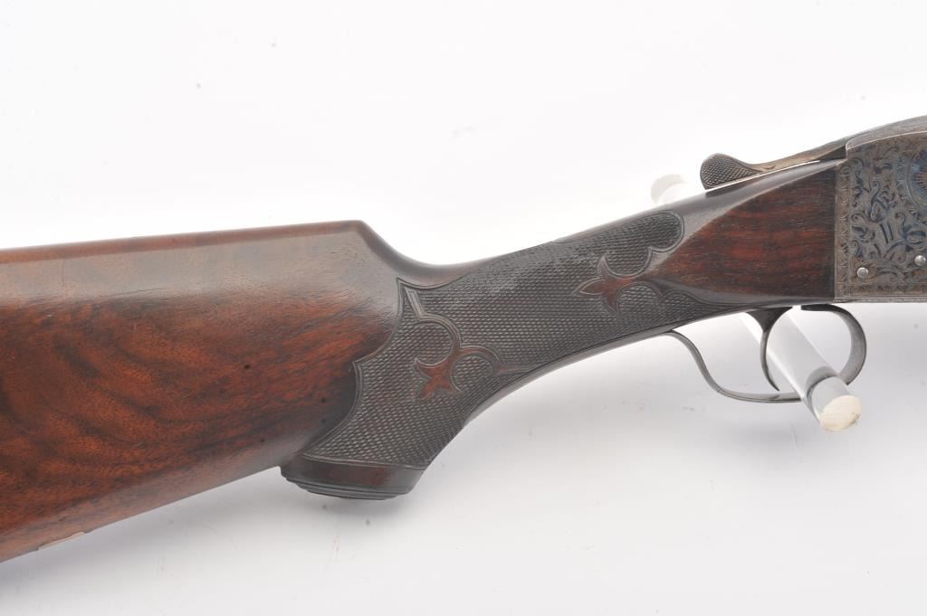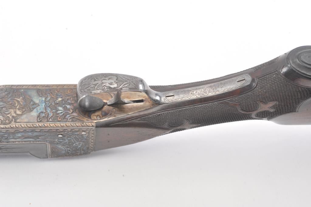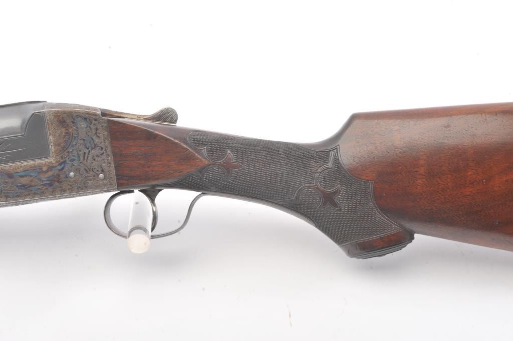 Ithaca 4E Trap shotgun, 12 gauge, Serial #261904T. The shotgun is in fine overall condition with a 32” single barrel with a full-length ventilated rib with an ivory bead front sight. The barrel retainsapproximately 95% of the blue finish with handling marks. The receiver is beautifully engraved in a floral style with game scenes and vivid color case hardening with a single trigger and long tang. The finely checkeredwood stock has a beaver tail fore end, engraved screw heads and Fleur-d-Lis checkering. The butt stock ends with a solid rubber recoil pad providing a 14” LOP. The bore is good, the action is crisp and themarkings are sharp. Est.: $1,000-$2,000. (C+R).
