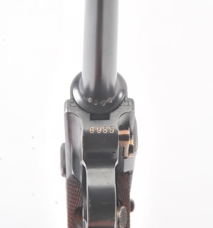 DWM Luger semi-automatic pistol with Swiss cross on top front of frame, 7.65mm caliber, 4.75” barrel, blued finish with straw finish to small parts, checkered wood grips, un-numbered wood base magazine, S/N 6935(matching visible numbers); overall very good condition with majority of blued finish remaining showing some scattered high point wear; good bore, crisp action, sharp markings; very good to near fine grips. (C&R/PPT). Est.: $1,400-$2,800.