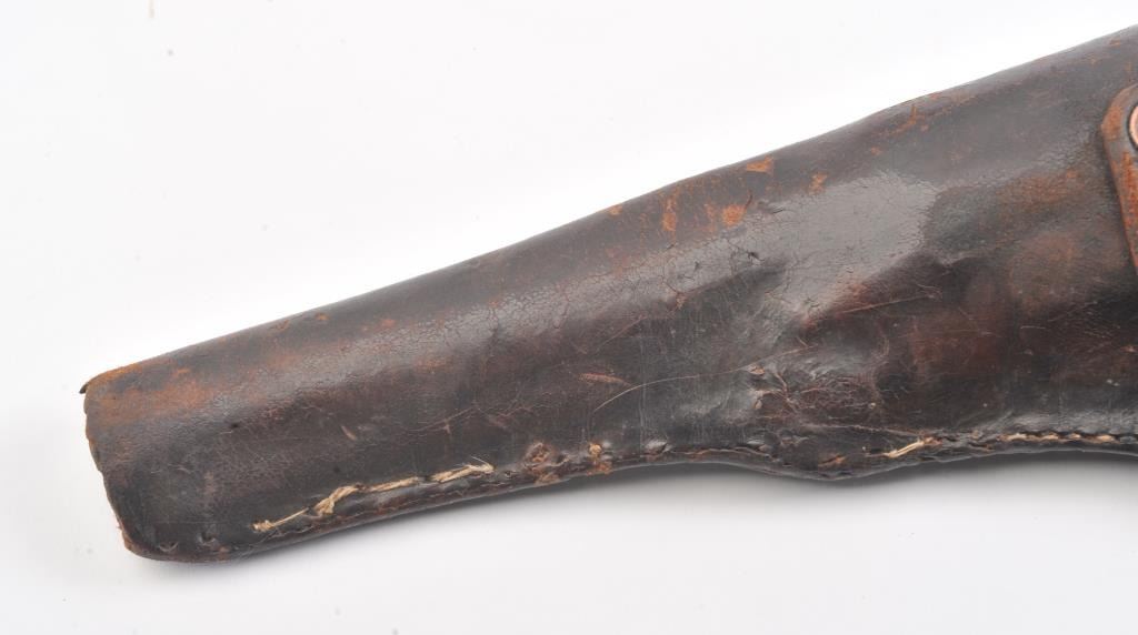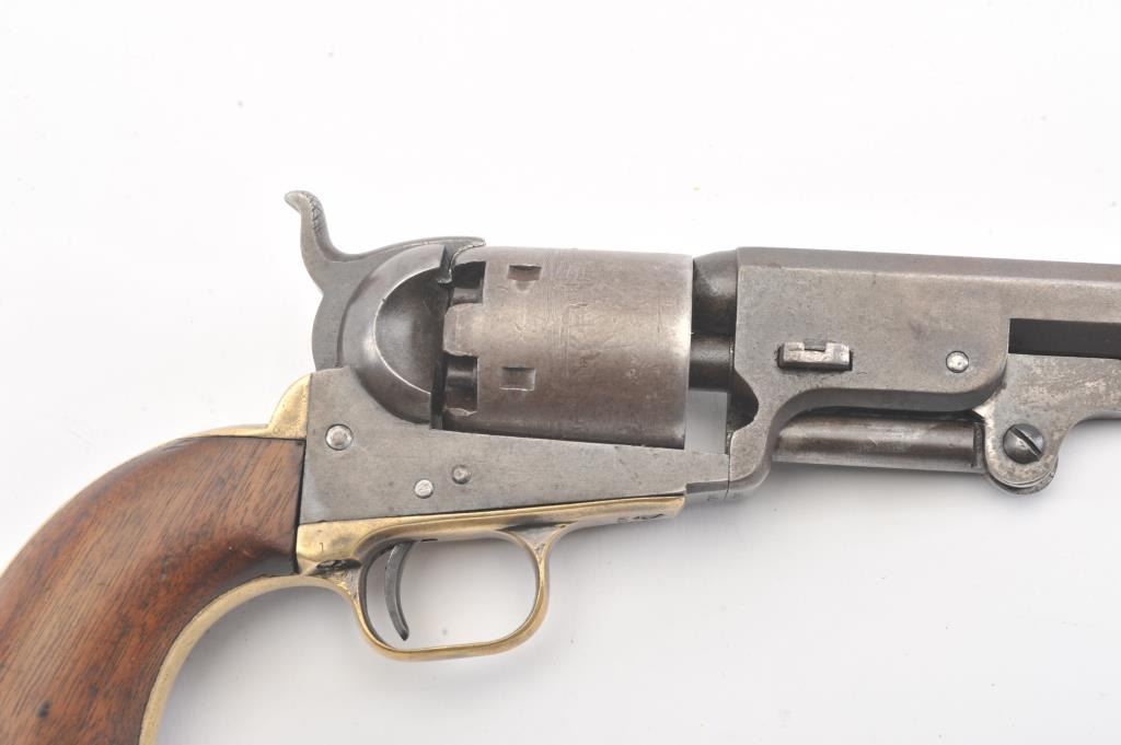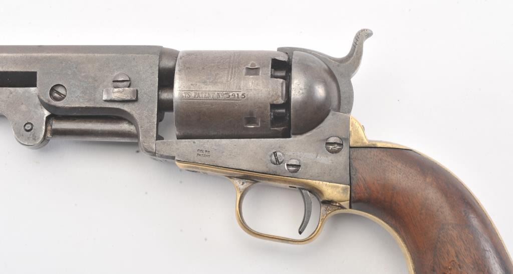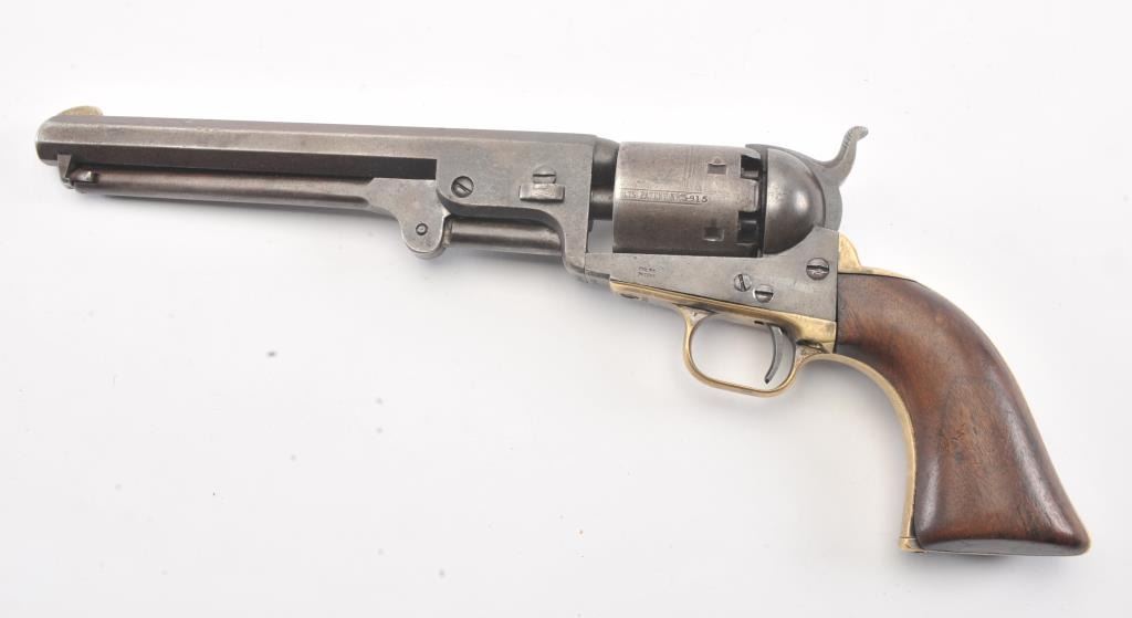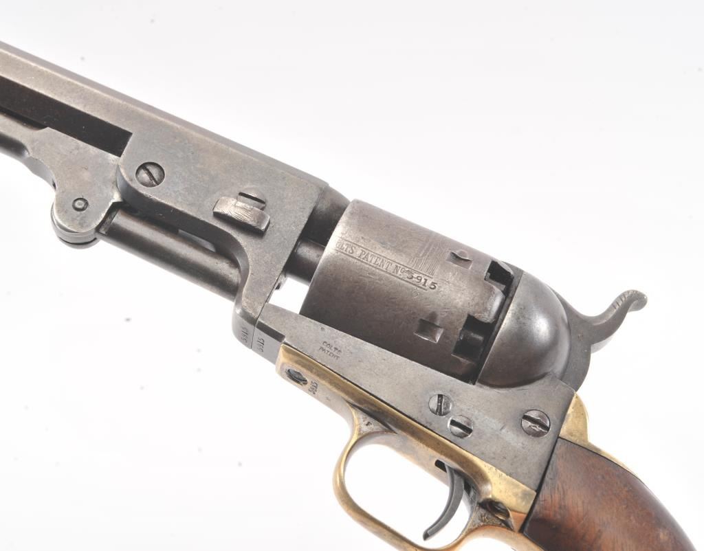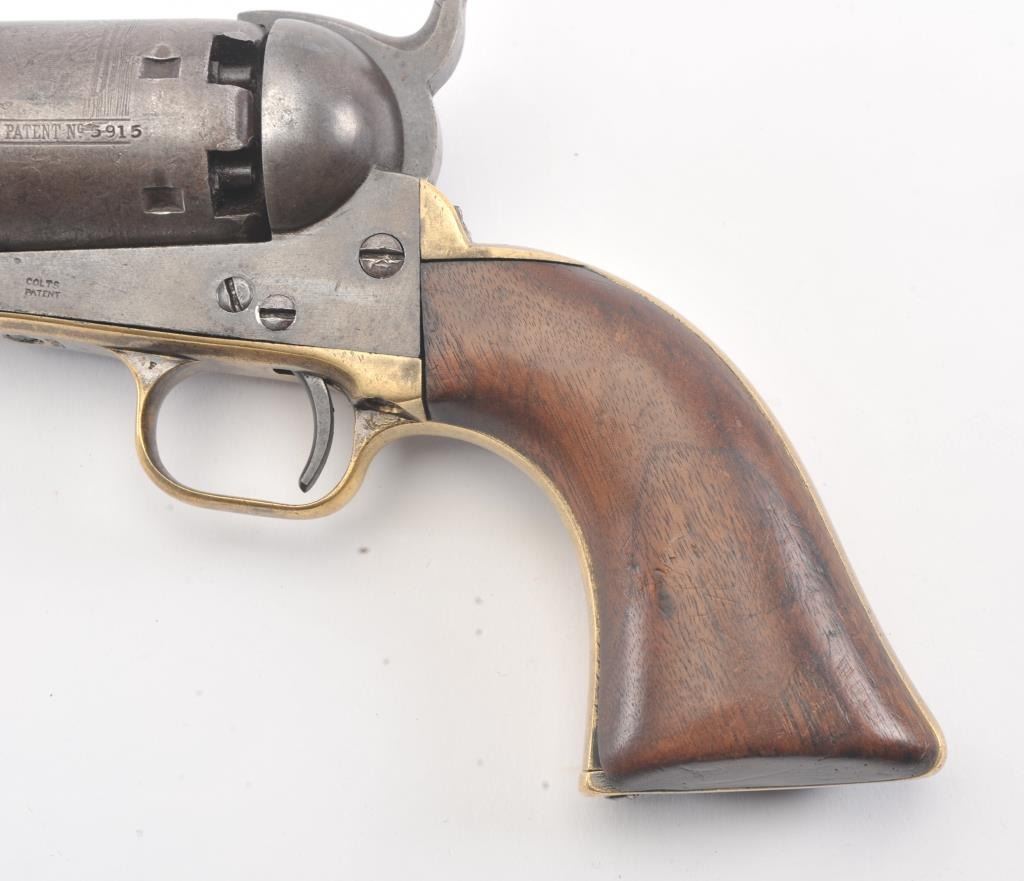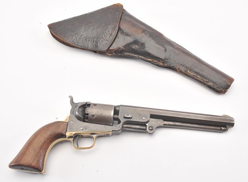 Early Colt 1851 Navy percussion revolver, .36 caliber, Serial #5915. The pistol is in very good overall condition with a 7 ½” octagon barrel. The barrel has a German silver blade front sight and rounded edges at the muzzle from holster wear. The metal surfaces are primarily brown patina with small amounts of original blue still visible in protected areas under the lever. The cylinder shows 65%-75% of the scene withsharp markings and all original nipples intact. The brass straps are have taken on a pleasing patina with traces of silver finish still evident near the trigger guard and all matching visible serial numbers. The smooth wood slim Jim grips are in good condition with small chips at the toe. The action is crisp and the markings are sharp on this early Gold Rush era Navy. The lot includes a period hand tooled leather flap holster infair condition. Est.: $1,500-$2,500. (Antique).