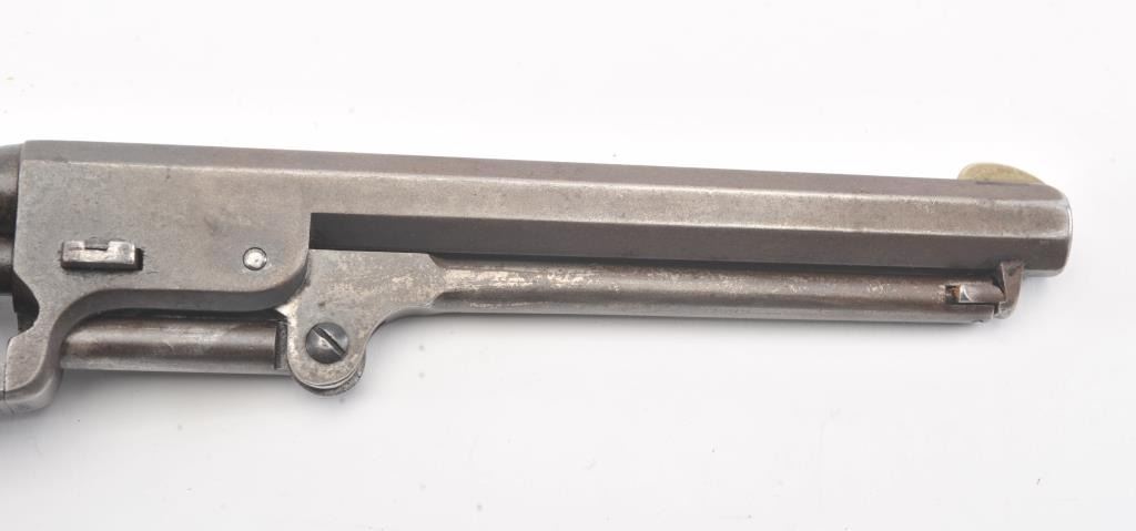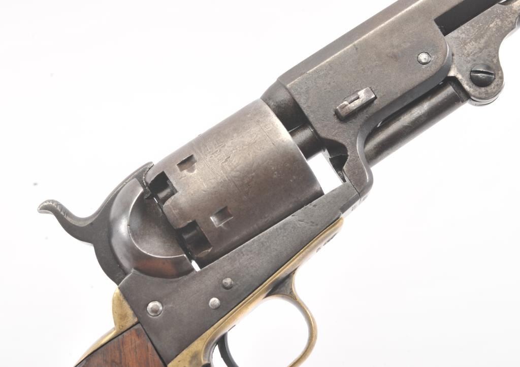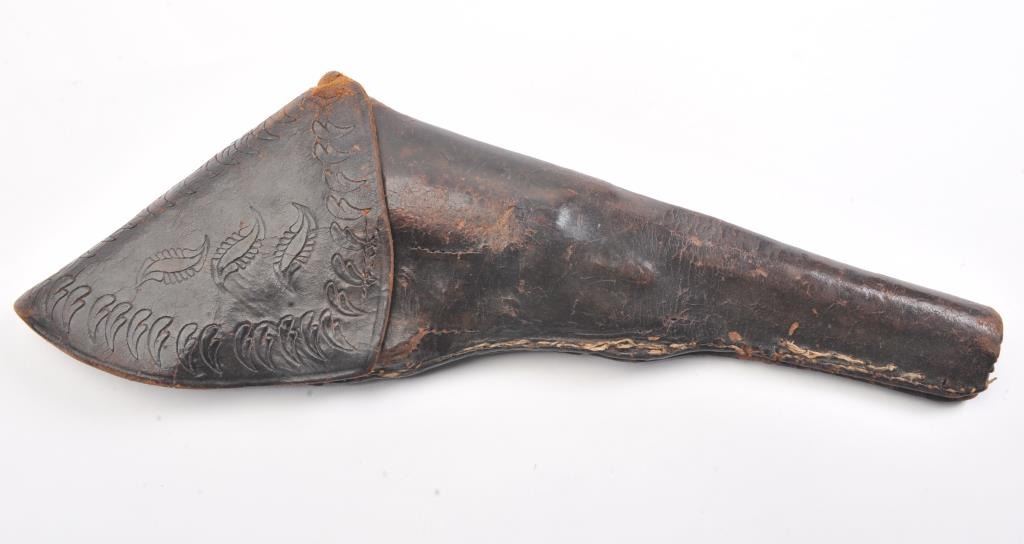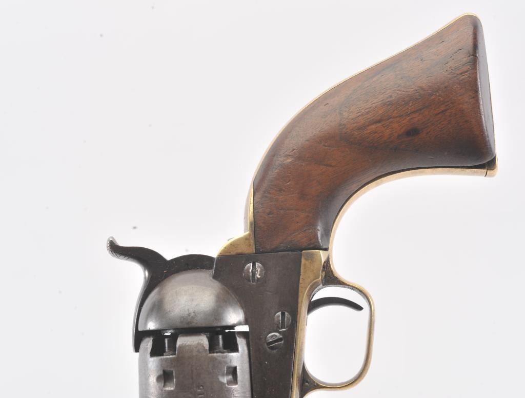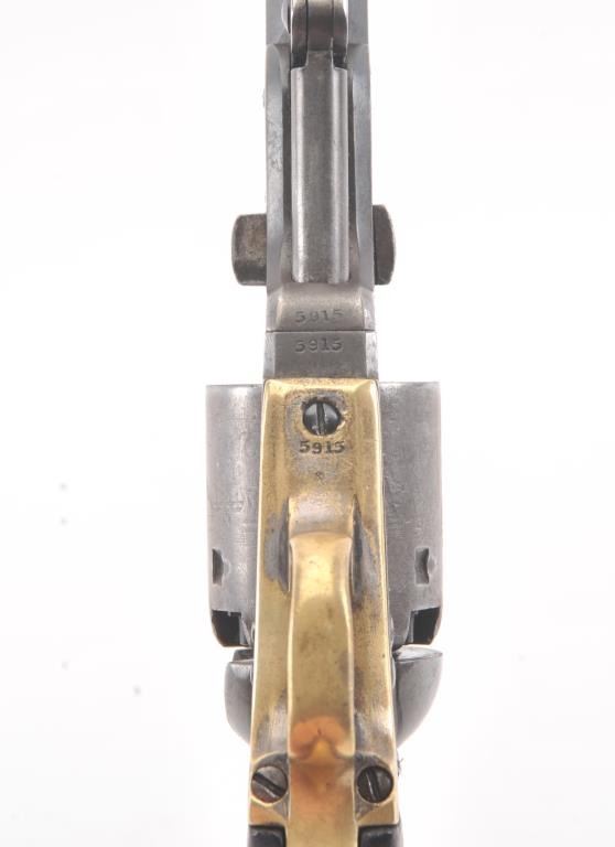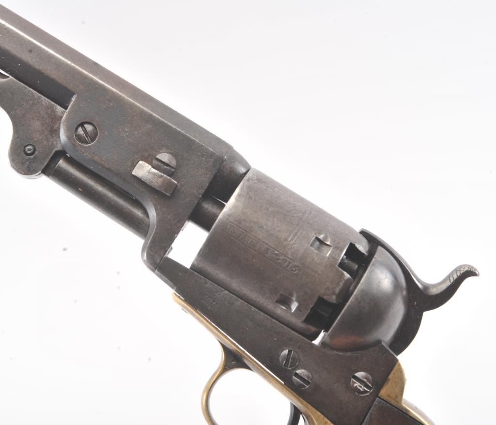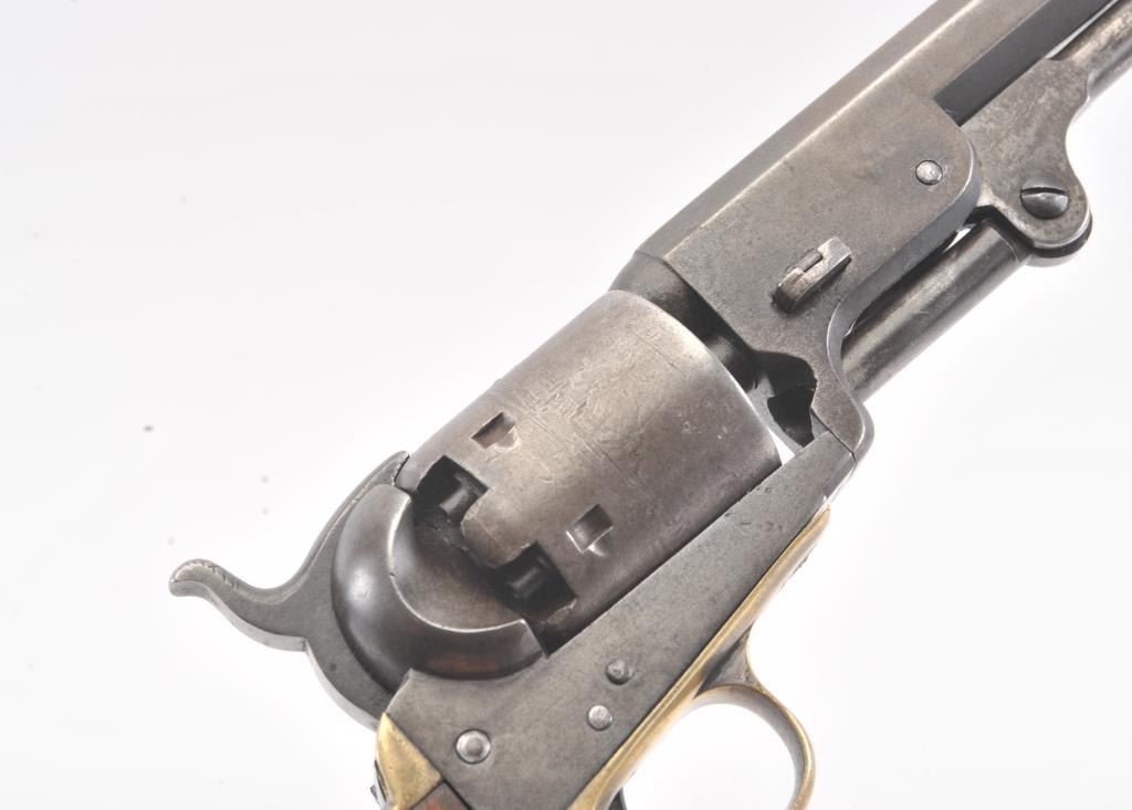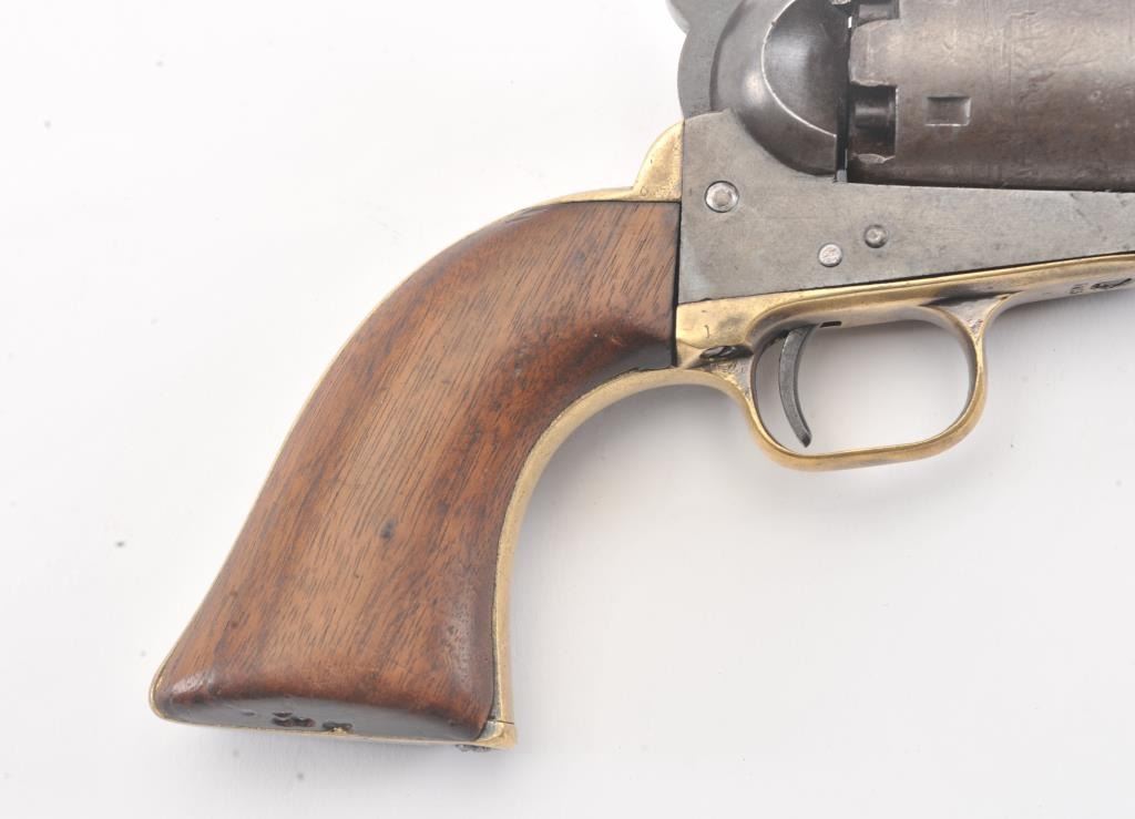 Early Colt 1851 Navy percussion revolver, .36 caliber, Serial #5915. The pistol is in very good overall condition with a 7 ½” octagon barrel. The barrel has a German silver blade front sight and rounded edges at the muzzle from holster wear. The metal surfaces are primarily brown patina with small amounts of original blue still visible in protected areas under the lever. The cylinder shows 65%-75% of the scene withsharp markings and all original nipples intact. The brass straps are have taken on a pleasing patina with traces of silver finish still evident near the trigger guard and all matching visible serial numbers. The smooth wood slim Jim grips are in good condition with small chips at the toe. The action is crisp and the markings are sharp on this early Gold Rush era Navy. The lot includes a period hand tooled leather flap holster infair condition. Est.: $1,500-$2,500. (Antique).