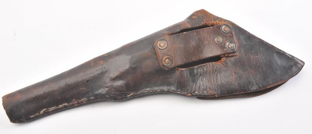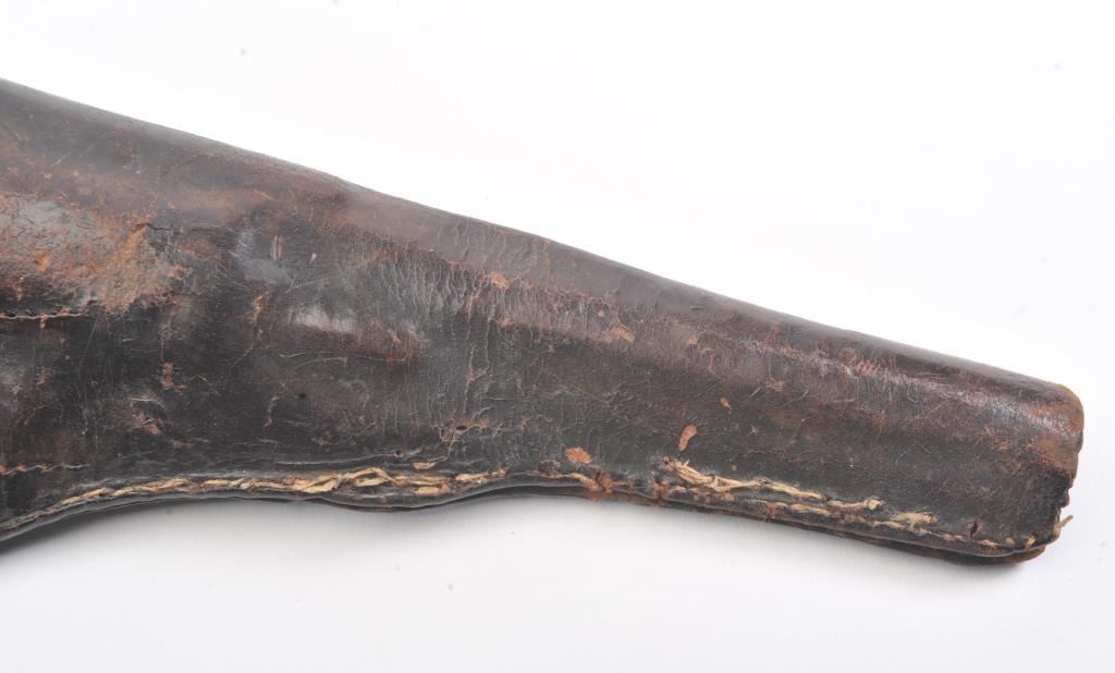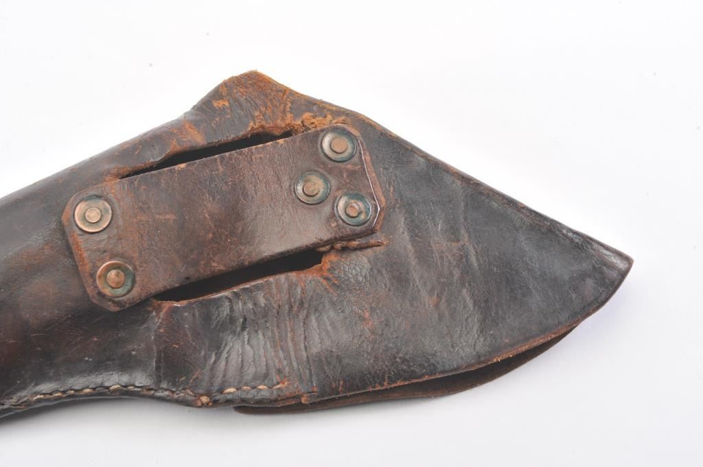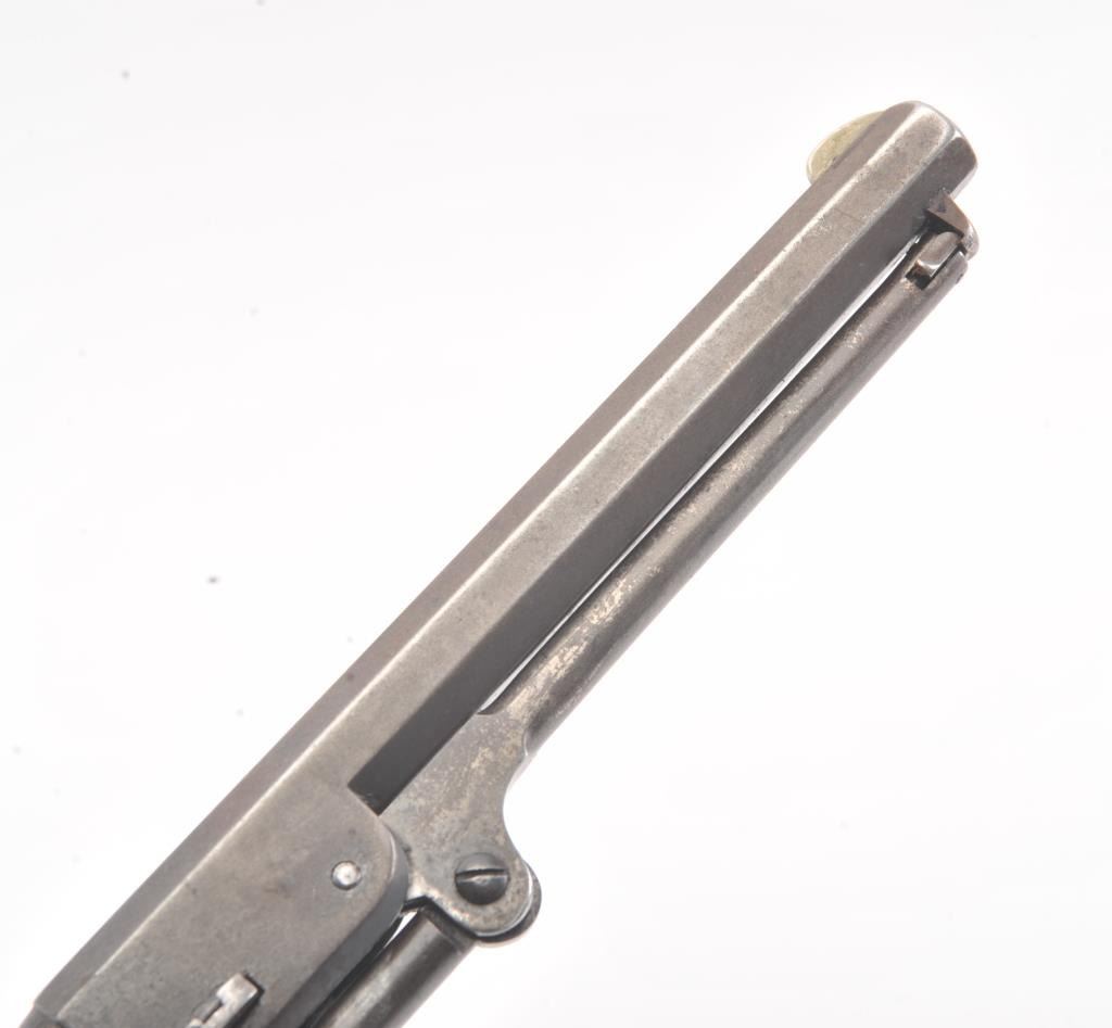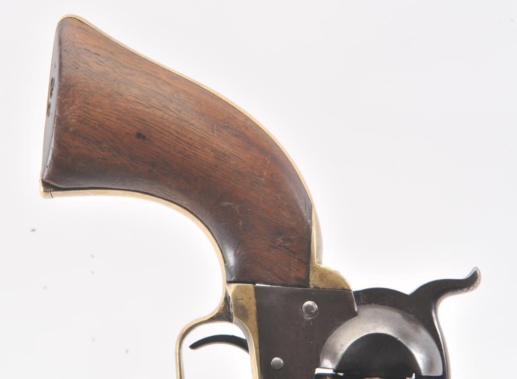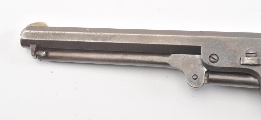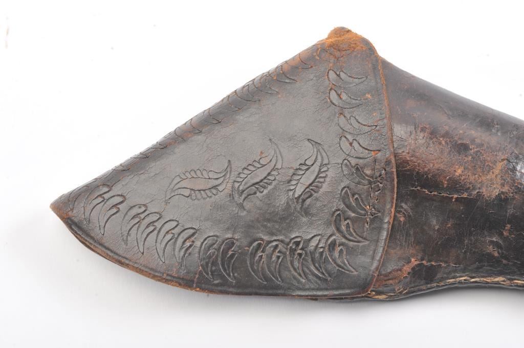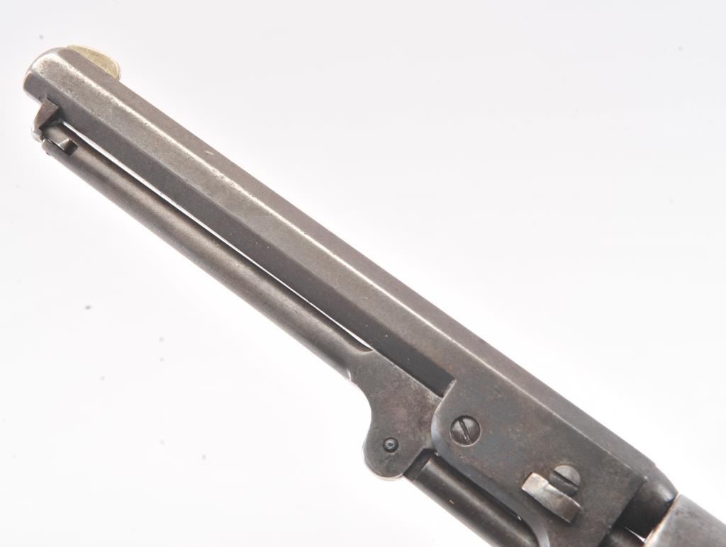 Early Colt 1851 Navy percussion revolver, .36 caliber, Serial #5915. The pistol is in very good overall condition with a 7 ½” octagon barrel. The barrel has a German silver blade front sight and rounded edges at the muzzle from holster wear. The metal surfaces are primarily brown patina with small amounts of original blue still visible in protected areas under the lever. The cylinder shows 65%-75% of the scene withsharp markings and all original nipples intact. The brass straps are have taken on a pleasing patina with traces of silver finish still evident near the trigger guard and all matching visible serial numbers. The smooth wood slim Jim grips are in good condition with small chips at the toe. The action is crisp and the markings are sharp on this early Gold Rush era Navy. The lot includes a period hand tooled leather flap holster infair condition. Est.: $1,500-$2,500. (Antique).