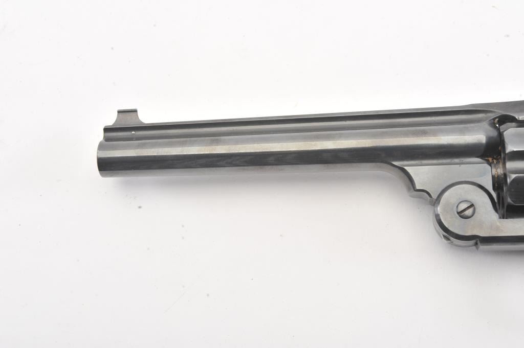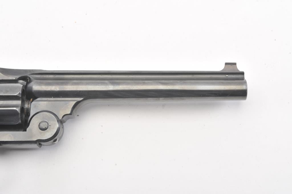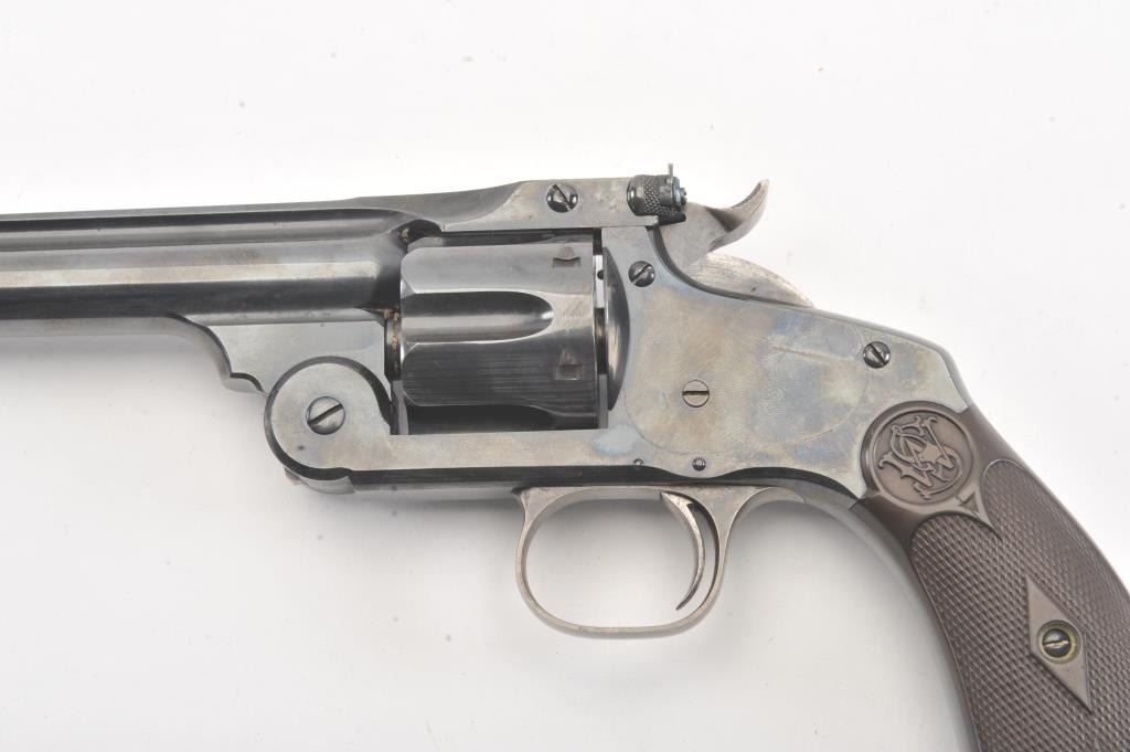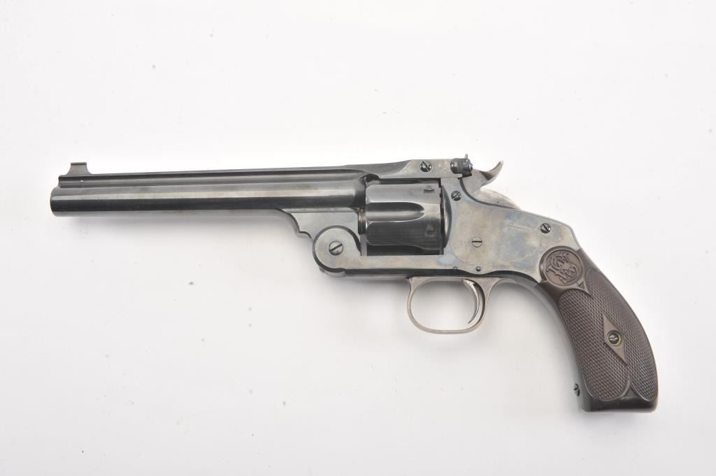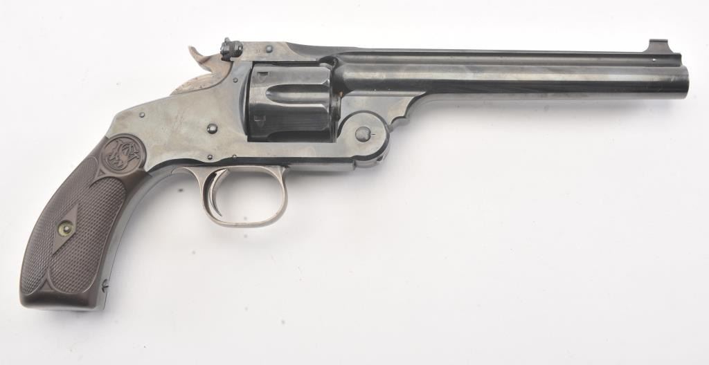 Smith & Wesson #3 Target Model double action revolver, .32-44 caliber, Serial #1415. The pistol is in fine overall condition as re-finished with a 6 ½” barrel, solid rib, blade front sight and adjustable rear sight. The pistol retains nearly all of a factory quality re-finish with all matching visible serial numbers including the cylinder. The trigger and hammer show muted case hardening. The checkered hard rubber grips are in very good condition with good fit. The bore is good, the action is crisp and the markings are sharp. Est.: $700-$1,400. (Antique).