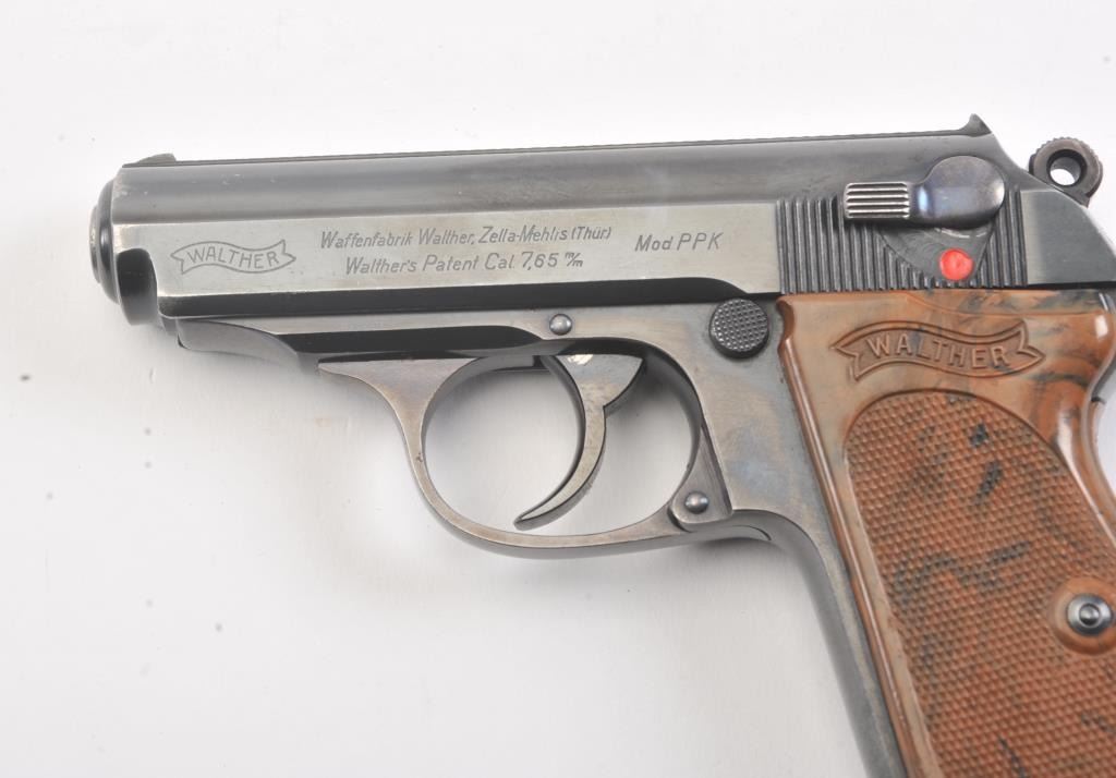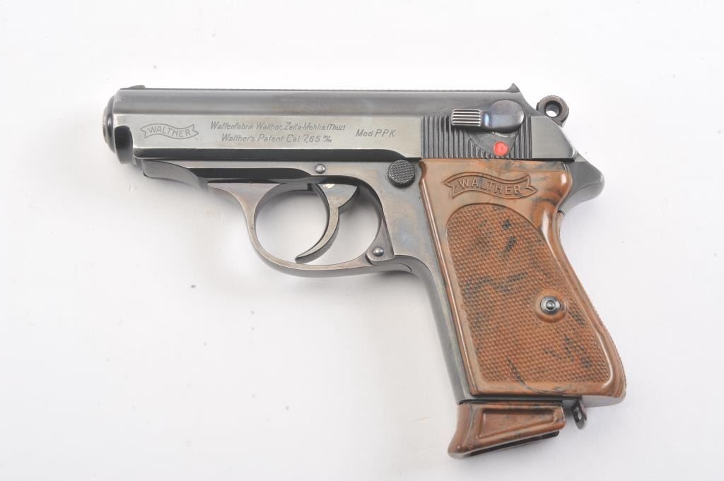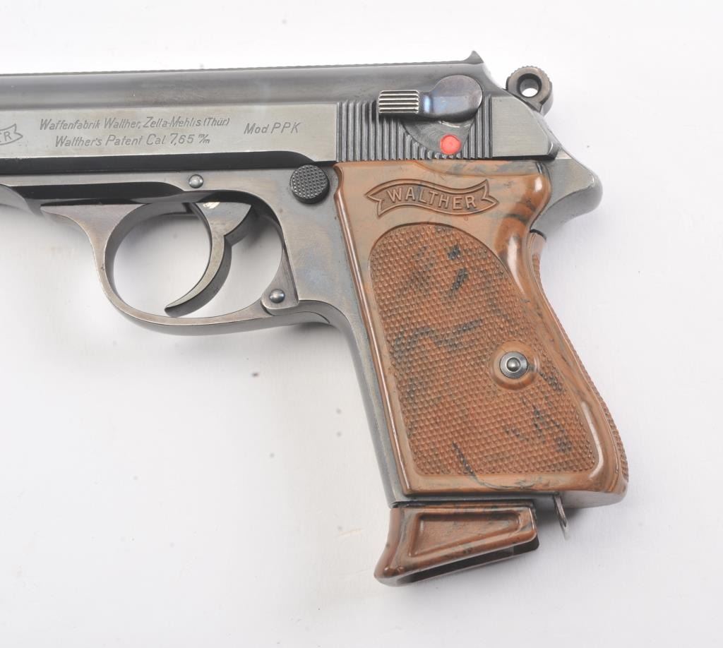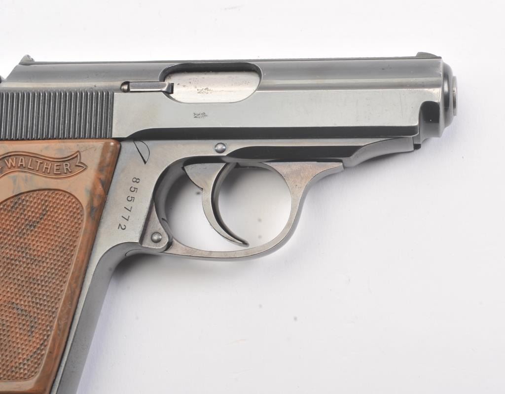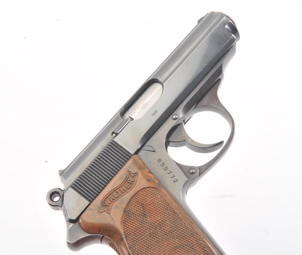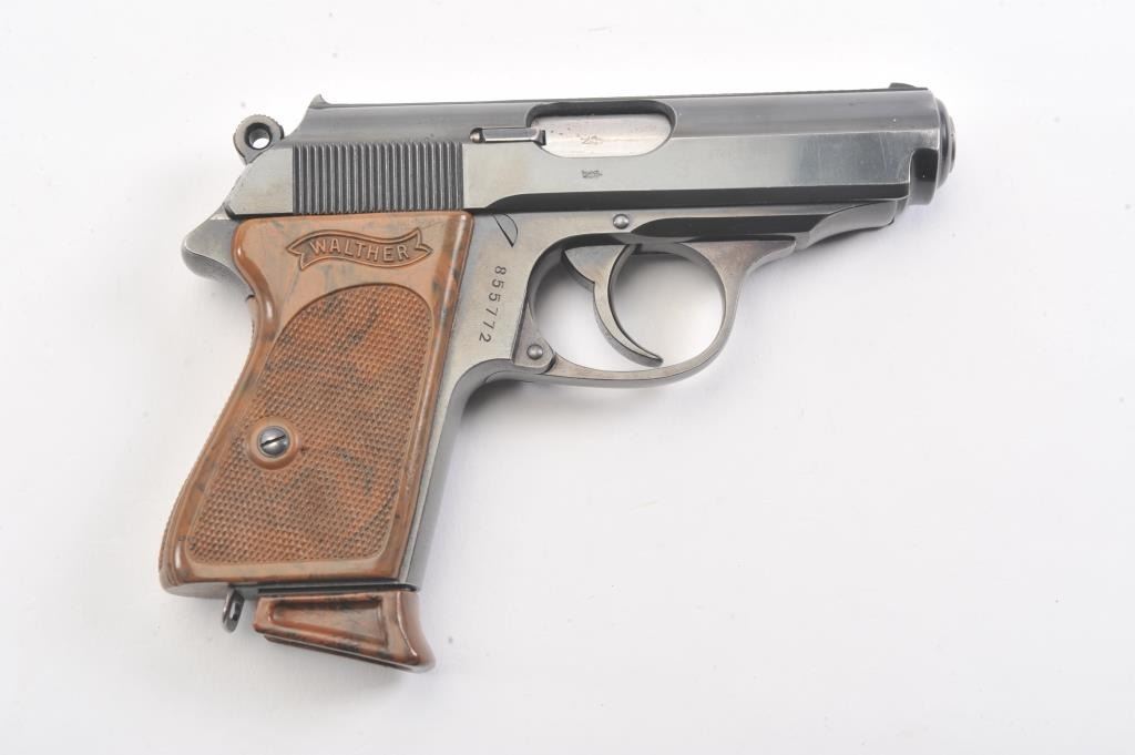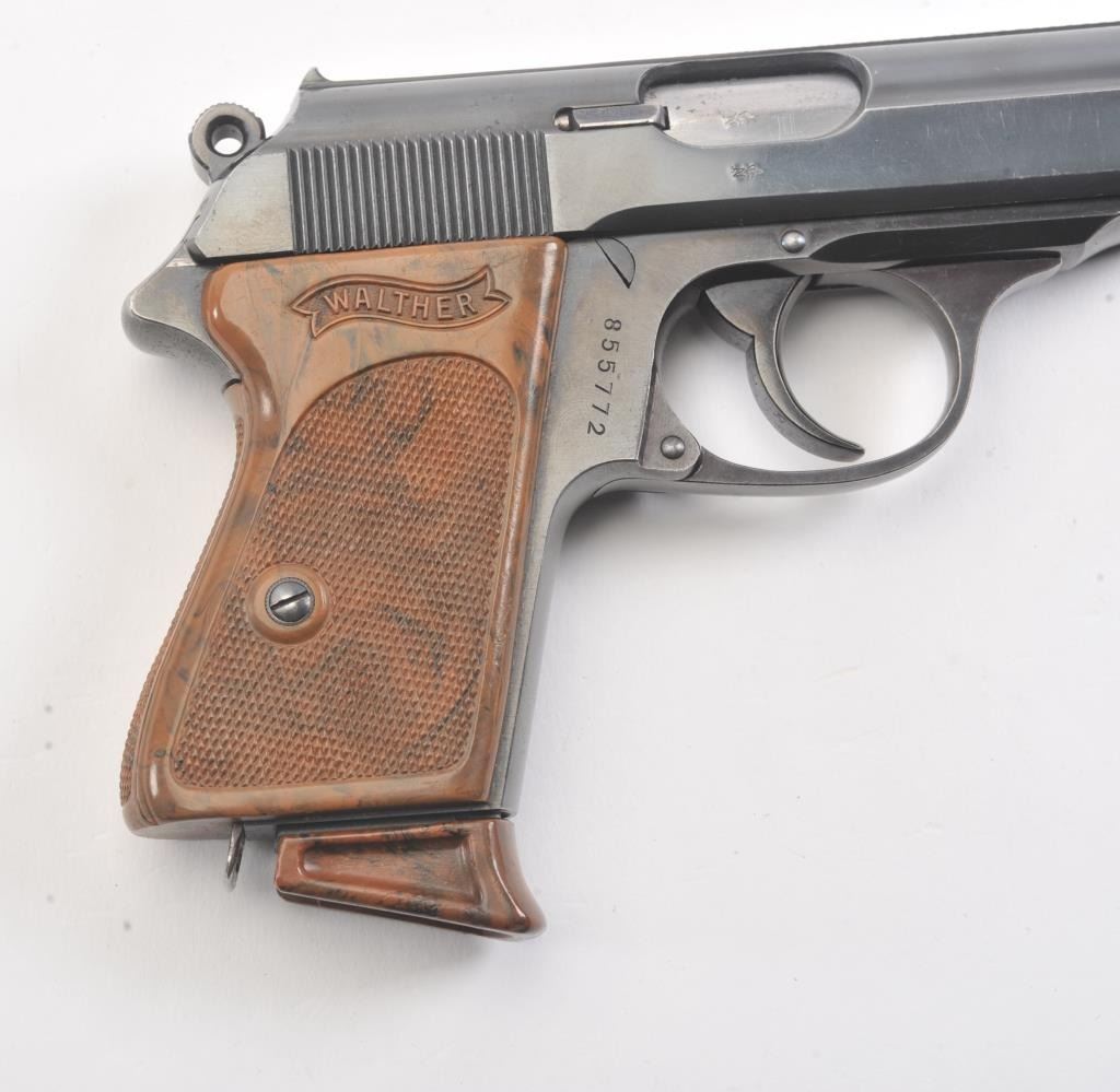 Pre-War Walther Model PPK semi-automatic pistol, 7.65 mm caliber, Serial #855772. The gun is in excellent overall condition retaining approximately 92%-98% of the original finish with only high point edgewear noted. The slide and barrel feature the crown over N proof with a 90 degree safety. The checkered brown plastic grips are exceptional with sharp checkering, showing no cracks and the lanyard ring is retained.The lot includes one correct Walther marked magazine with matching base. The bore is good, the action is crisp and the markings are sharp on this pre-WWII, pre-Nazi Model PPK, circa 1935. Est.: $500-$1,000. (C+R).
