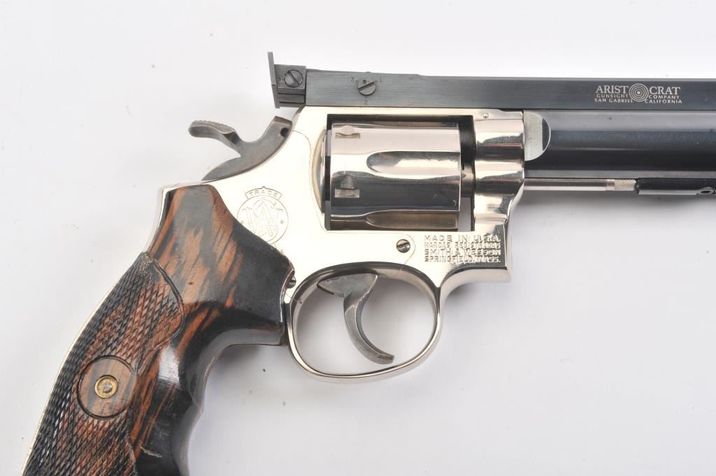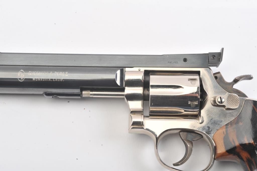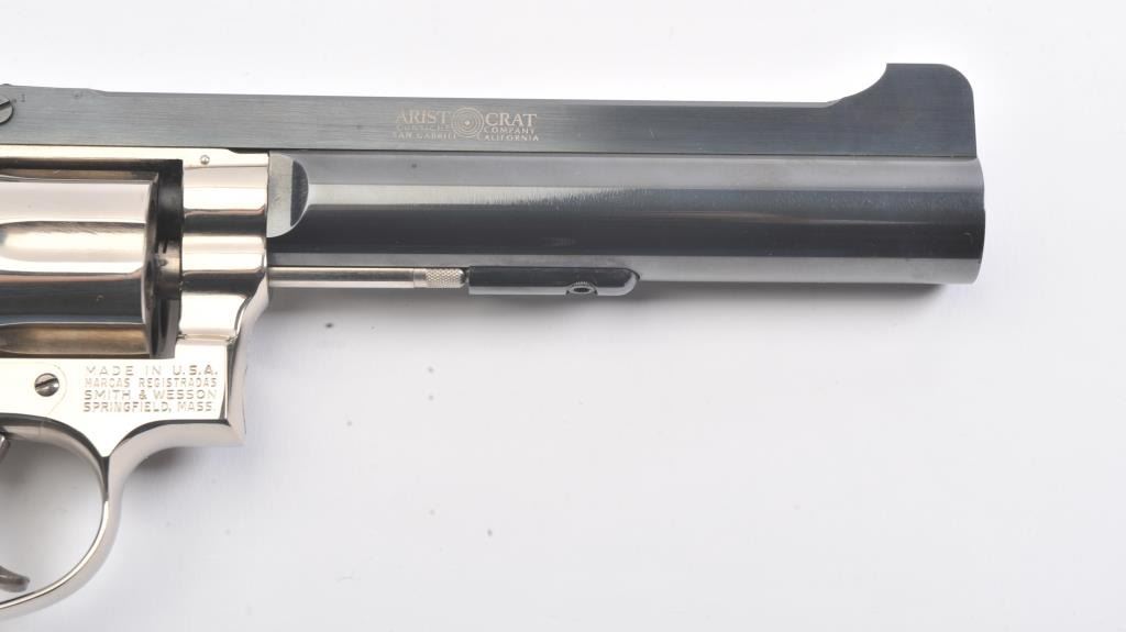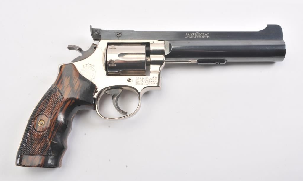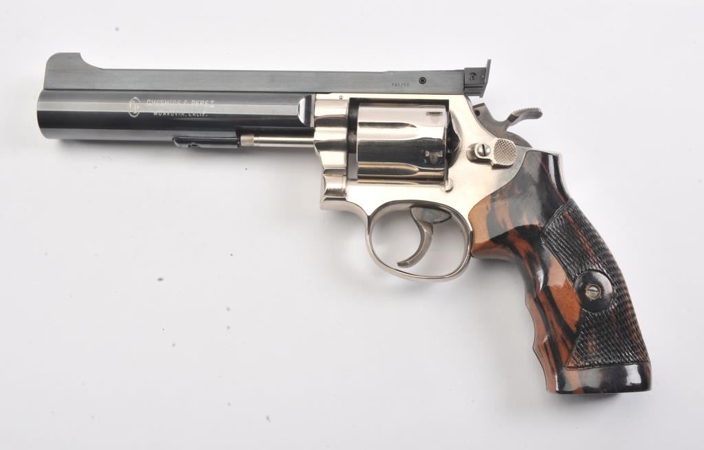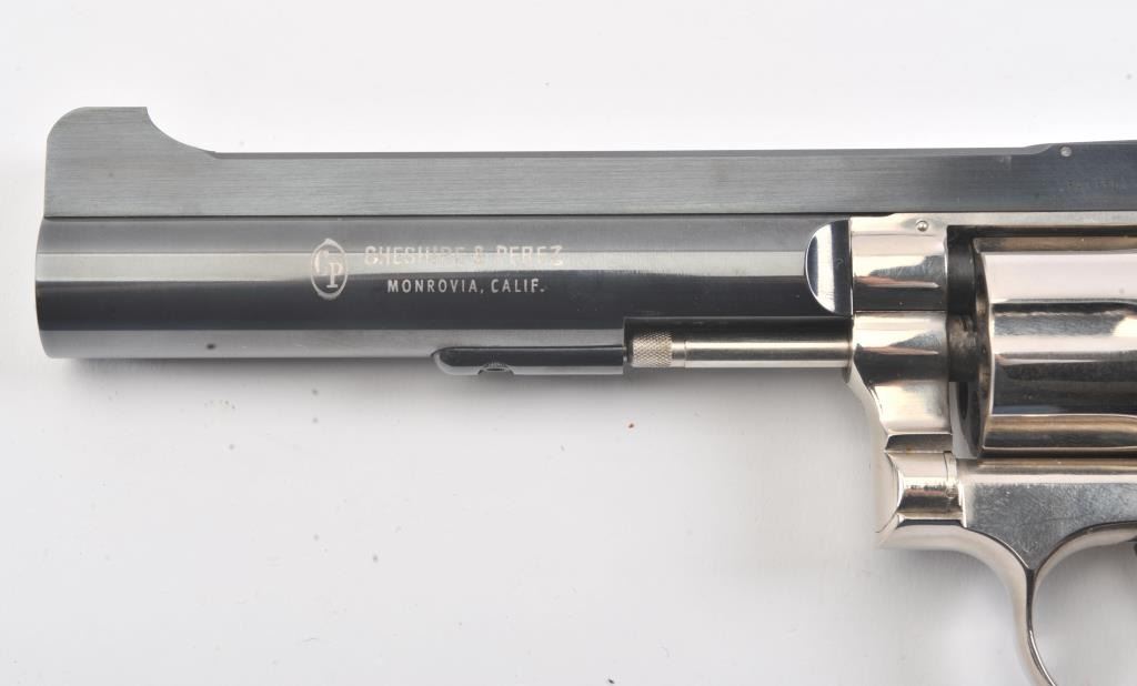 Custom Smith & Wesson Model 10-6 double action revolver, .38 caliber, Serial #2D67885. The pistol is in fine overall condition as customized by “CHESHIRE & PEREZ MONROVIA, CALIF.” The pistol features a 6”bull barrel with full-length target rib marked, “ARISTOCRAT GUN SIGHT COMPANY SAN GABRIEL CALIFORNIA.” The frame and cylinder are polished nickel while the hammer and trigger are muted case color. The checkeredwood custom combat grips are after-market and are in very good condition. The bore is good, the action is crisp and the markings are sharp. The lot includes a nylon belt holster. Est.: $750-$1,500.(Modern/PPT).