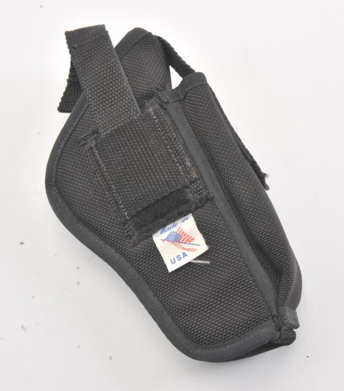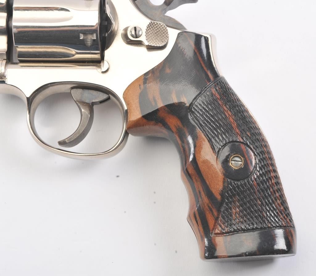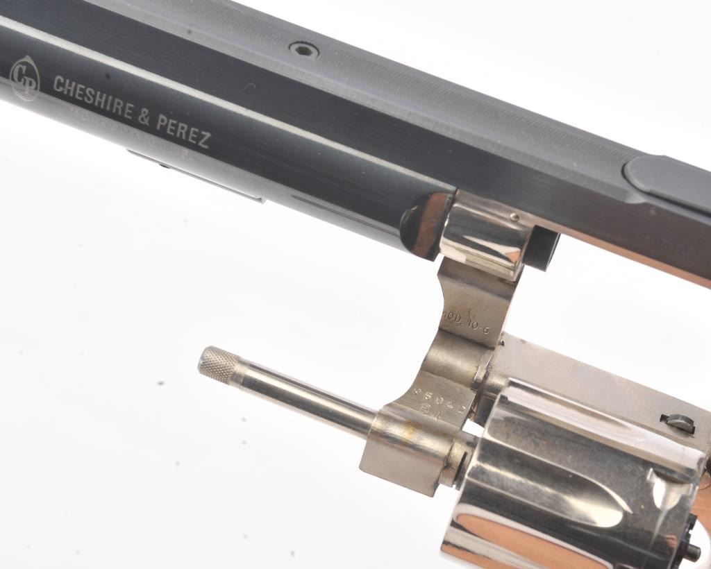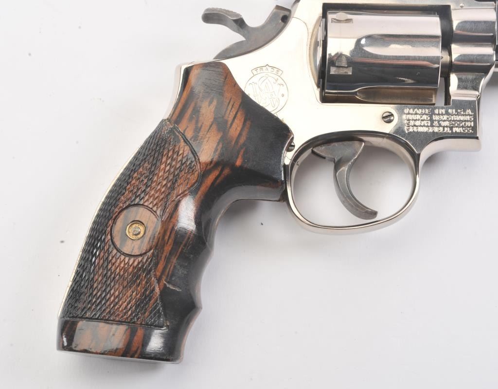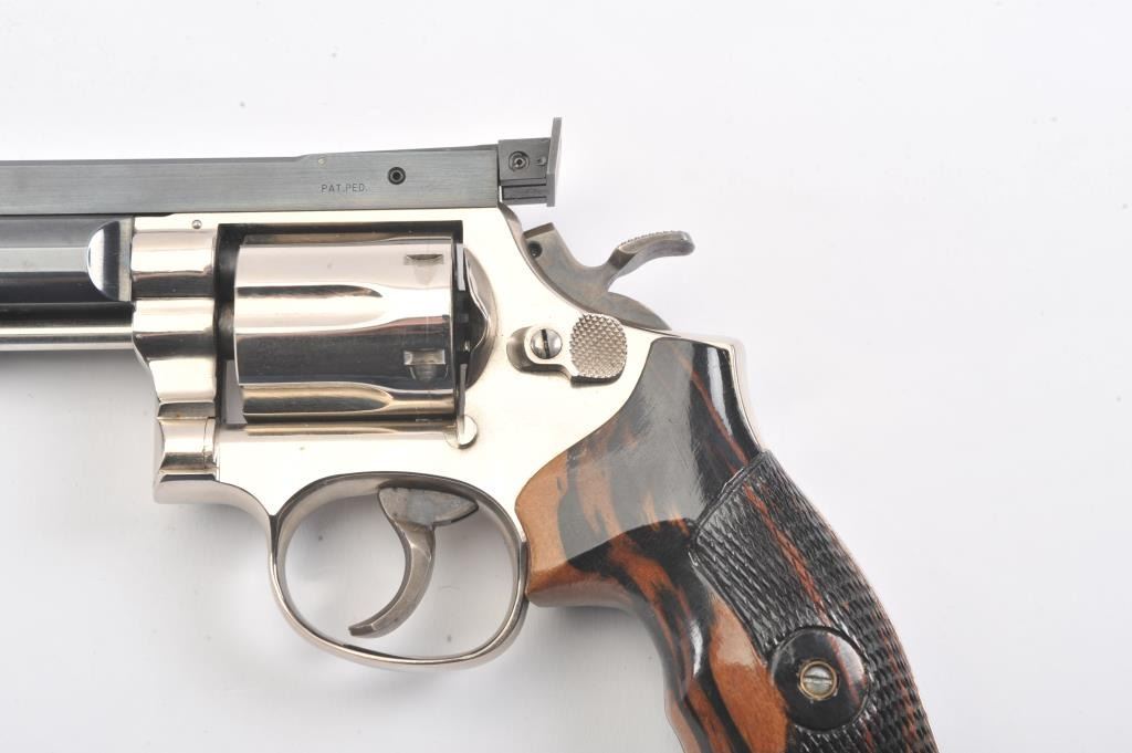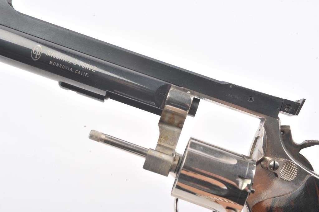Custom Smith & Wesson Model 10-6 double action revolver, .38 caliber, Serial #2D67885. The pistol is in fine overall condition as customized by “CHESHIRE & PEREZ MONROVIA, CALIF.” The pistol features a 6”bull barrel with full-length target rib marked, “ARISTOCRAT GUN SIGHT COMPANY SAN GABRIEL CALIFORNIA.” The frame and cylinder are polished nickel while the hammer and trigger are muted case color. The checkeredwood custom combat grips are after-market and are in very good condition. The bore is good, the action is crisp and the markings are sharp. The lot includes a nylon belt holster. Est.: $750-$1,500.(Modern/PPT).