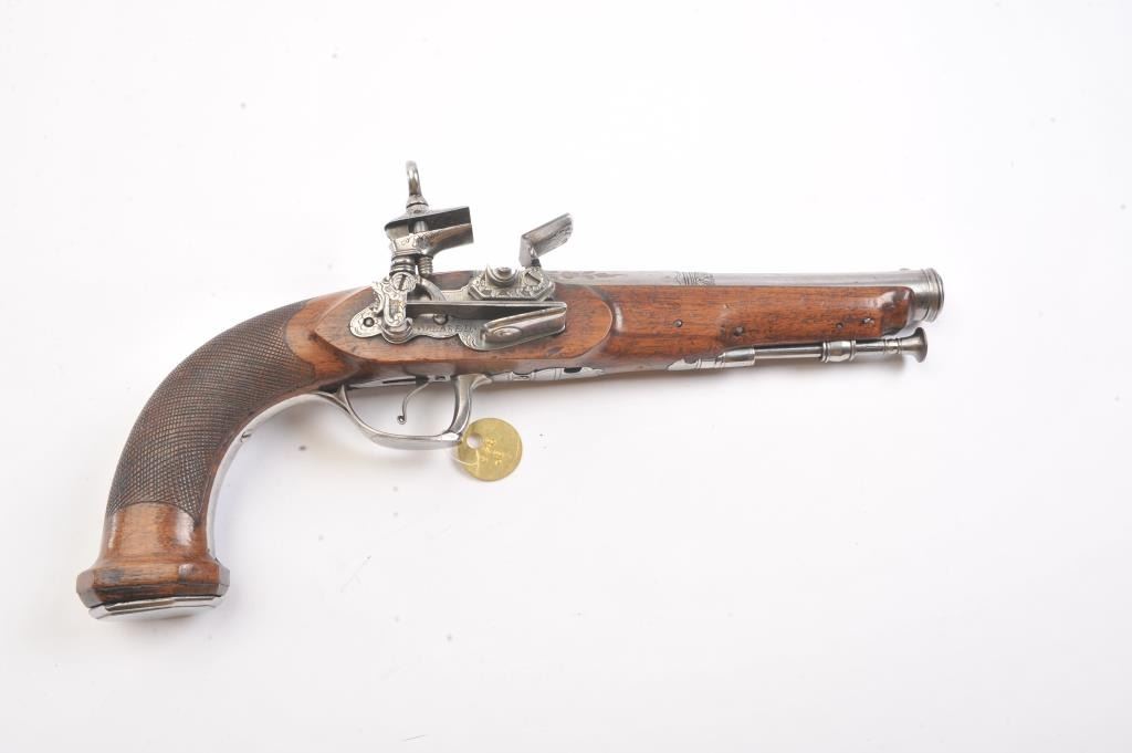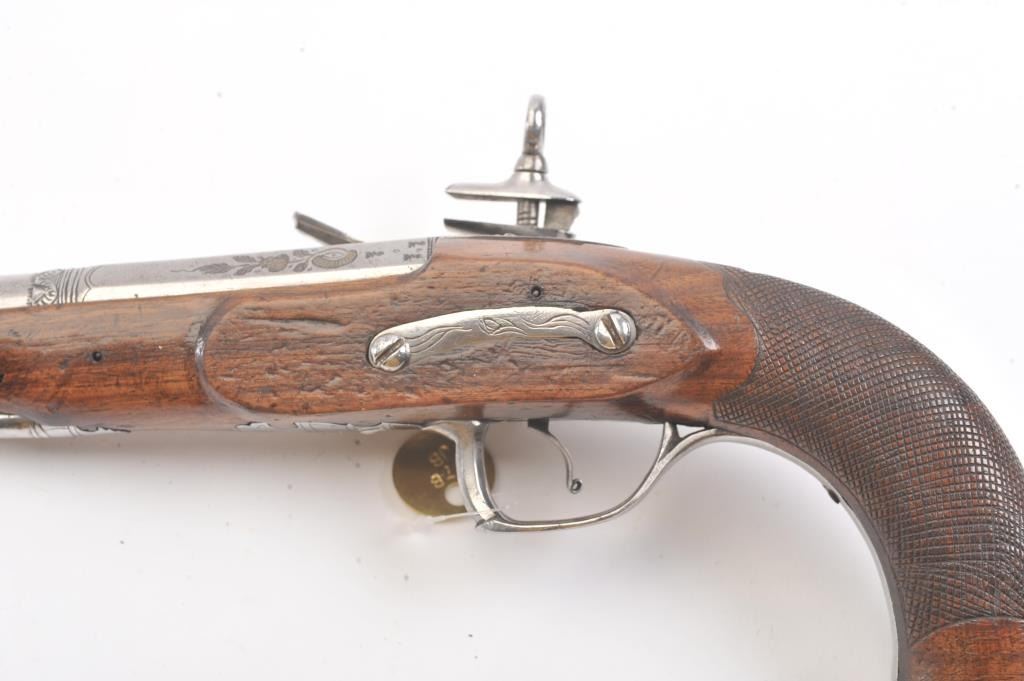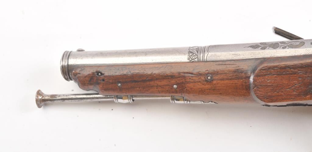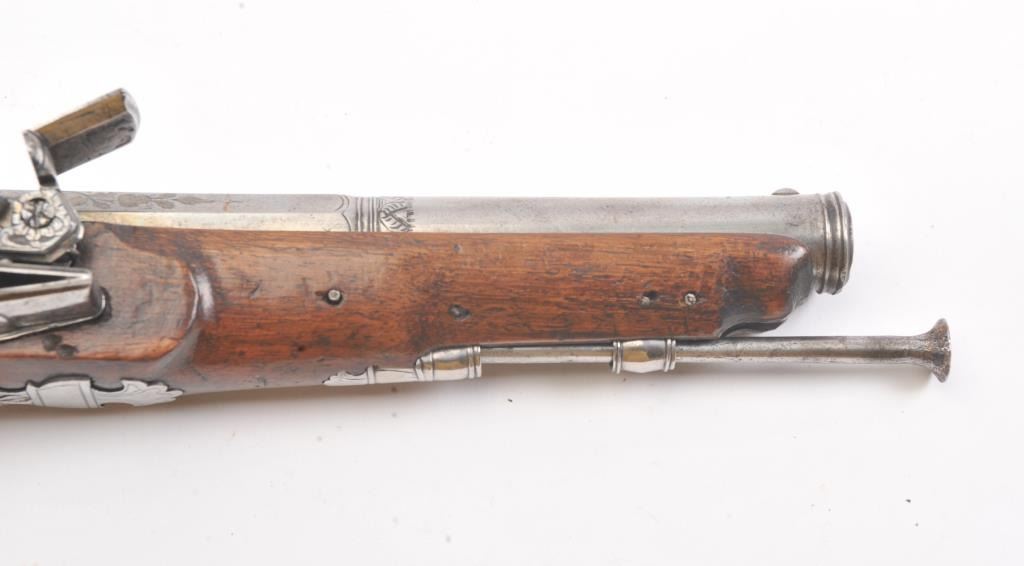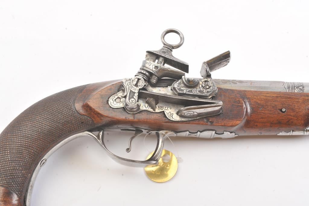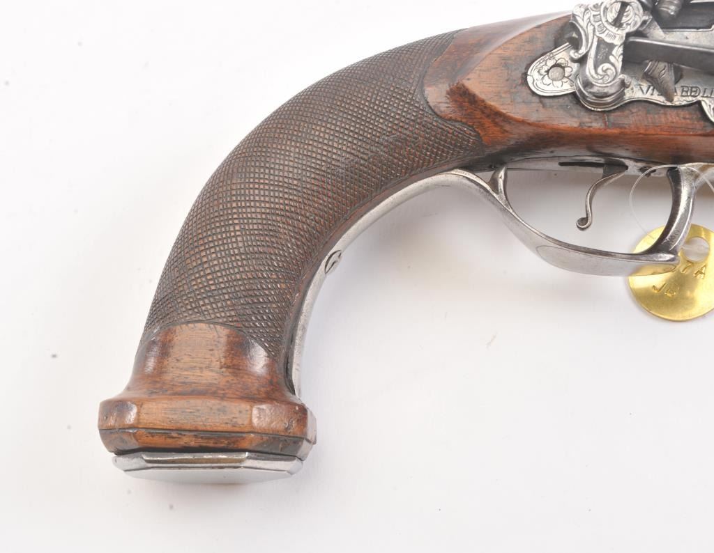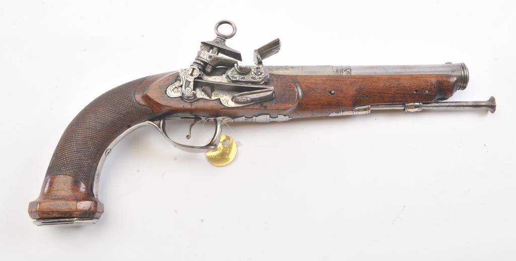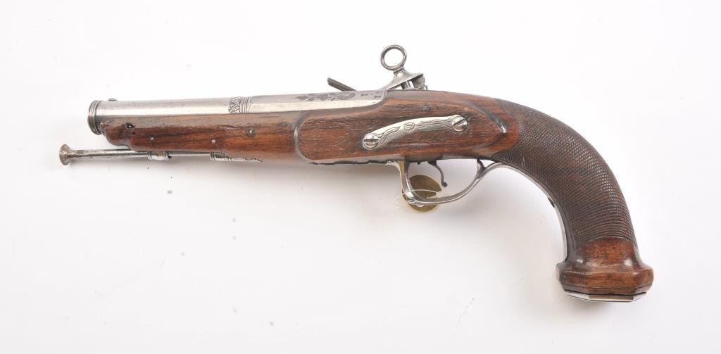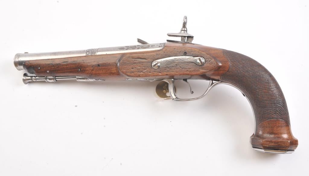 Pair of miquelet flintlock pistols from early 19th century signed "Vilar D(E)" on the locks with marked two stage cannon barrels showing marks CH over MA and lion along with silver inlays. Square butts of empire styleand showing good quality manufacture throughout. The metal is lightly cleaned and in very good condition and also the stocks are lightly refinished in the European tradition. Measures 13 1/2" overall with 71/4" barrel of .60 plus smoothbore caliber showing cannon type ring and nicely worked and decorated. A very nice pair of officer's type pistols that have Spanish and Italian characteristics. Ramrod is a periodreplacement.. (Antique) Est.: $1750-$3500