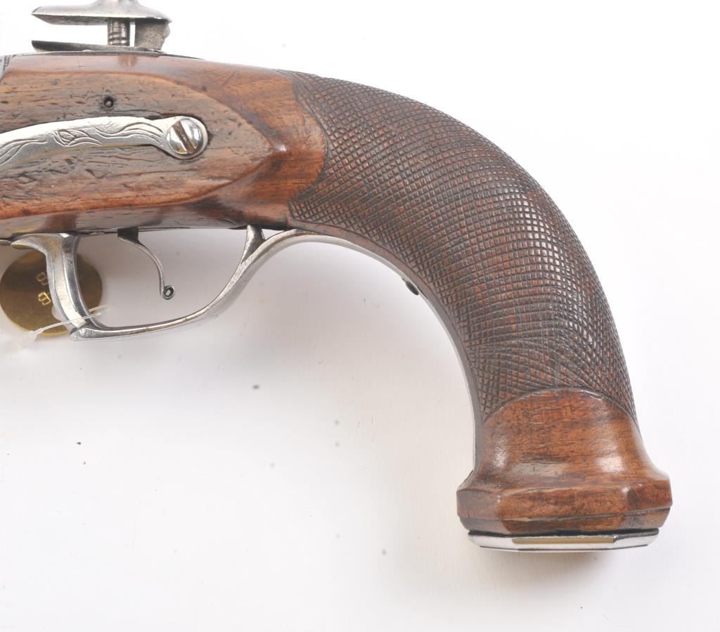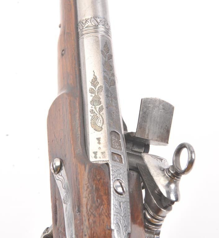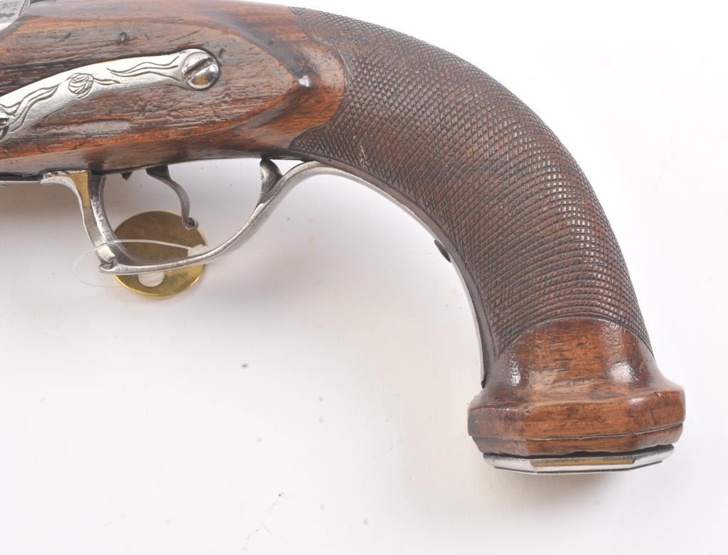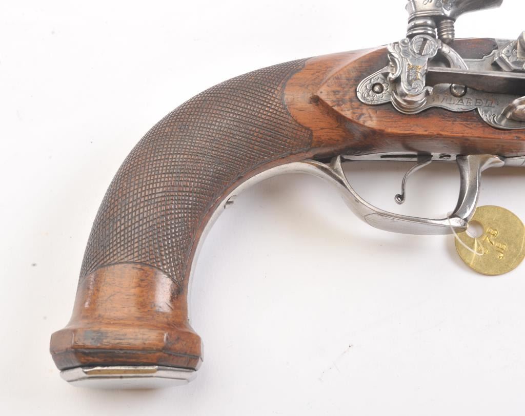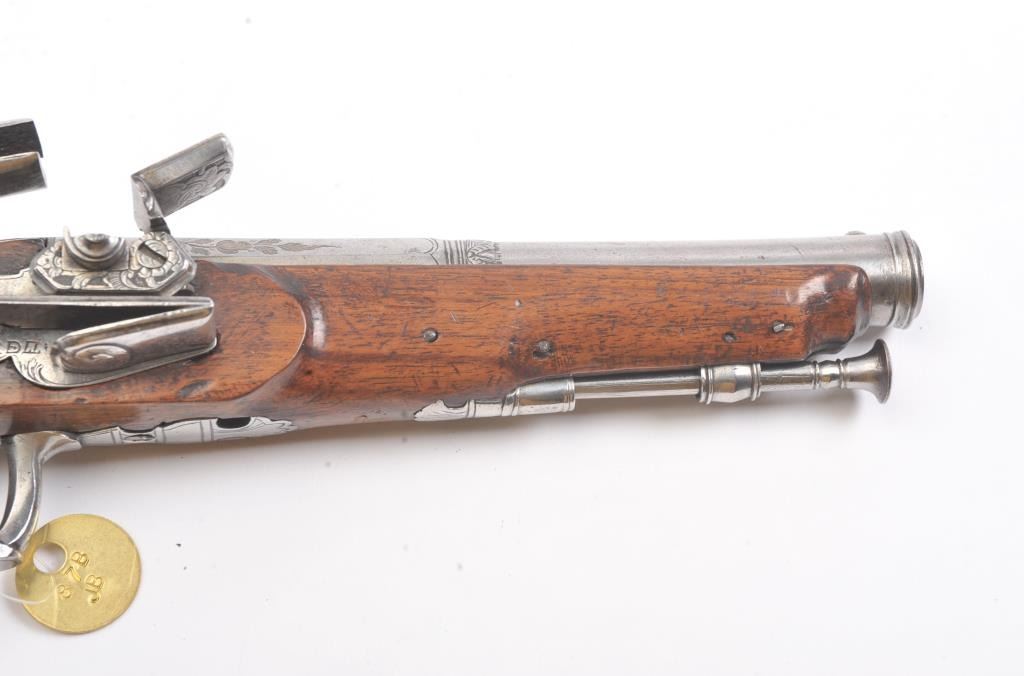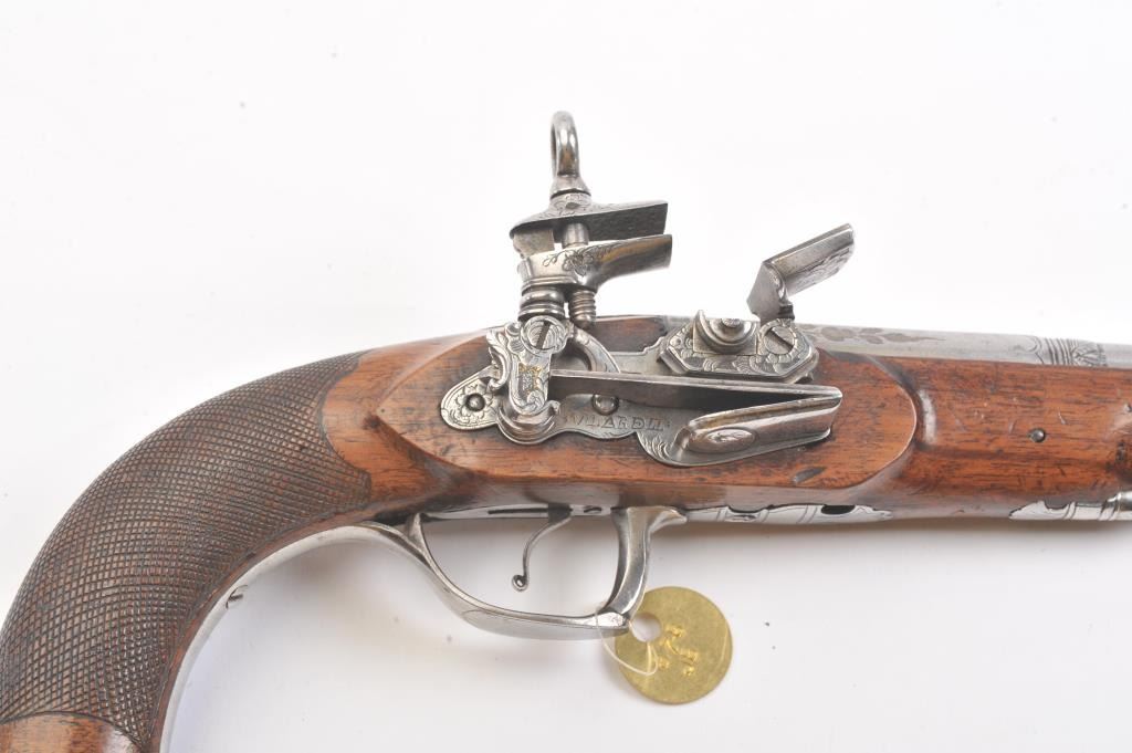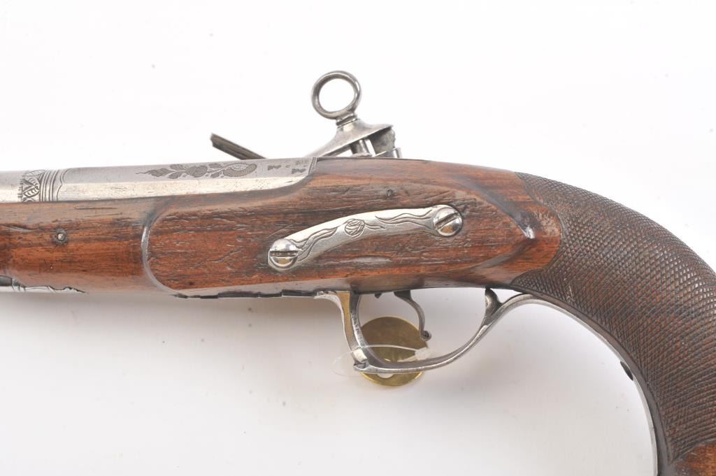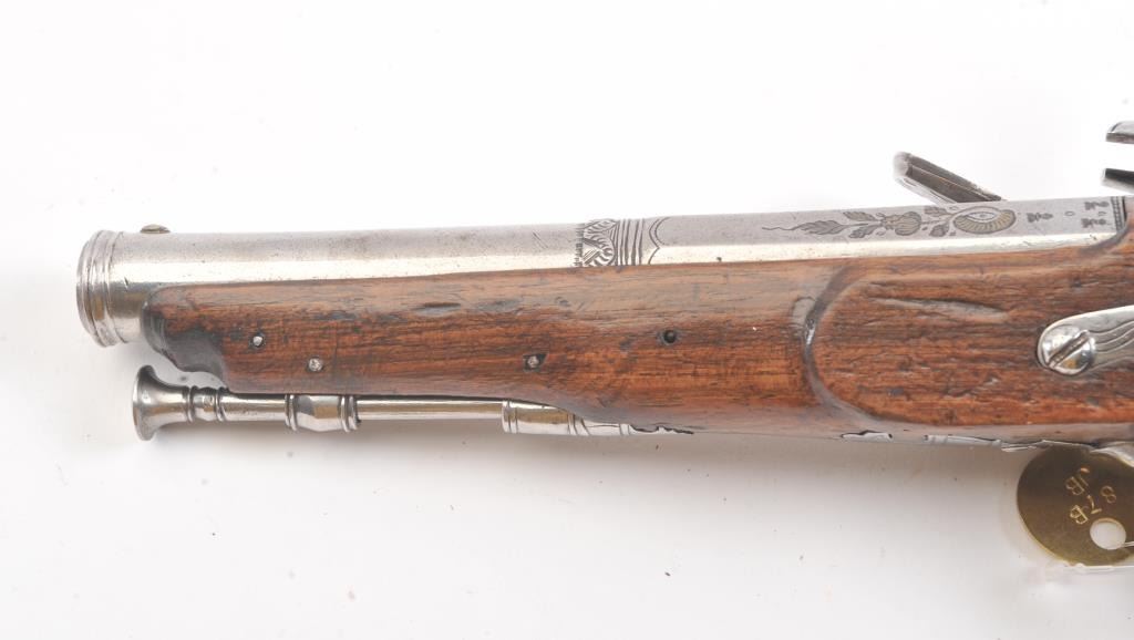 Pair of miquelet flintlock pistols from early 19th century signed "Vilar D(E)" on the locks with marked two stage cannon barrels showing marks CH over MA and lion along with silver inlays. Square butts of empire styleand showing good quality manufacture throughout. The metal is lightly cleaned and in very good condition and also the stocks are lightly refinished in the European tradition. Measures 13 1/2" overall with 71/4" barrel of .60 plus smoothbore caliber showing cannon type ring and nicely worked and decorated. A very nice pair of officer's type pistols that have Spanish and Italian characteristics. Ramrod is a periodreplacement.. (Antique) Est.: $1750-$3500