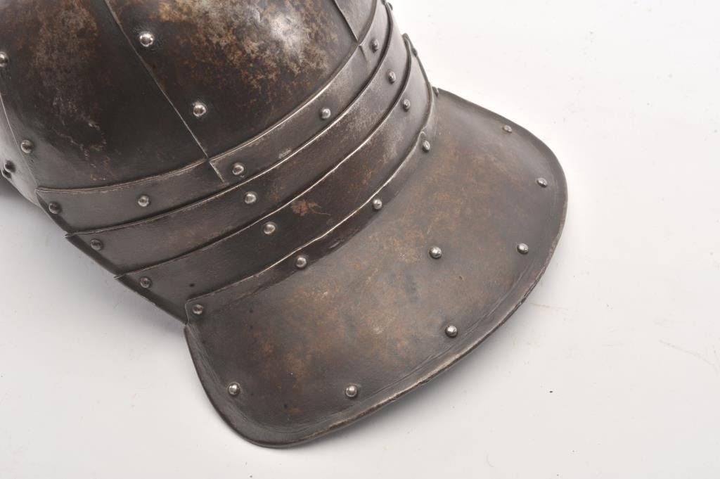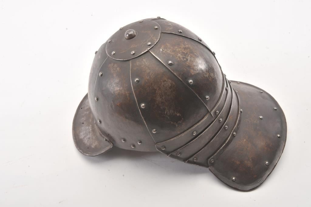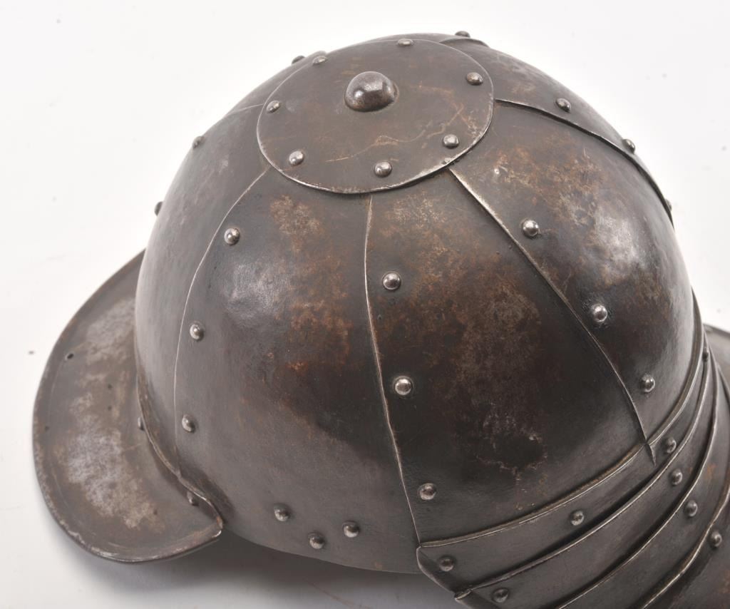 European lobster tail helmet circa 17th century with well forged and riveted heavy construction. Bowl shows 7 pieces nicely joined indicating early 1600s. Browned finish with bright studs. Brim and neck lamesauthentic to the period. A very nice helmet used from Eastern Europe to Poland. From old time collection. Weighs 4.85. Est.: $1250-$2500