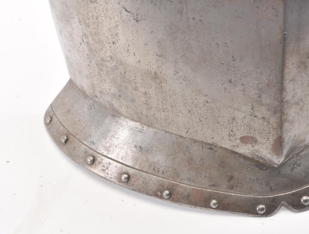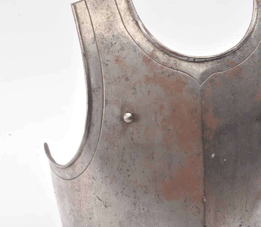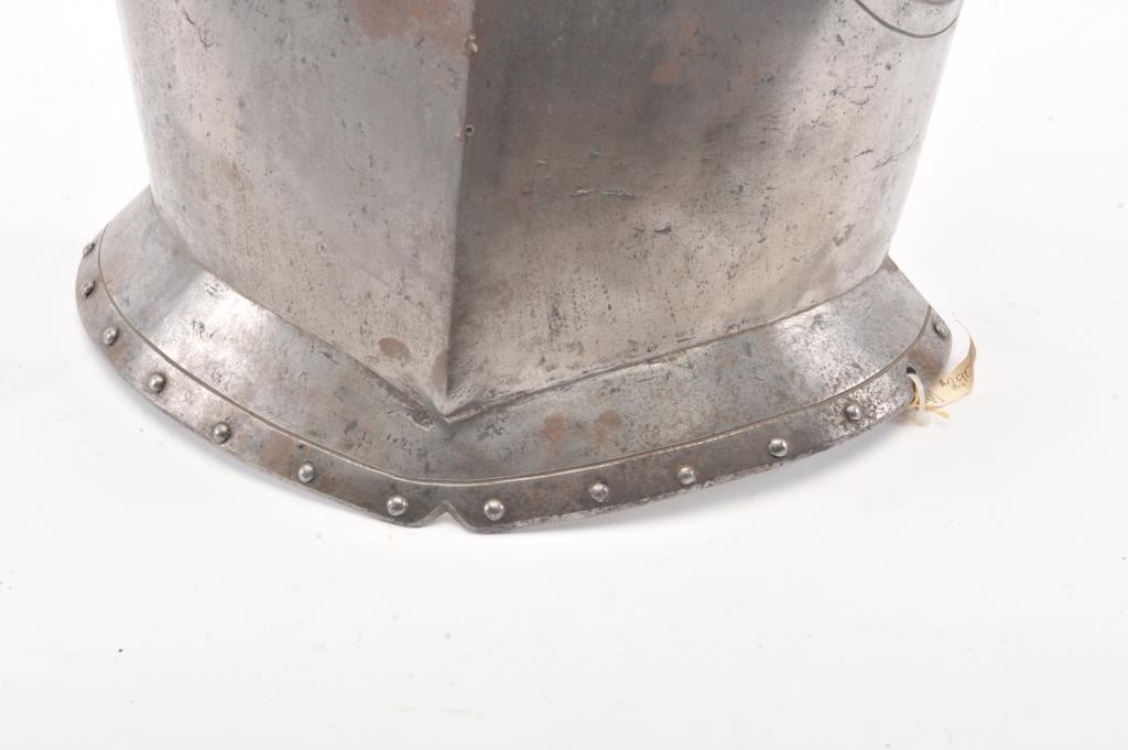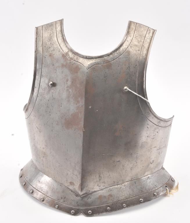 Early European breast plate circa 15th-16th century possibly Italian. Armourer marked but not recognized. Shows early style forging, rivets, slag and impurities in early metal work. Simple border engraving or lines.Measures 17" from top bottom and 18" around center of curve. Provenance Thomas Del Mar-Sothby's London. Just the type Columbus and new world explorers would have worn. Note: low point on this early element. Est.:$1500-$3000