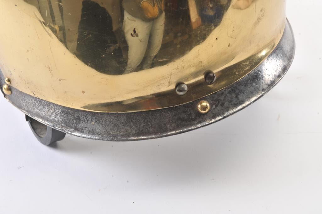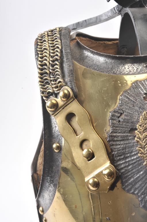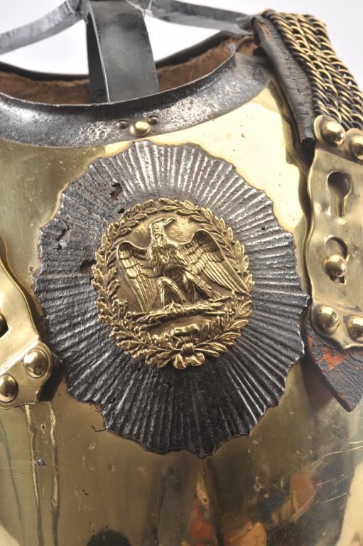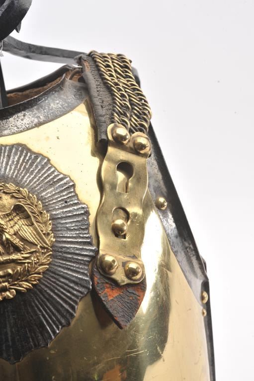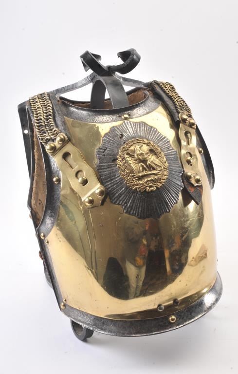 French Courasier armour from Maximillian era of Mexico (1864067) showing Hapsburg eagle at the center. Some deep pitting and has been kept polished and is nicely mounted on a well forged iron antique mounting that could beattached to a wall or stands on its own. Original old linen tag removed from back lining reads "Garoe Kurassier, Nerlich 3E.G.K.R. Waff 111". Est.: $1250-$2500