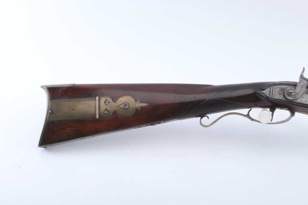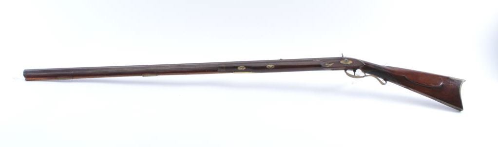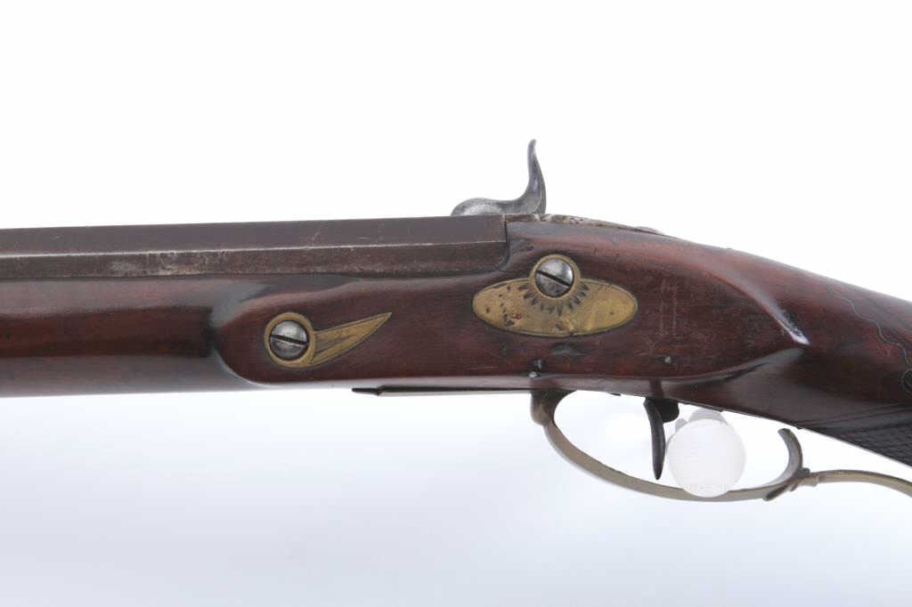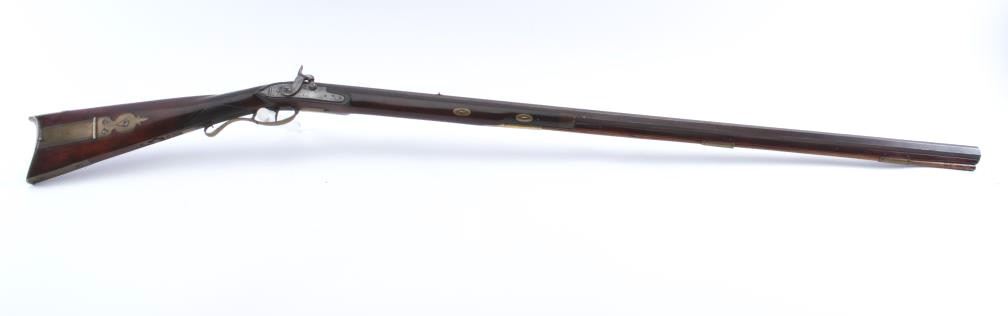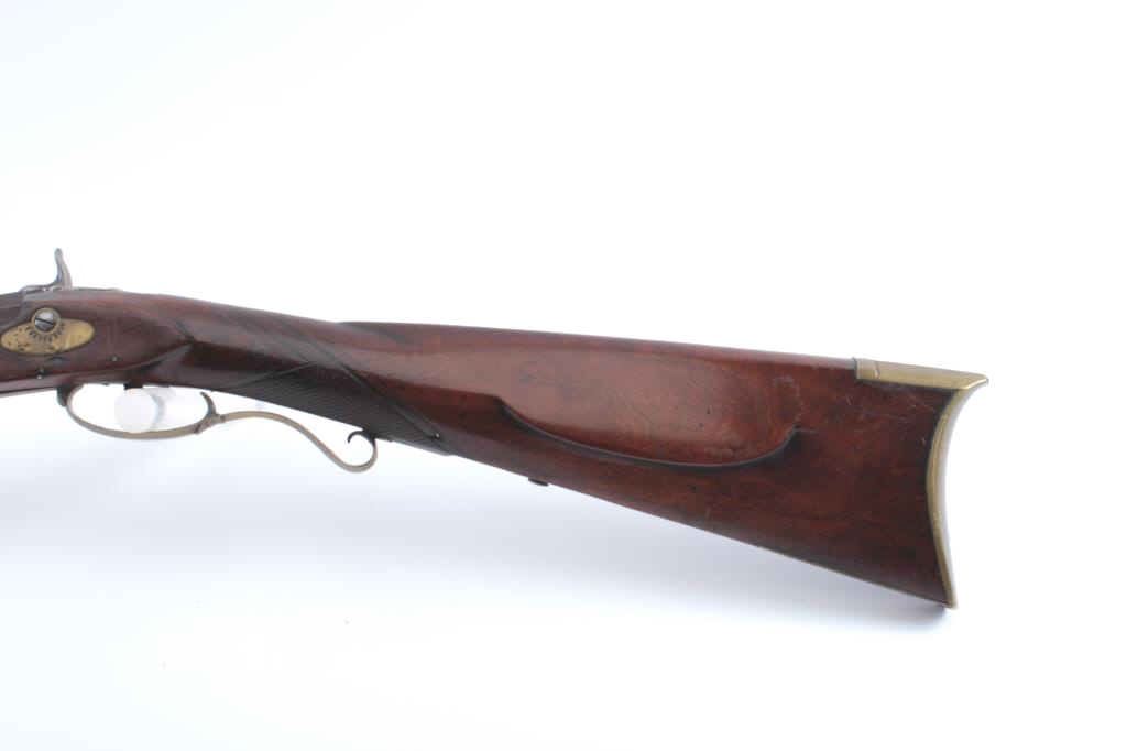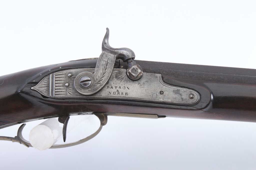 New England Flintlock rifle converted to percussion and stock reduced to half stock with lock marked "Payson & Nurse". Brass New England style patch box with wide butt and brass mounts. Measures 58" overall with a 41" octagon barrel of approximately .56-.58 caliber rifled. Interesting cap box with sliding door mounted behind trigger guard in belly of stock lightly checkered at the wrist and double barrel keys with wood rib beneath barrel. Very good plus condition with considerable brown and most original finish on the stock. A very nice New England rifle that probably went west. Note: Small wood repair on top rear of lock area where as apiece of splintered off wood nailed back. (Antique) Est.: $1250-$2500