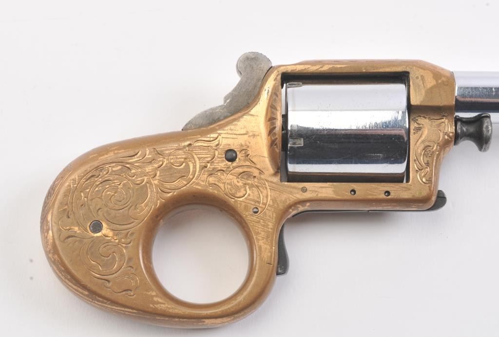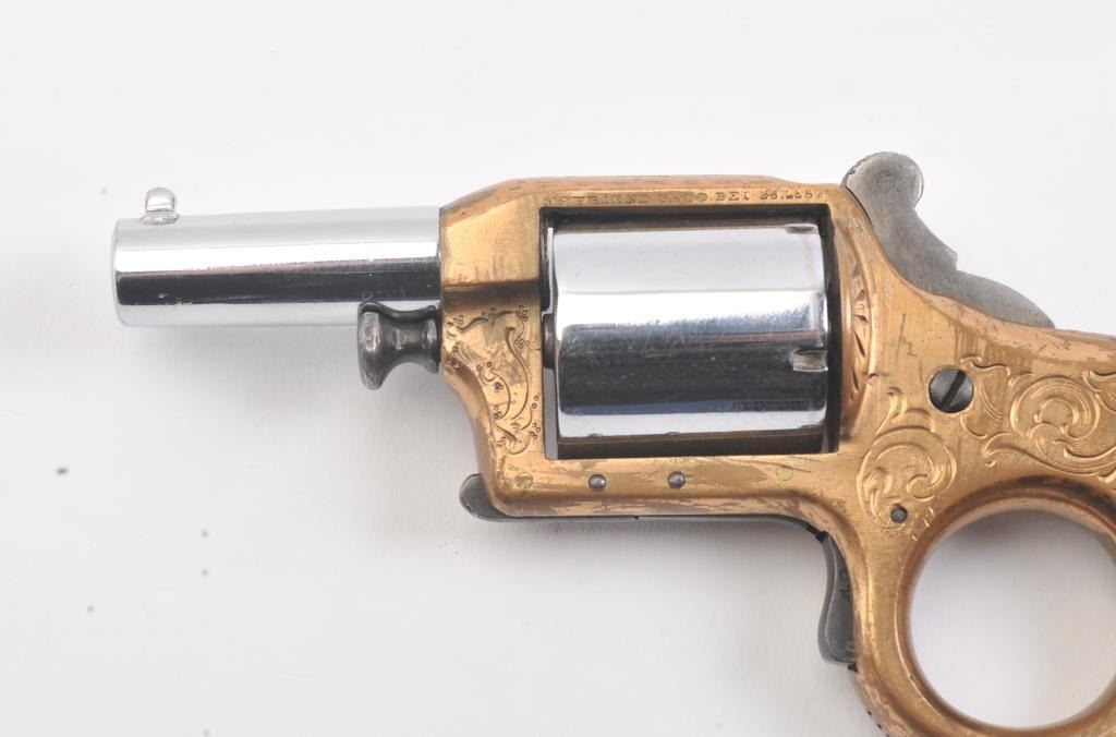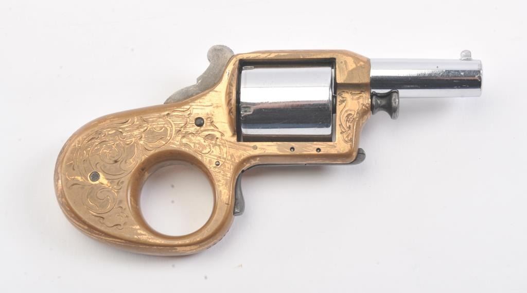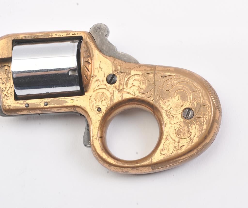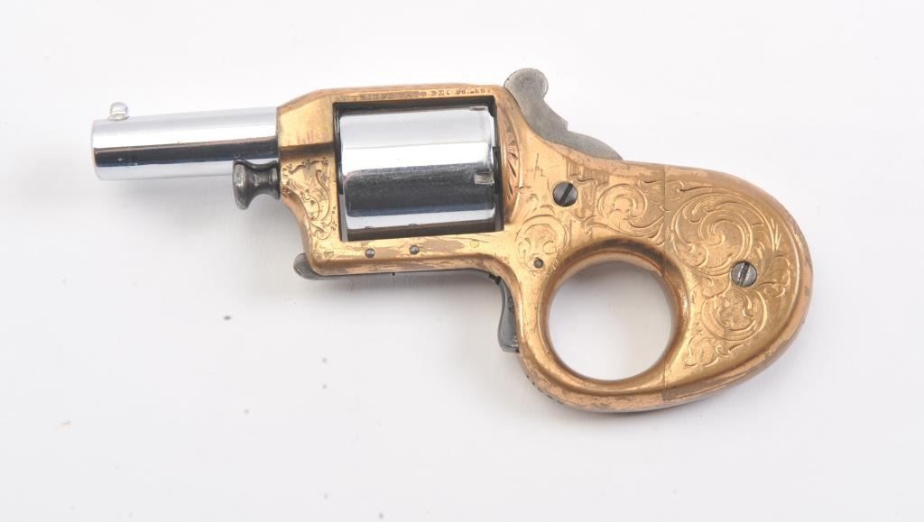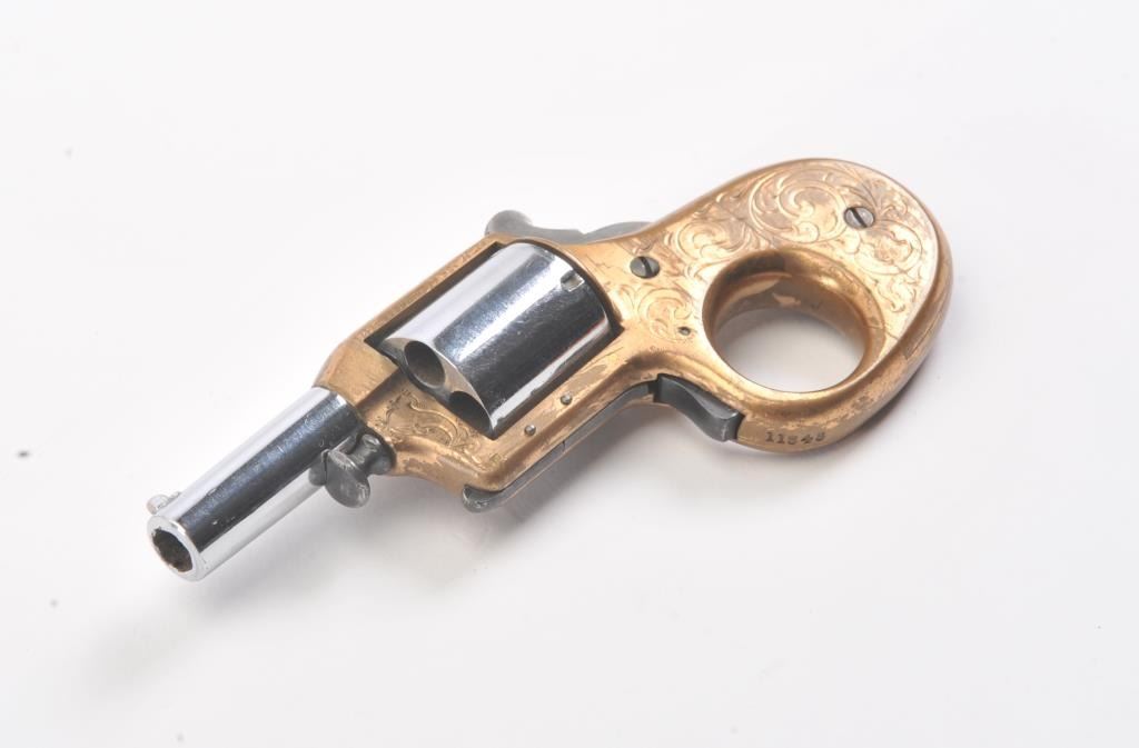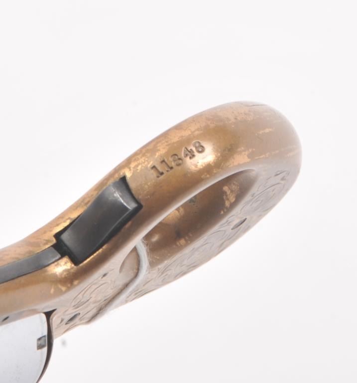 Reid “My Friend” knuckleduster pistol with a 2” barrel, .32 caliber, Serial #11848. The pistol is mentioned on page 169 of James Reid and his Knuckledusters by Taylor Bowen. Additionally, in Pageant of the Gun byPeterson, the pistol is referenced on page 157. The barrel is cut to 2” in length with post and blade sight, originally 3” in length. The barrel is marked, “MY FRIEND” as is the side of the frame. The engravedbrass frame still shows traces of gold gilt and the cylinder has been re-nickeled. The pistol is in good to very good overall condition and represents a rare variation with approximately 250 manufactured withbarrel. Est.: $1,000-$2,000. (Antique).