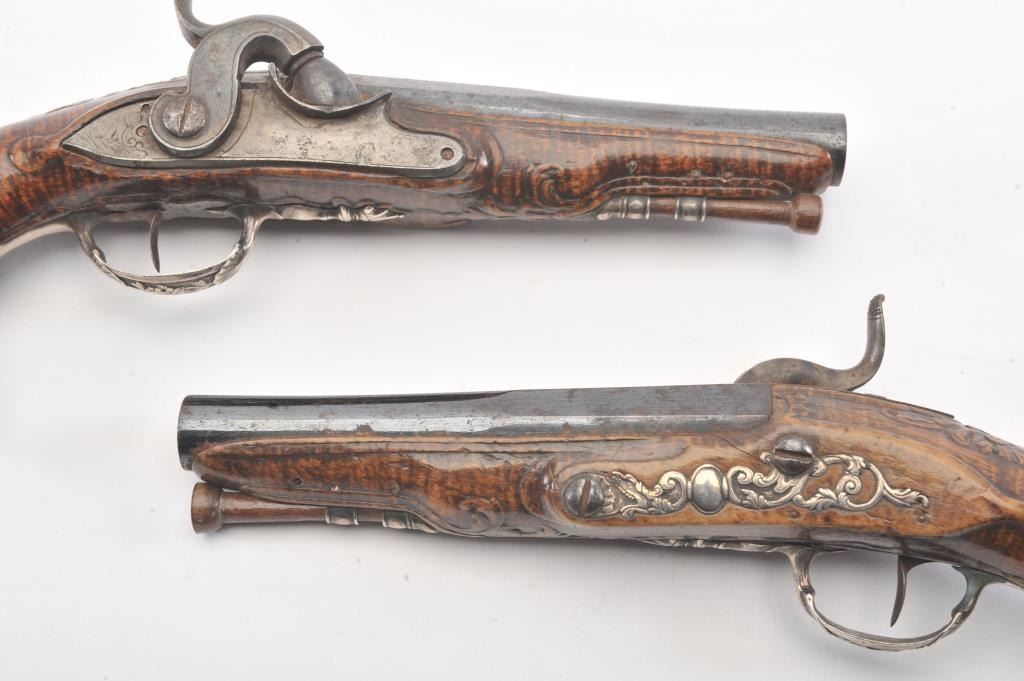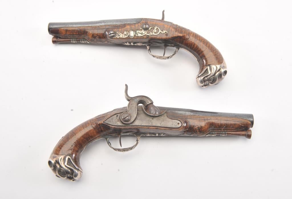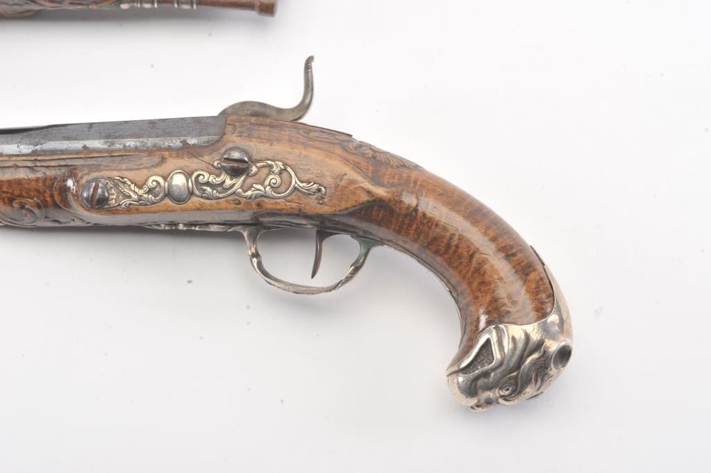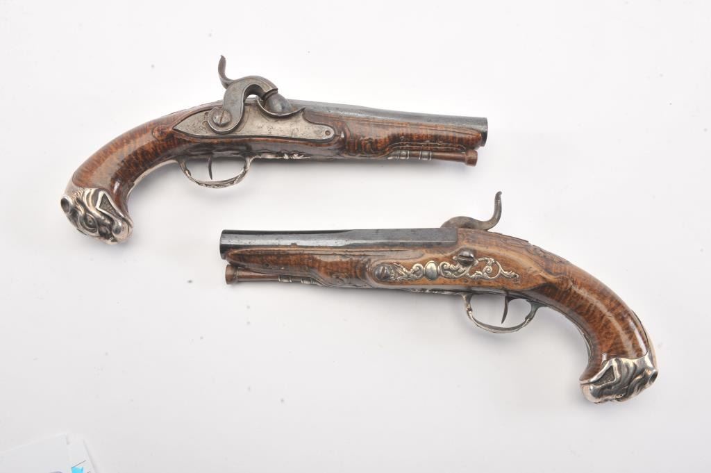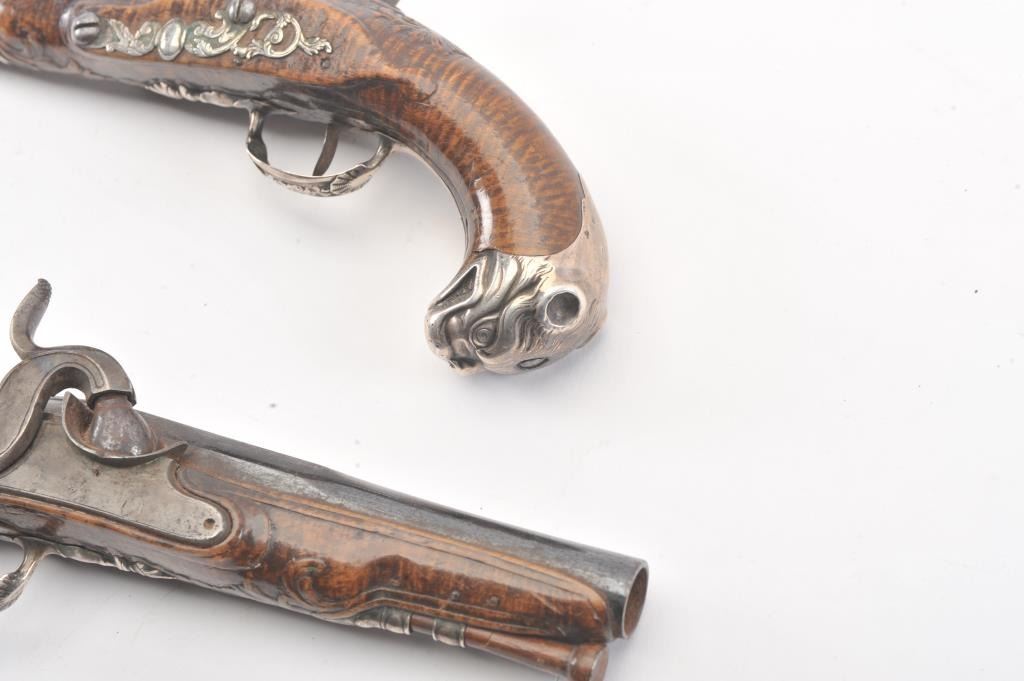 Pair of ornate silver mounted pocket pistols converted from flintlock to percussion. French styling with dog head butts, fancy trigger guards and side plates. Beautiful carved burl wood stocks. Most of its original blue on the barrels remain and the pistol is in very good plus to almost fine original condition overall. Measures 9 1/4" overall with 5" barrels in approximately .50-52 caliber smoothbore. Hand carved ramrods. Asmall almost undetectable repair to 1 fore stock. Originally circa 1760-1780s and converted Mid-19th century. (Antique) Est.: $1500-$3000