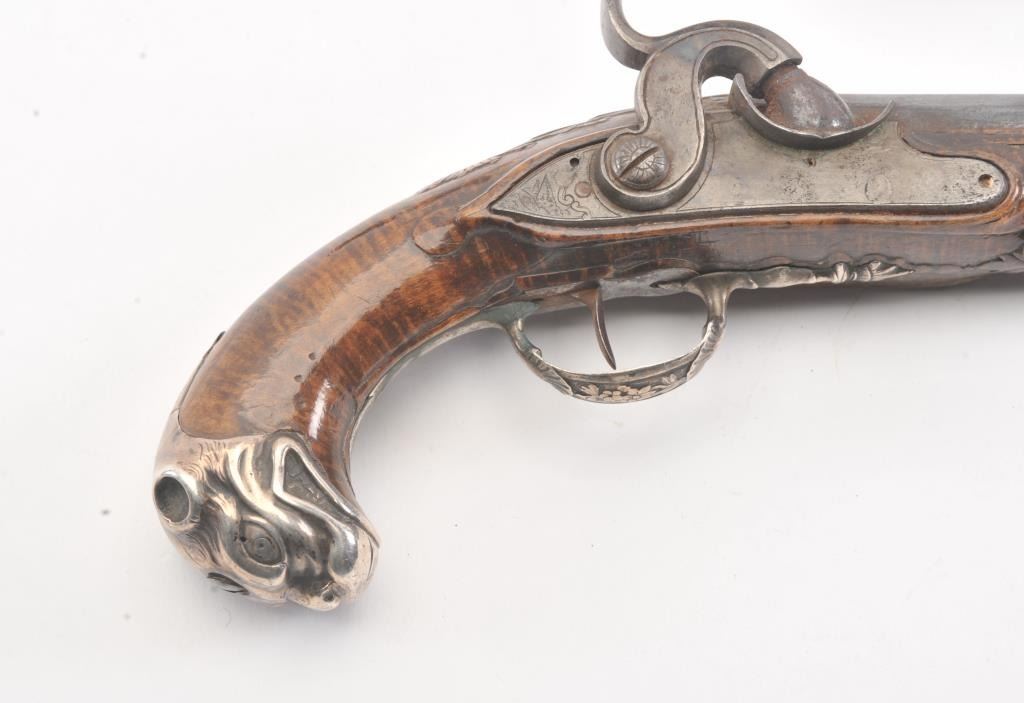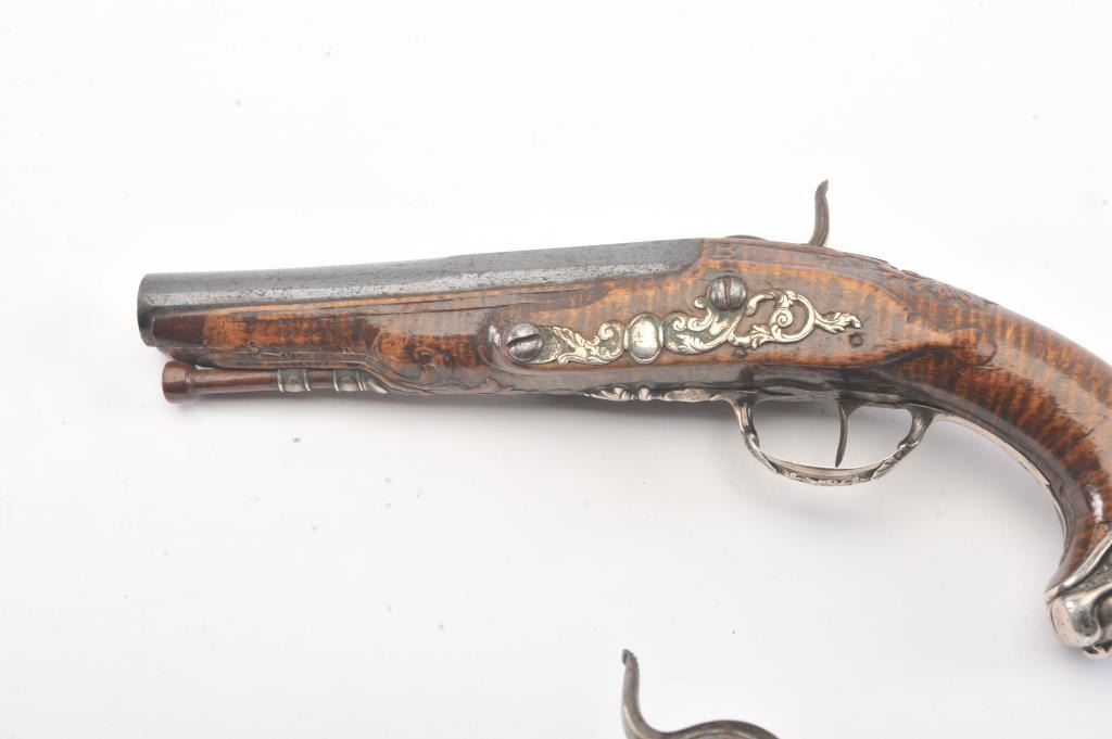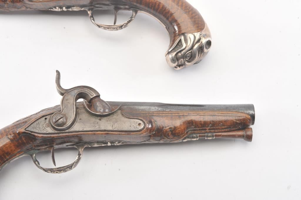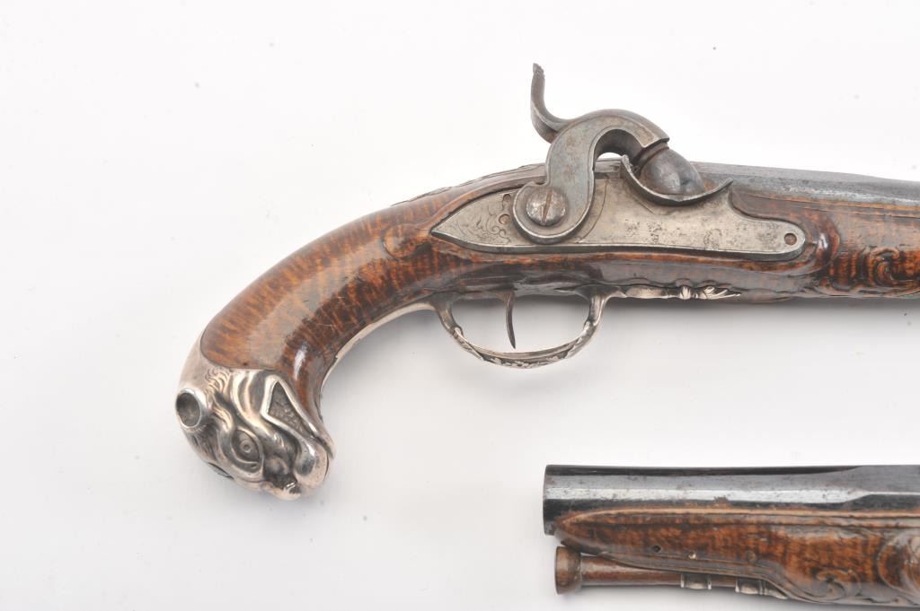 Pair of ornate silver mounted pocket pistols converted from flintlock to percussion. French styling with dog head butts, fancy trigger guards and side plates. Beautiful carved burl wood stocks. Most of its original blue on the barrels remain and the pistol is in very good plus to almost fine original condition overall. Measures 9 1/4" overall with 5" barrels in approximately .50-52 caliber smoothbore. Hand carved ramrods. Asmall almost undetectable repair to 1 fore stock. Originally circa 1760-1780s and converted Mid-19th century. (Antique) Est.: $1500-$3000