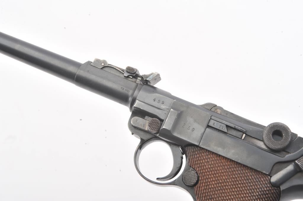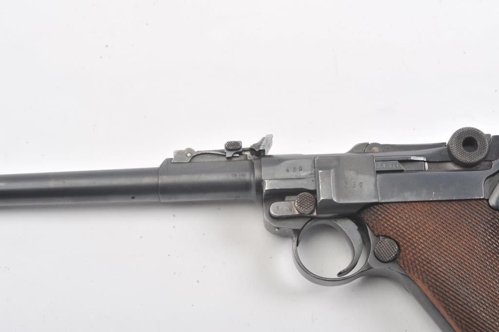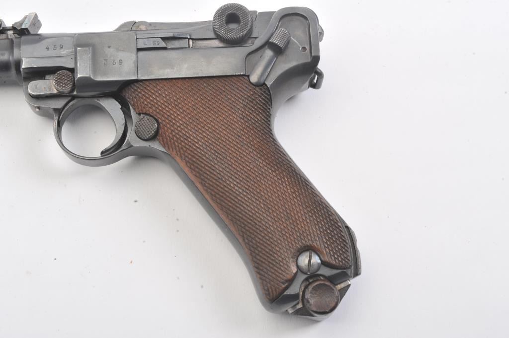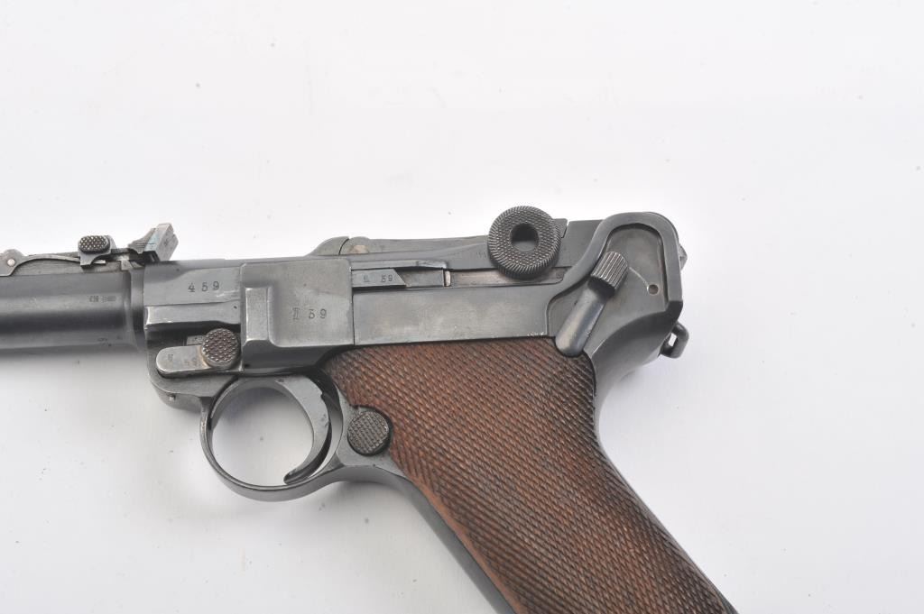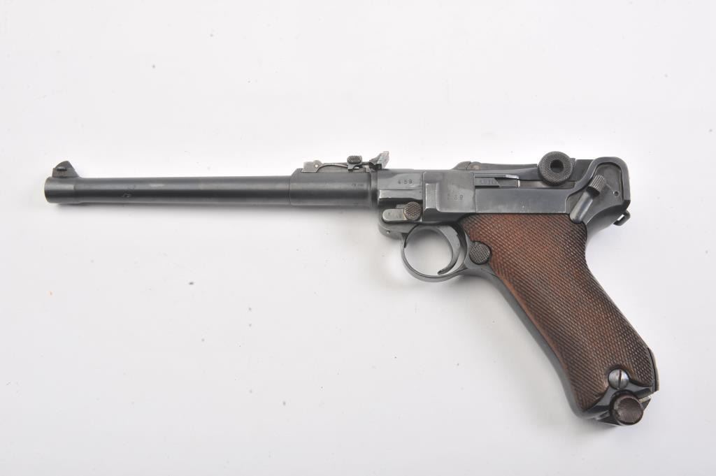 Artillery Luger by Erfurt Arsenal, 1914-dated, S/N 459; 9mm caliber with 8” barrel showing 95-98% of an old, possibly arsenal refinish; good markings and fairly crisp edges. Fine tuning front and rearsights; matching S/Ns except clip; grips are good to very good with minor wear and slight imperfections; bore is bright and action works well. The pistol does not on first inspection appear re-blued except thetrigger, safety and muzzle are blue which indicates refinishing; includes an original holster in good condition, reproduction stock, rod and takedown tool. A very presentable early Artillery!(Antique). Est.: $2,250-$4,500.