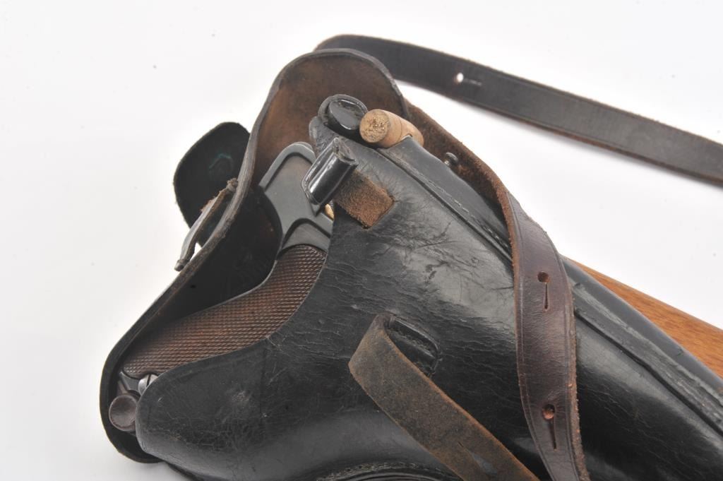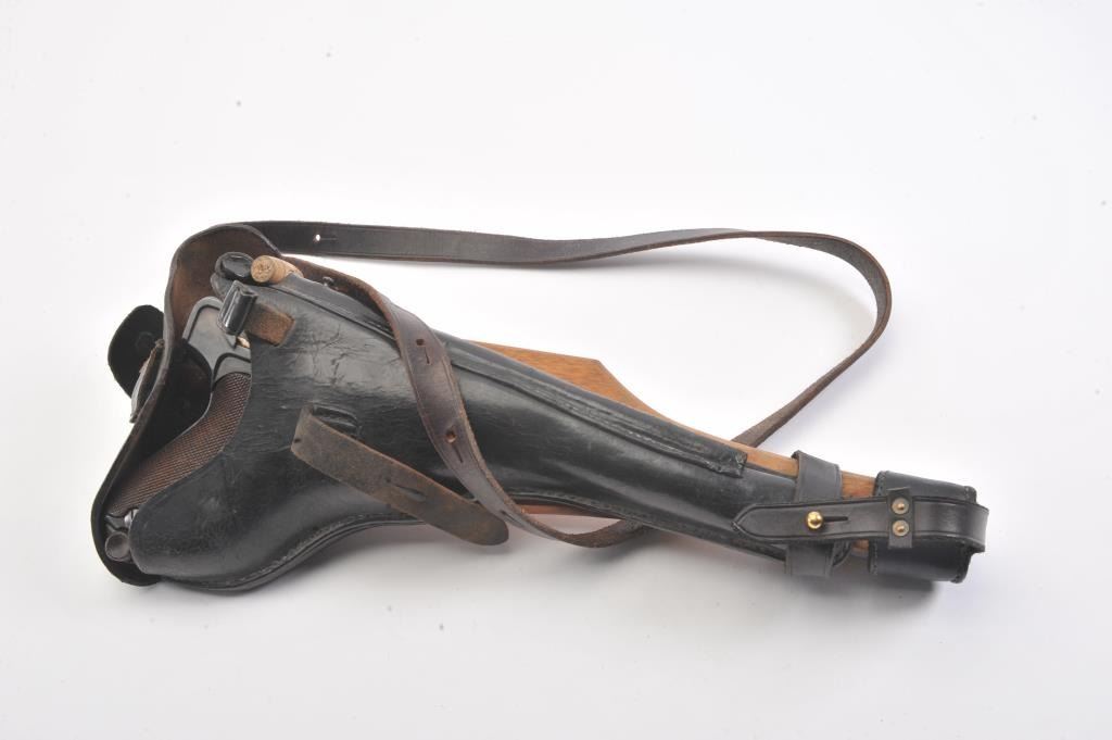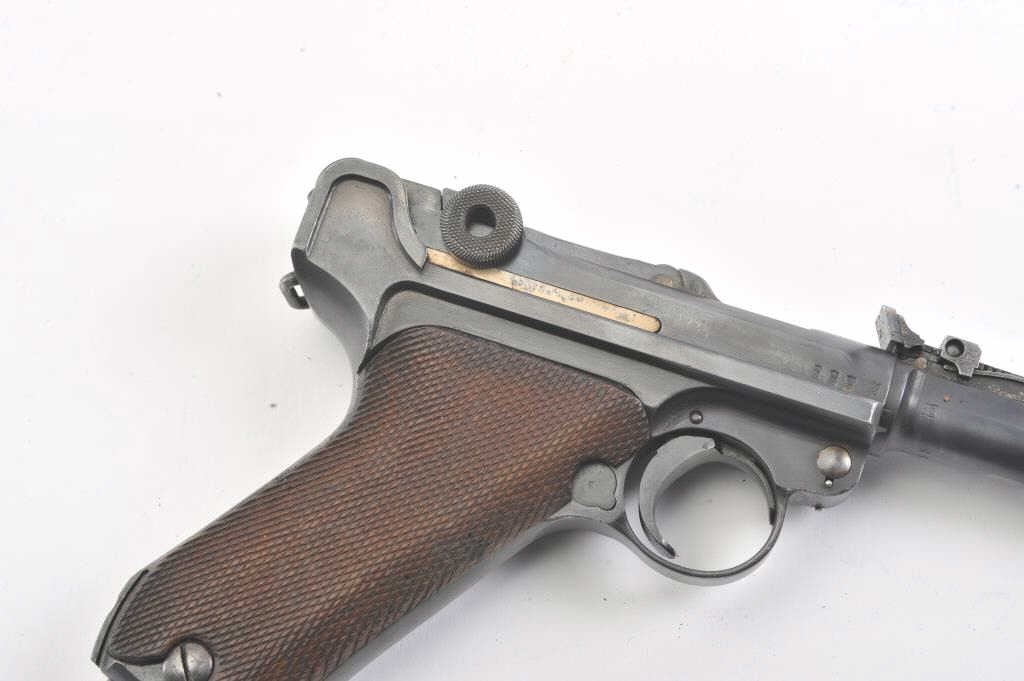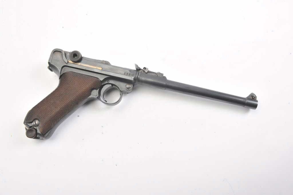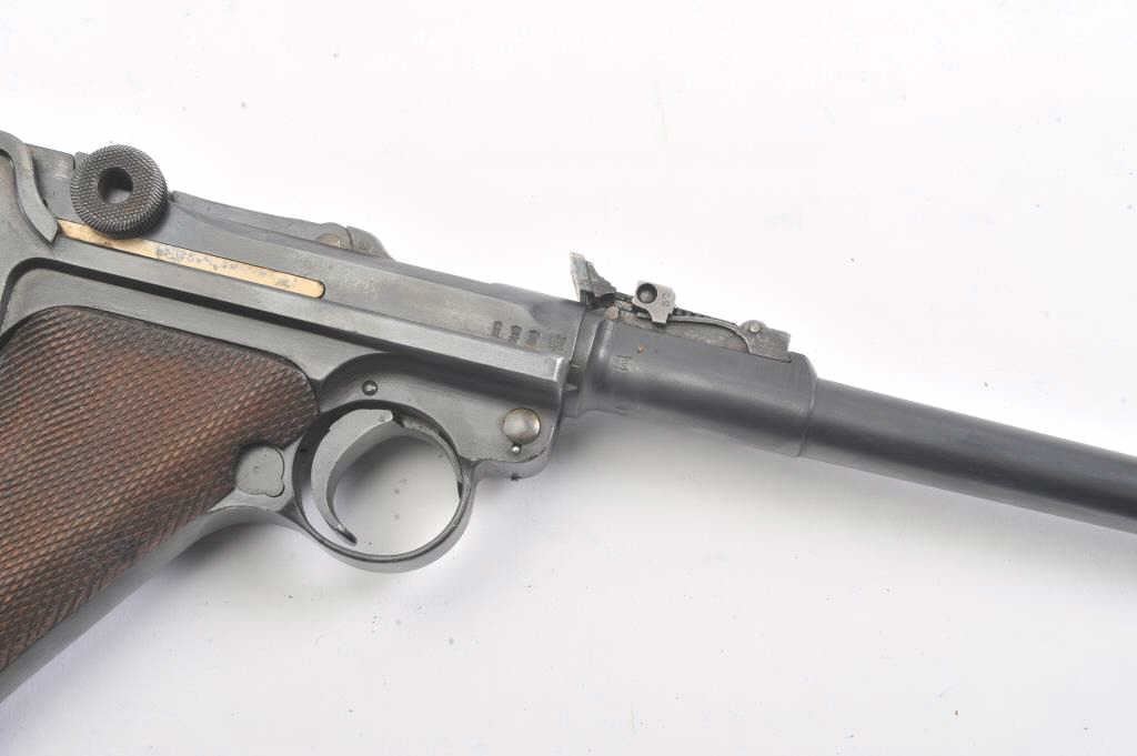 Artillery Luger by Erfurt Arsenal, 1914-dated, S/N 459; 9mm caliber with 8” barrel showing 95-98% of an old, possibly arsenal refinish; good markings and fairly crisp edges. Fine tuning front and rearsights; matching S/Ns except clip; grips are good to very good with minor wear and slight imperfections; bore is bright and action works well. The pistol does not on first inspection appear re-blued except thetrigger, safety and muzzle are blue which indicates refinishing; includes an original holster in good condition, reproduction stock, rod and takedown tool. A very presentable early Artillery!(Antique). Est.: $2,250-$4,500.