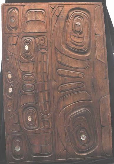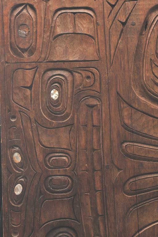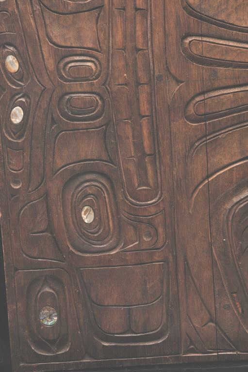 Carved cedar Northwest coast plaque with pearl inlays. 1920s-40s. Measures 24" in height by 15 1/2" in width. Some age but very good. Est.: $1400-$2800