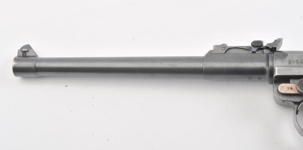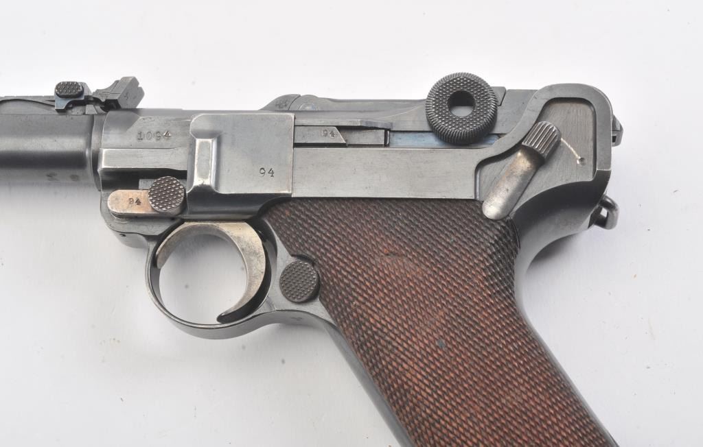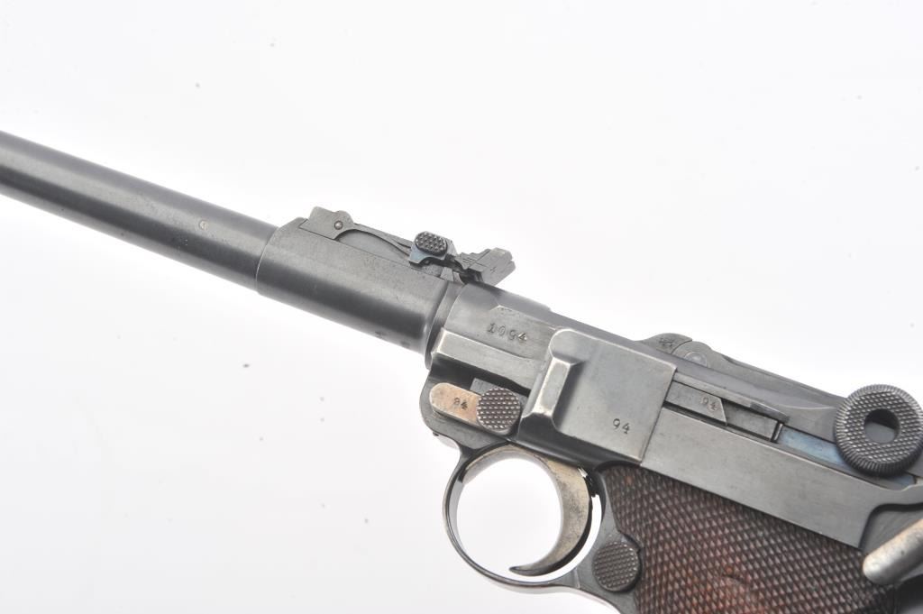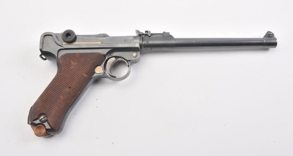 1916 dated artillery Luger by D.W.M. with an 8” barrel in 9mm caliber showing fine tuning front and rear sights, S/N 1094. Remaining in near fine condition with 95% plus original blue and 50%-70% straw on small parts. Someminor loss of finish on muzzle, side plate and contact points. Sharp edges and markings. The grips are very good plus with minor imperfections and slight wear. All matching visible serial numbers except magazine whichis proofed and numbered 4650. The interior is clean and crisp with bright bore. No import marks. A strong 9 on a 1-10 scale from local estate. (C&R/PPT) Est.: $2000-$4000