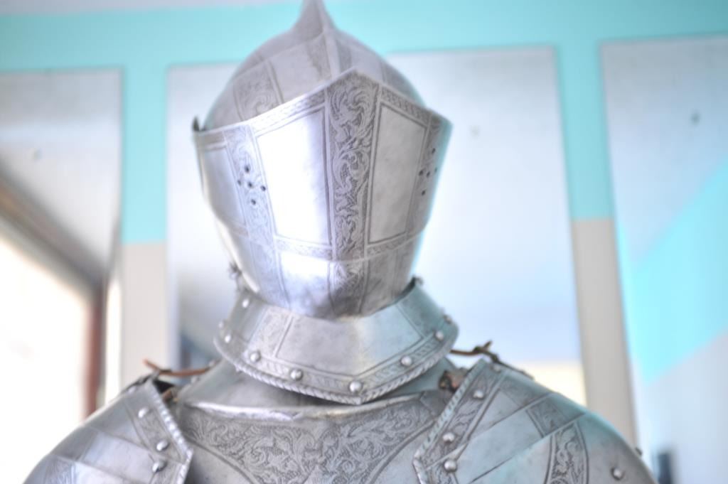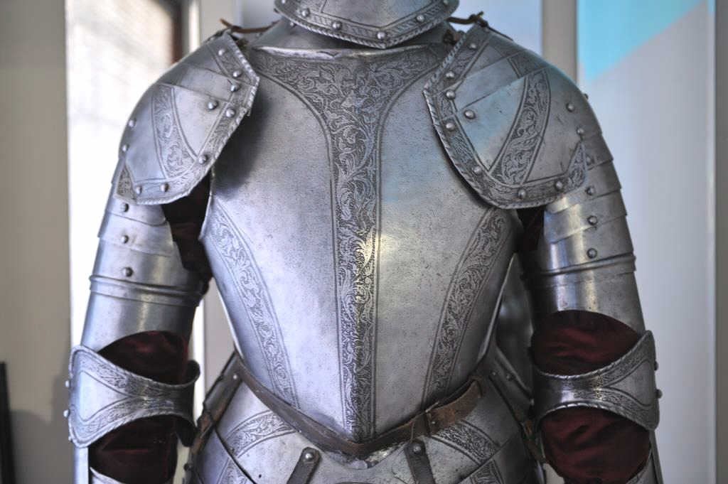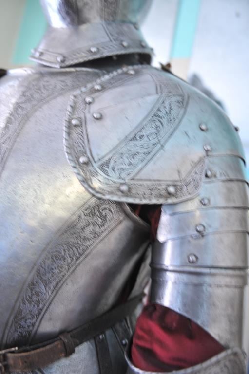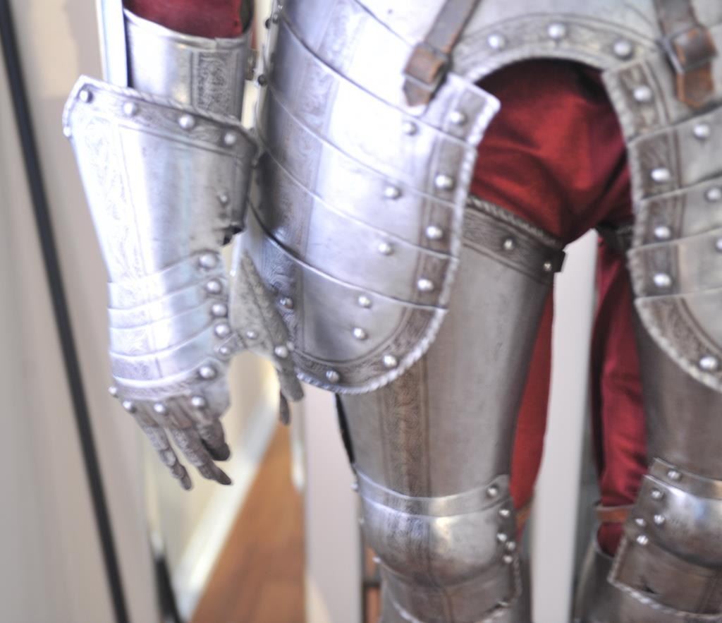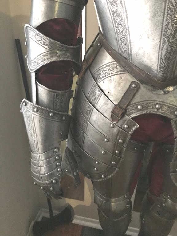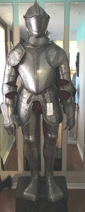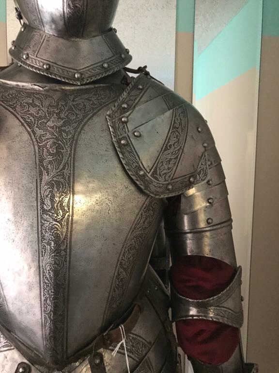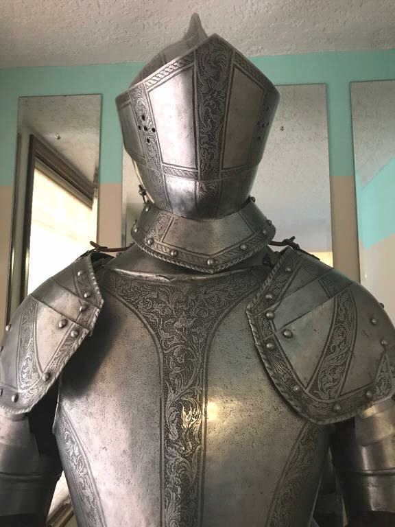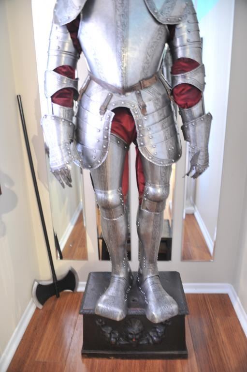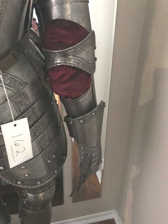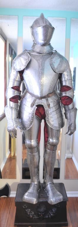 Finely articulated and etched antique suit of armor, Victorian or early 20th Century, probably English; approximately 78” in height including wood base. Est.: $2,500-$5,000.