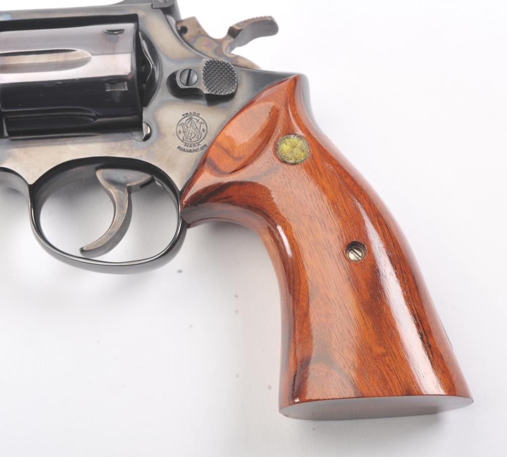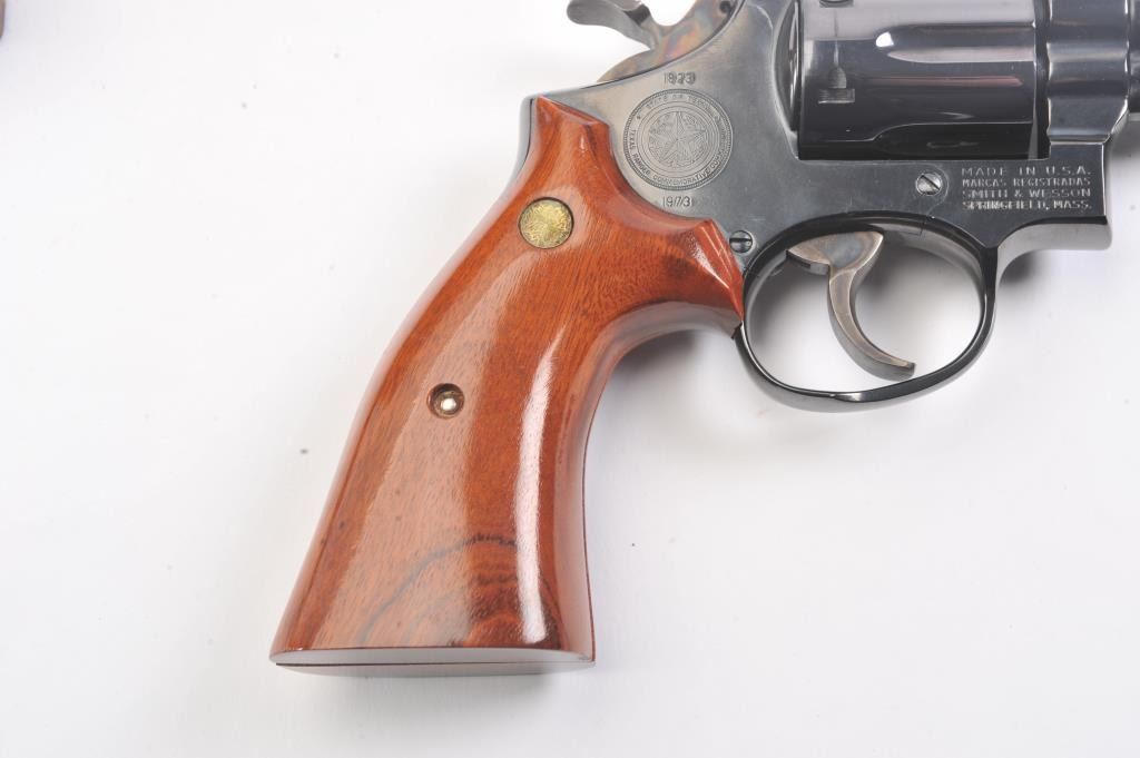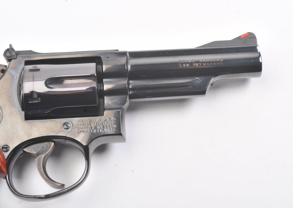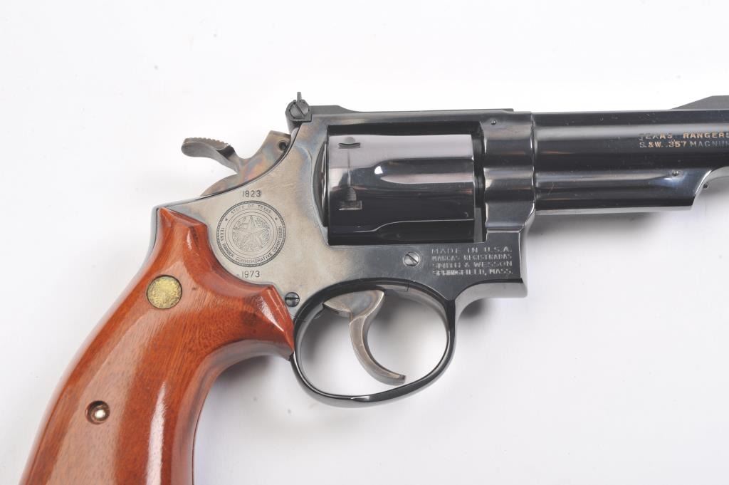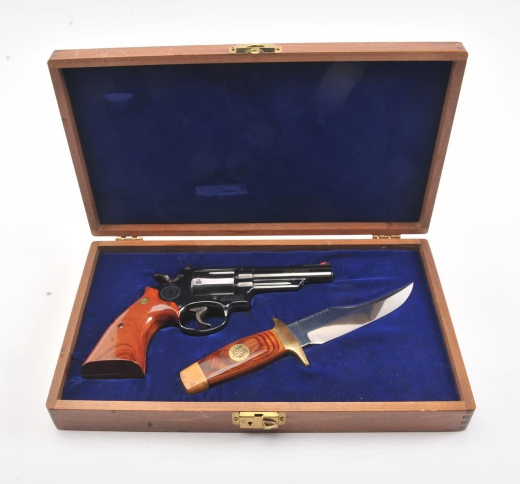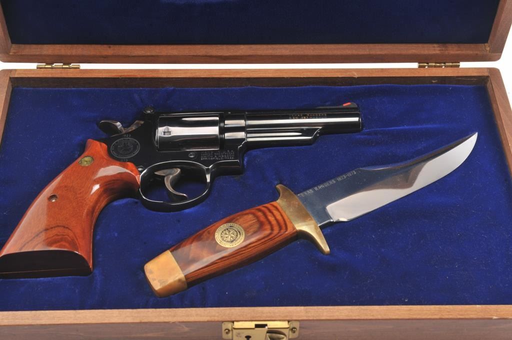 Smith & Wesson Model 19-3 .357 Mag revolver Special Texas Ranger Commemorative 1823-1973 cased with matching bowie knife and seal of the great and free state of Texas. The barrel measures 4" with white outline rear sight,red ramp front sight, and smooth medallion grips. Blue velveteen and stain lined case with Ranger emblem in lid. S/N TR16240. Very good plus used condition with 95%-98% original blue, minor index line and somefiring. The exterior of the case shows storage marks and handling wear. (Modern/PPT) Est.: $700-$1400