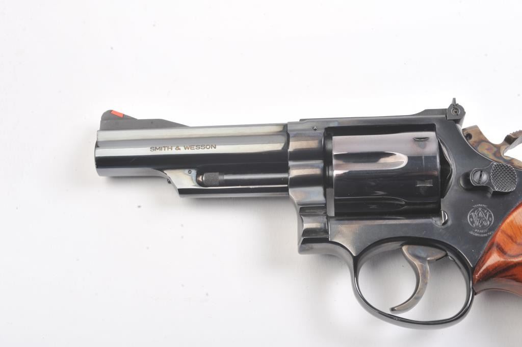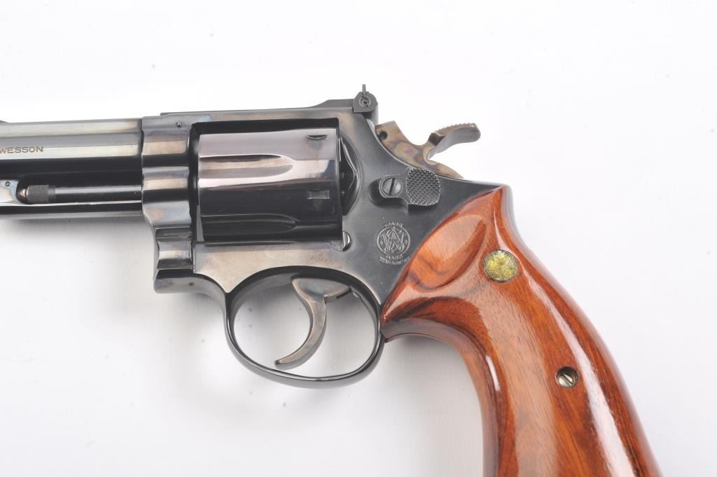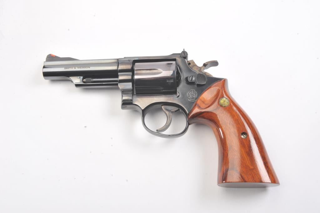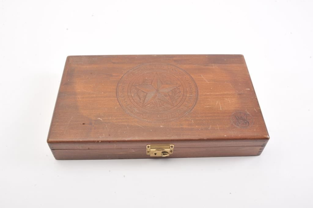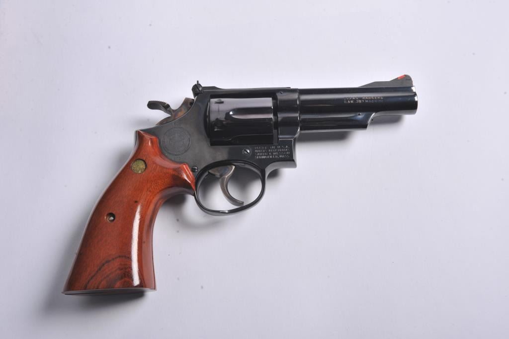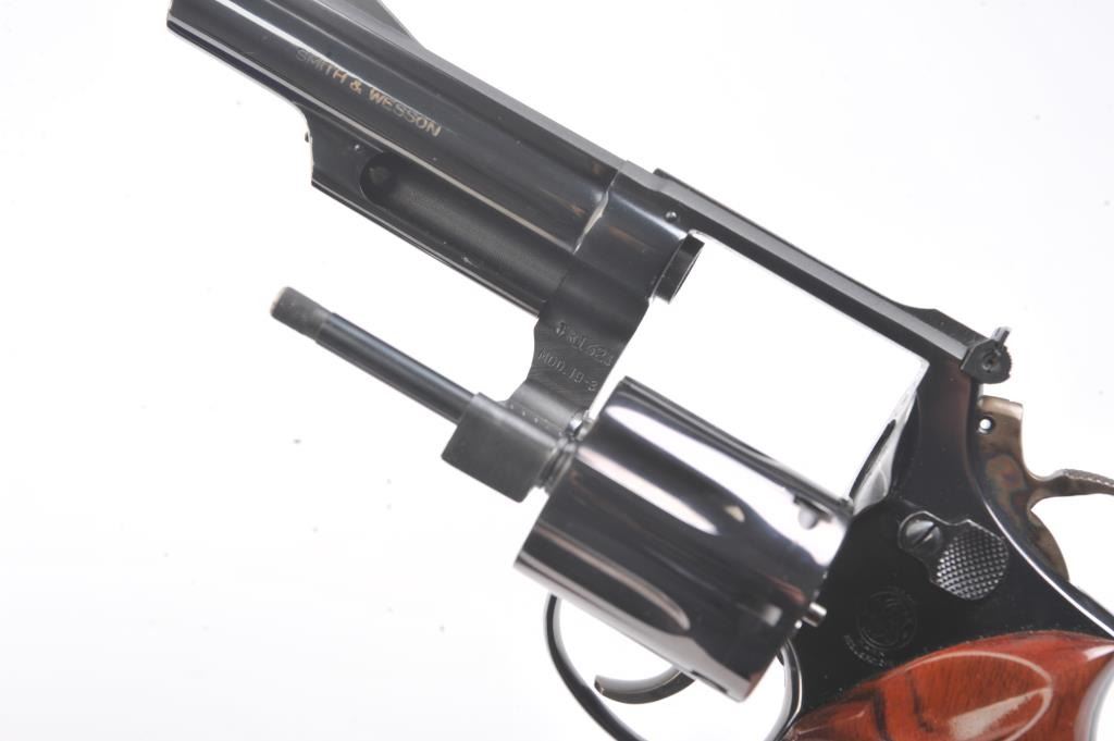 Smith & Wesson Model 19-3 .357 Mag revolver Special Texas Ranger Commemorative 1823-1973 cased with matching bowie knife and seal of the great and free state of Texas. The barrel measures 4" with white outline rear sight,red ramp front sight, and smooth medallion grips. Blue velveteen and stain lined case with Ranger emblem in lid. S/N TR16240. Very good plus used condition with 95%-98% original blue, minor index line and somefiring. The exterior of the case shows storage marks and handling wear. (Modern/PPT) Est.: $700-$1400