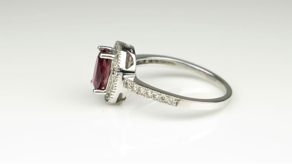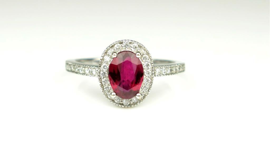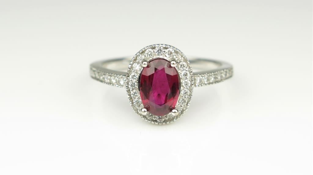 Vibrant Fine Natural Ruby and Diamond Ring featuring an approx. 1.60 carat oval cut blood Red Ruby accented by 34 ‘IDEAL’ cut Diamonds weighing approx. 0.50 carats of F-G colors and VS clarity set in classic 14 karat white gold setting. Retail $6,000-$8,000 Estimates 2,000-$3,000