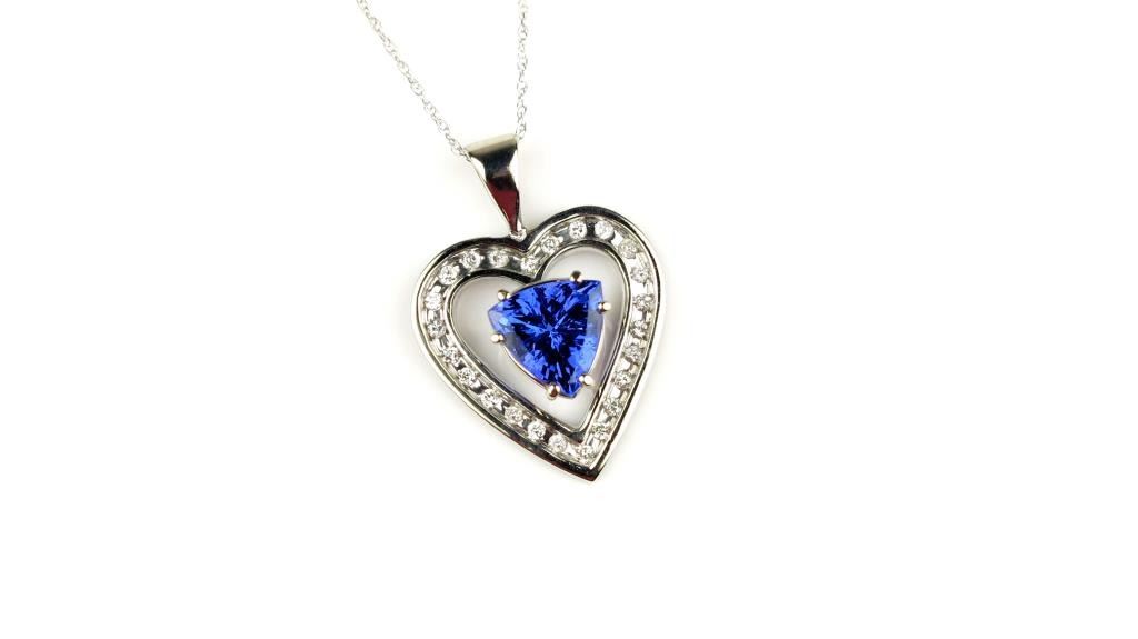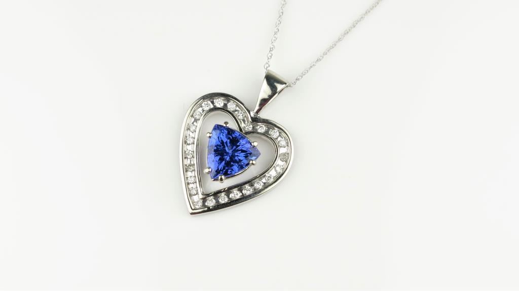 Irresistible Tanzanite and Diamond Pendant featuring a 2.30 carat Trilliant cut Tanzanite with exceptional color accented with 24 round channel set Diamonds crafted in 10 karat white gold setting. Retail$3,000-$4,000 Estimates $1,500-$2,000
